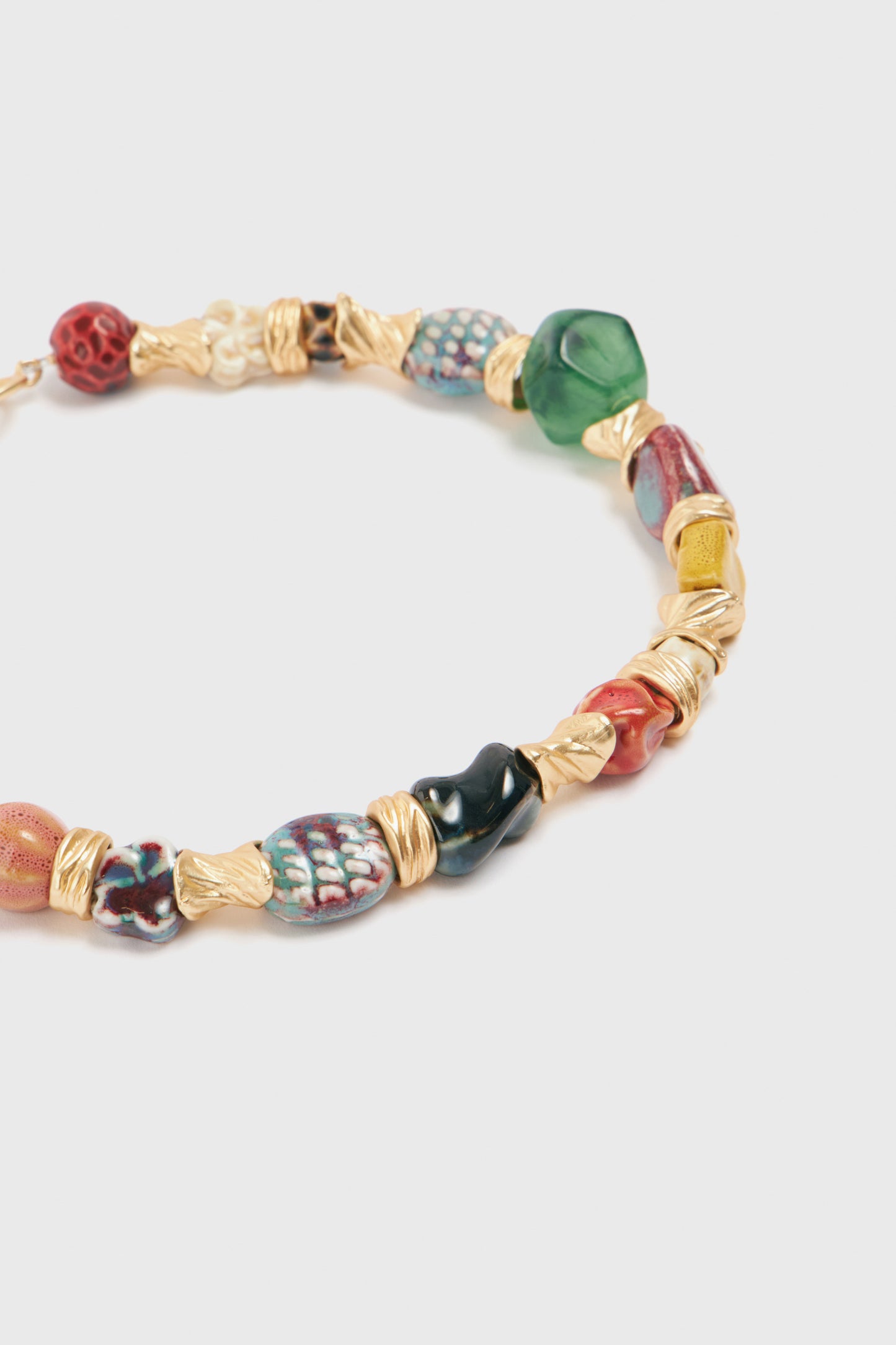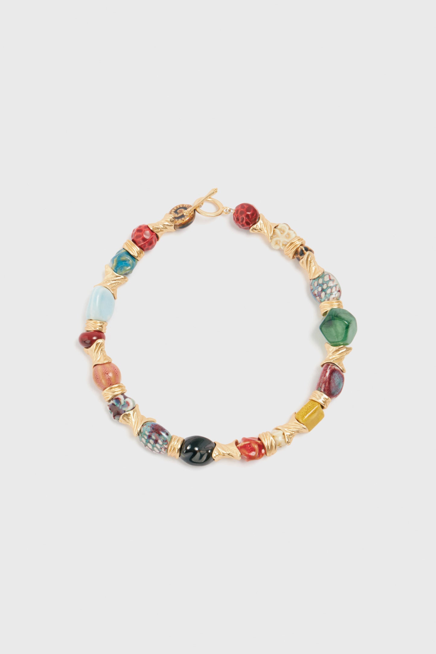 Short necklace with chunky beads in various designs. Elements of natural agates and gold-tone inserts. Toggle clasp at the back. ONE SIZE: 41 cm