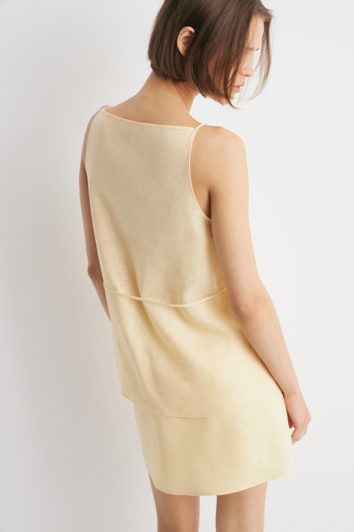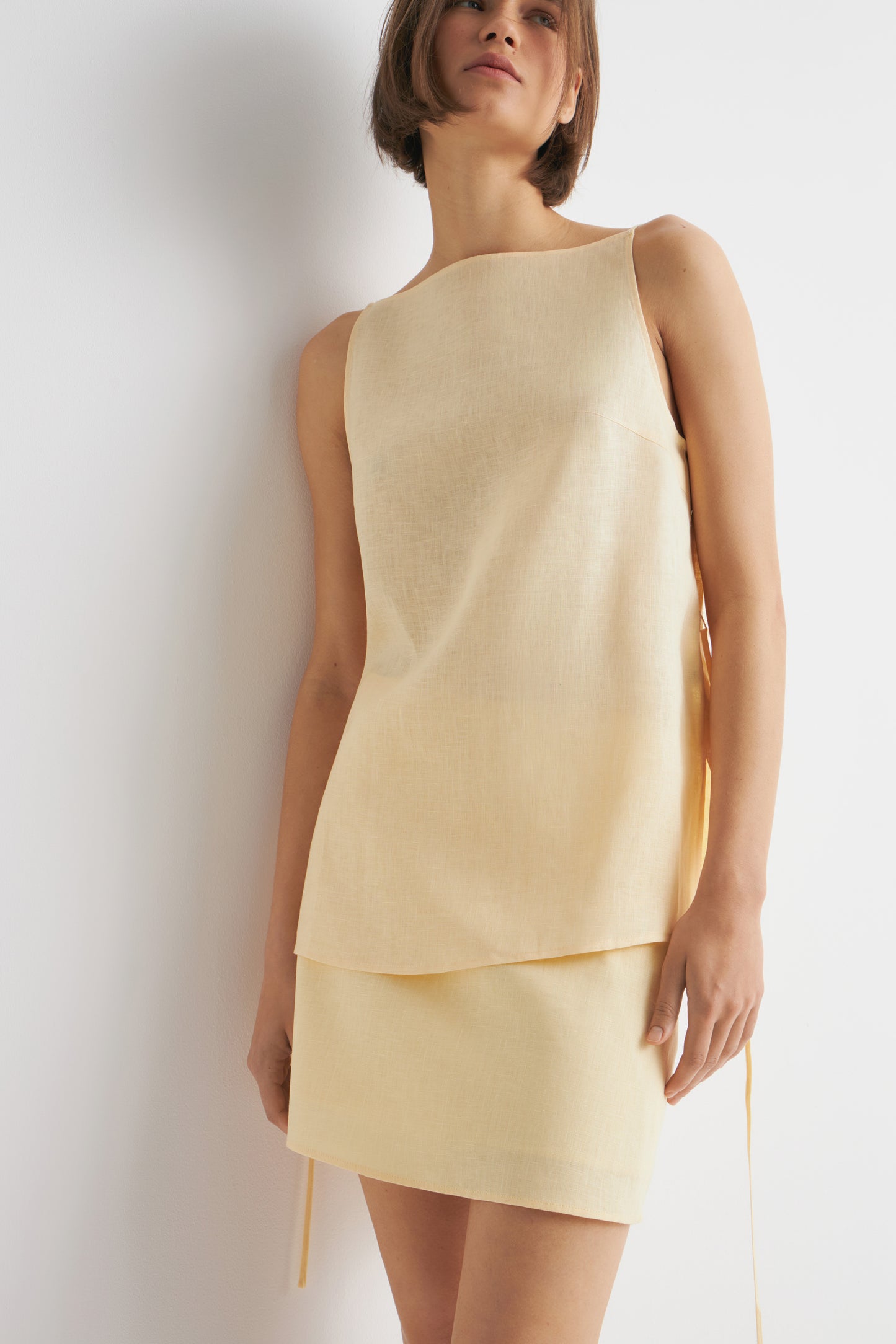 Fitted top with a boat neckline, side slits and thin belt. It's crafted from 100% linen.