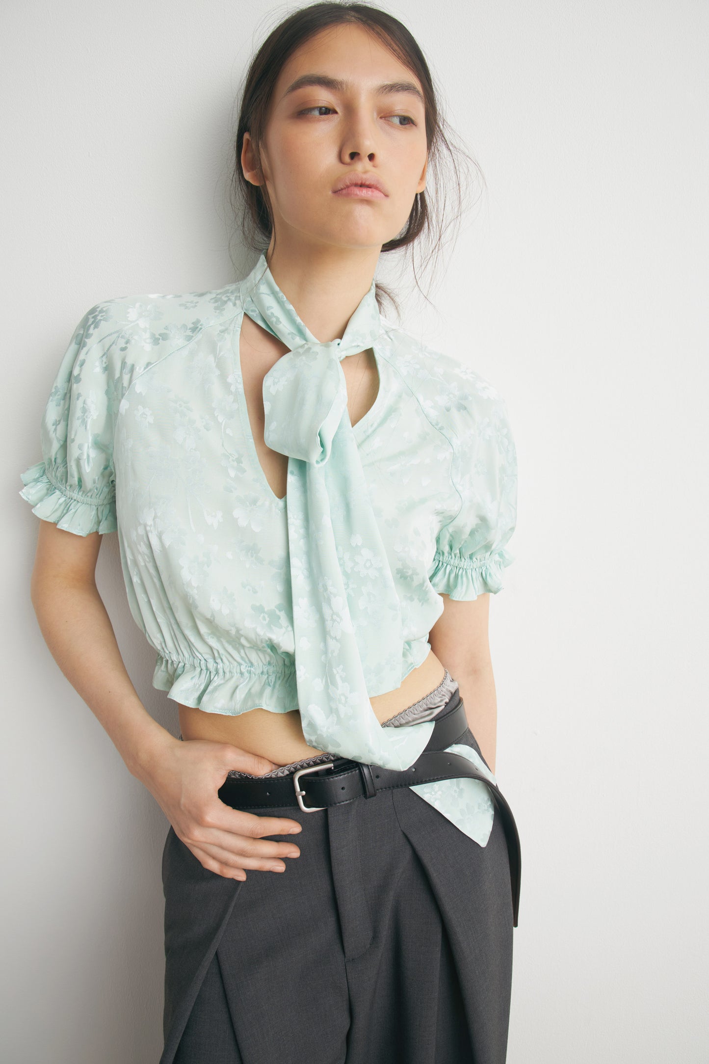 Cropped blouse in a soft satin viscose with large ribbons on the front. Puff sleeves. Elasticated cuffs and hem.