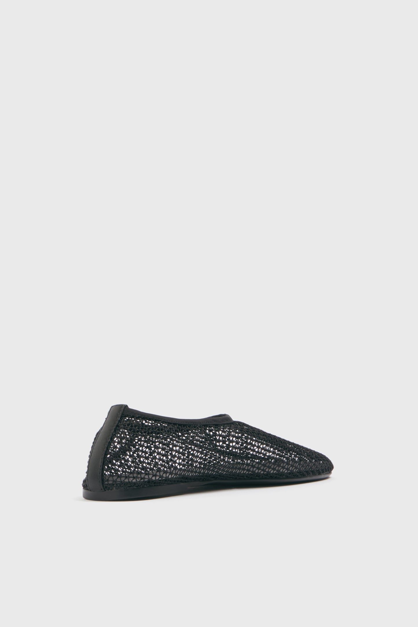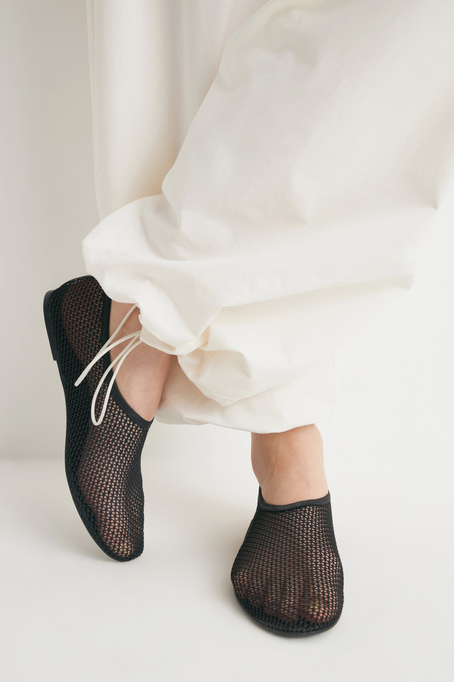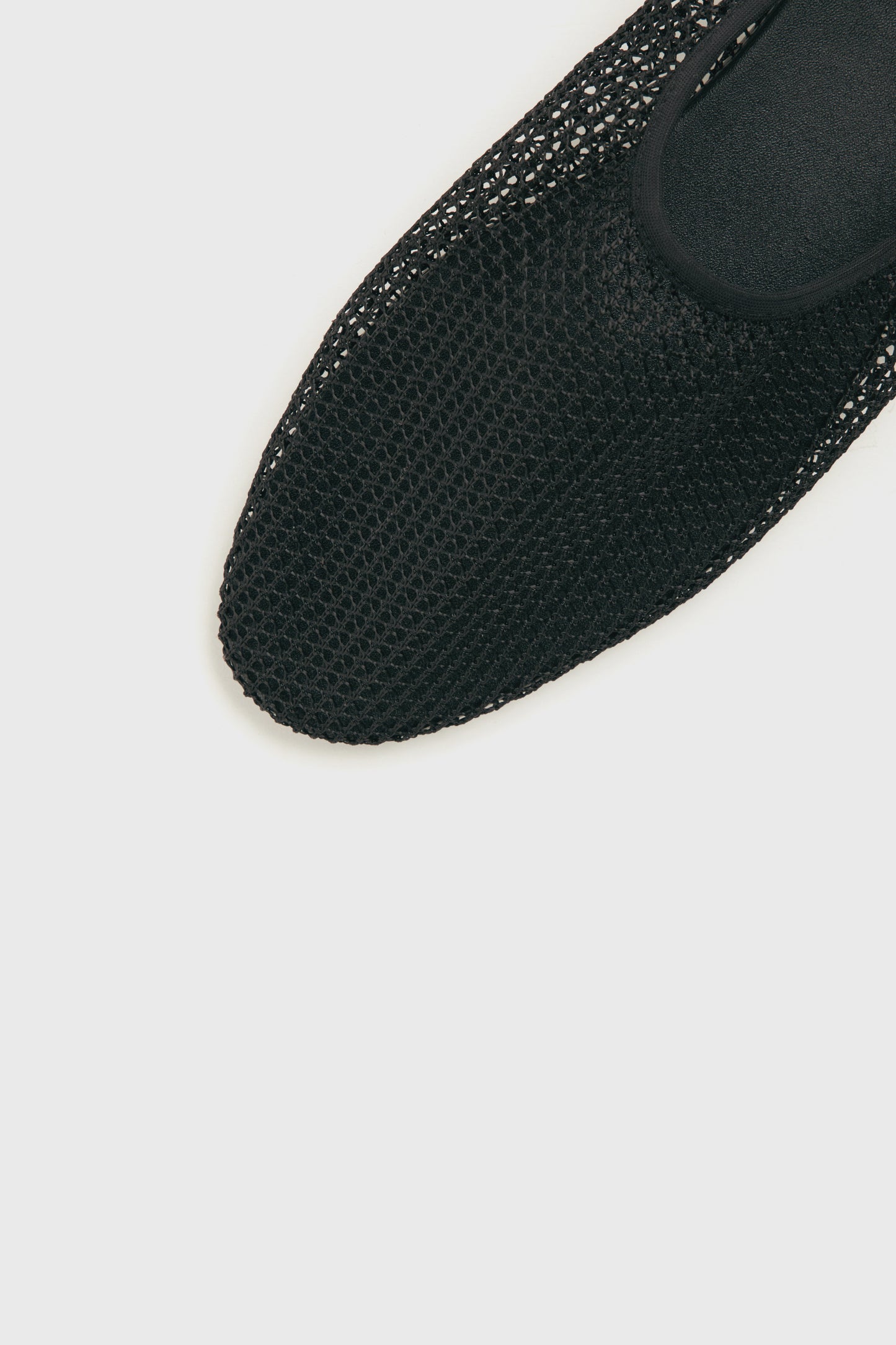 Ballet shoes with rounded toes. It's braided from strips of recycled fabric that form an enlarged checked pattern. Leather insoles. Your purchases are delivered with a fabric bag.