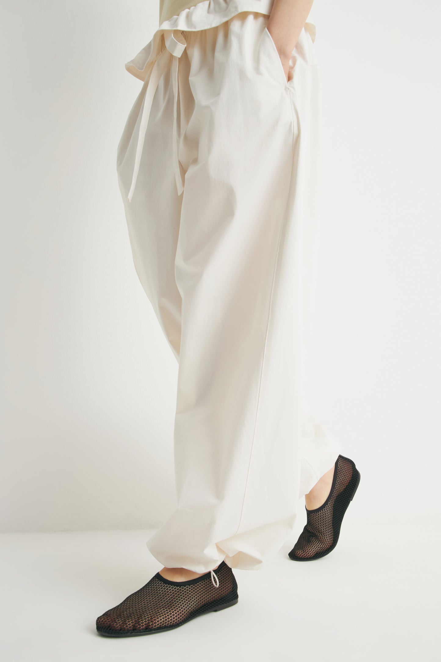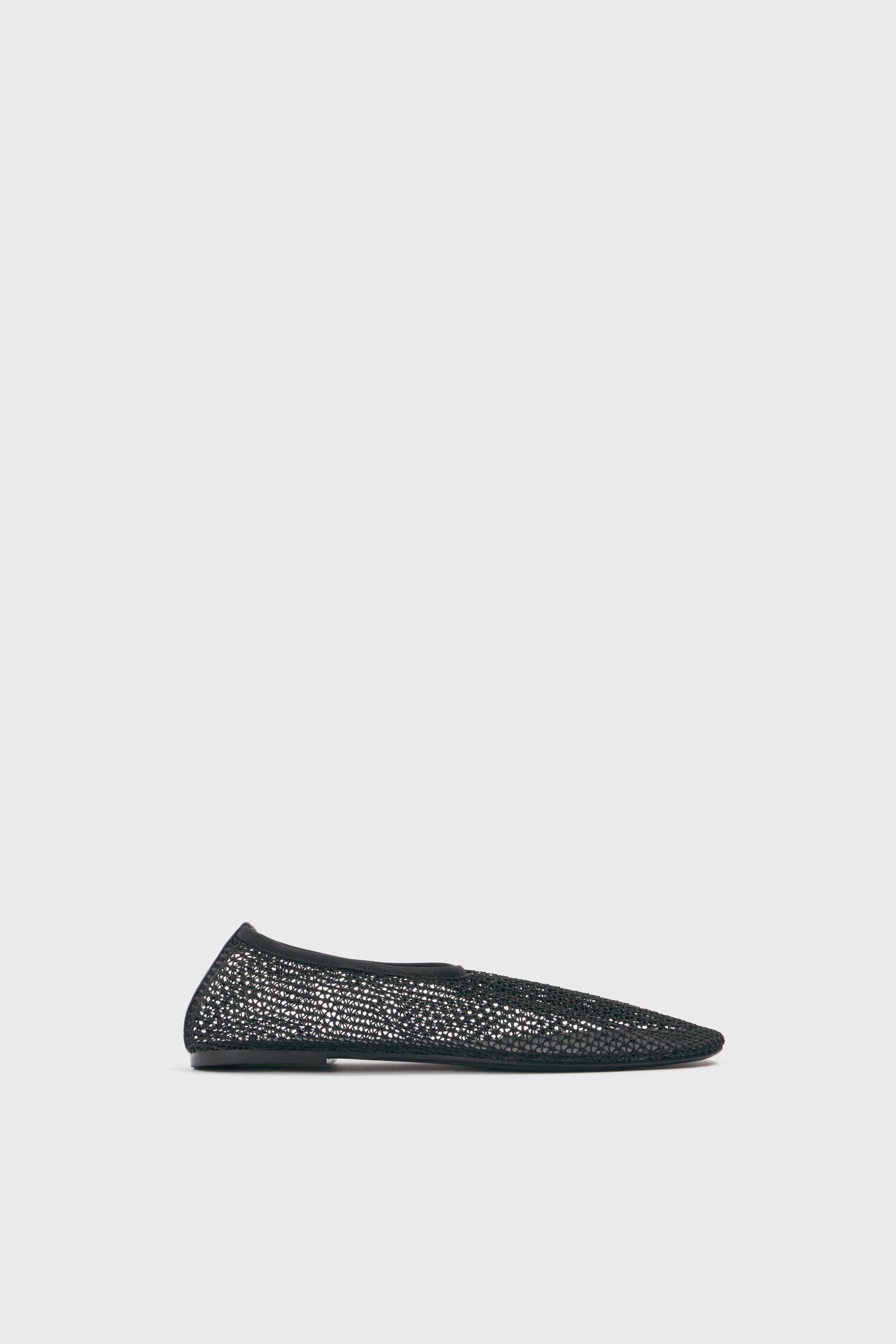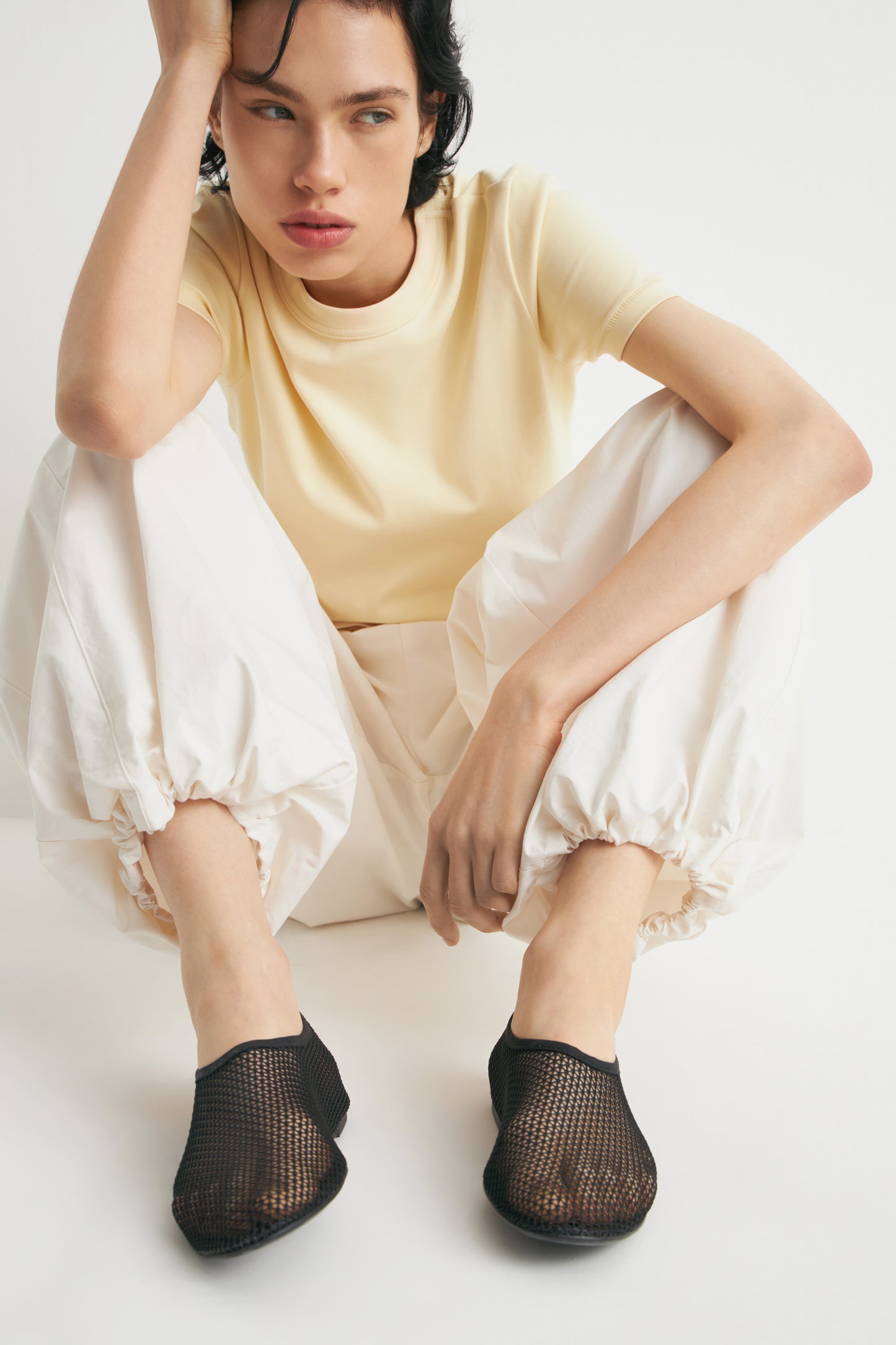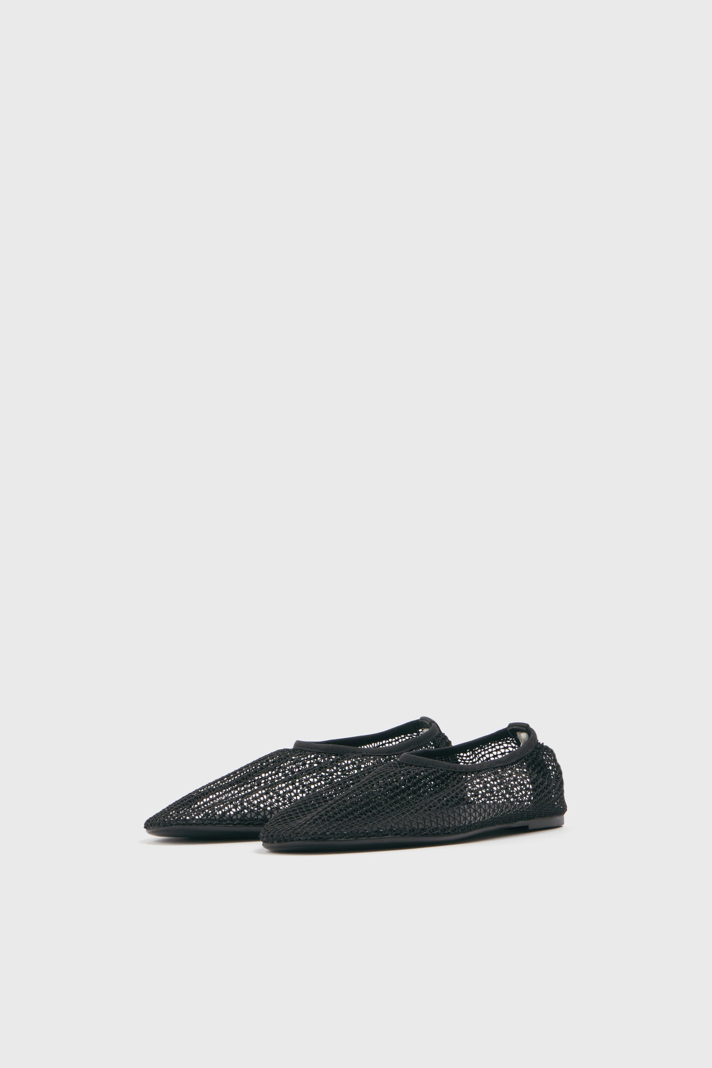 Ballet shoes with rounded toes. It's braided from strips of recycled fabric that form an enlarged checked pattern. Leather insoles. Your purchases are delivered with a fabric bag.