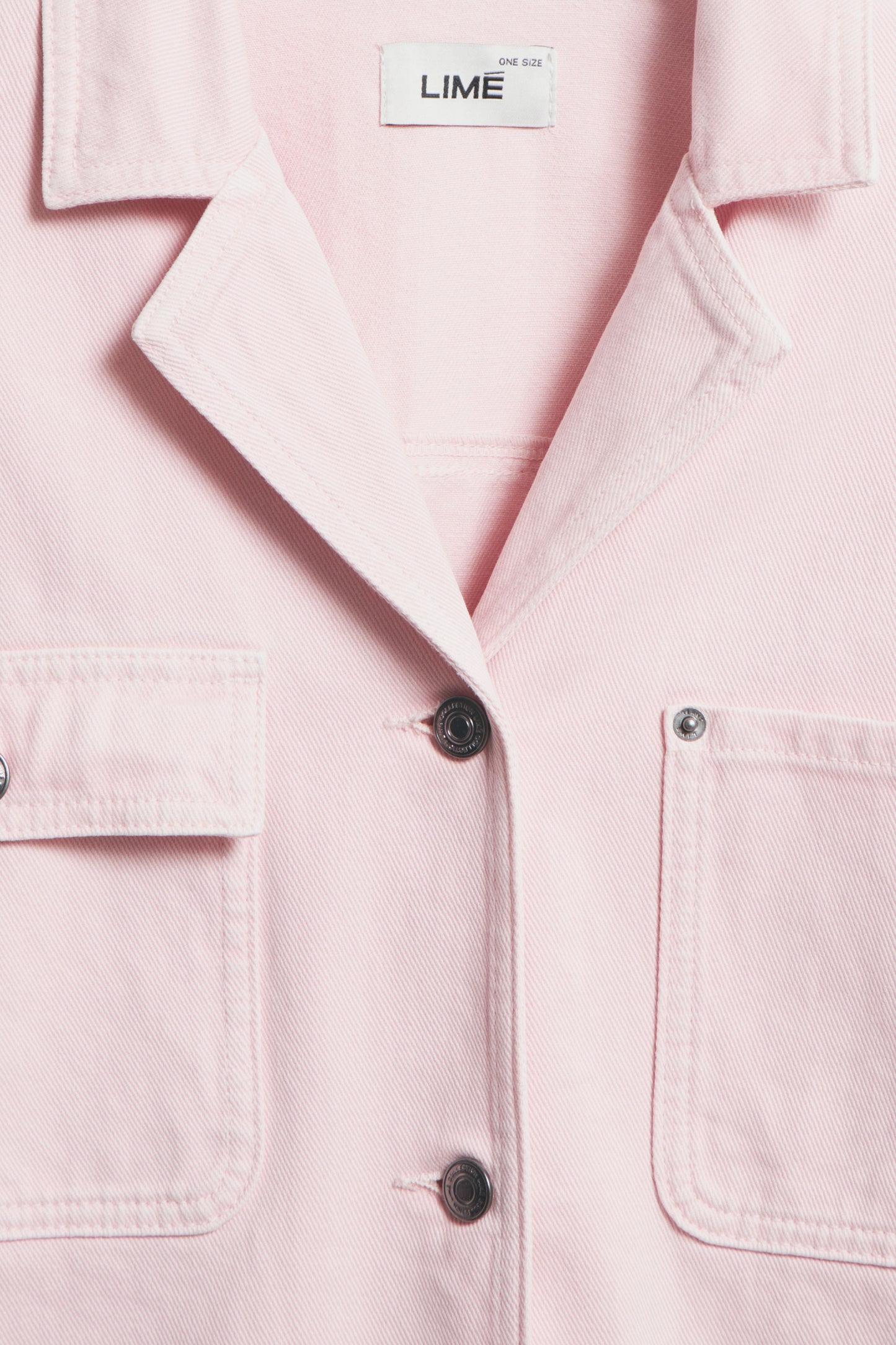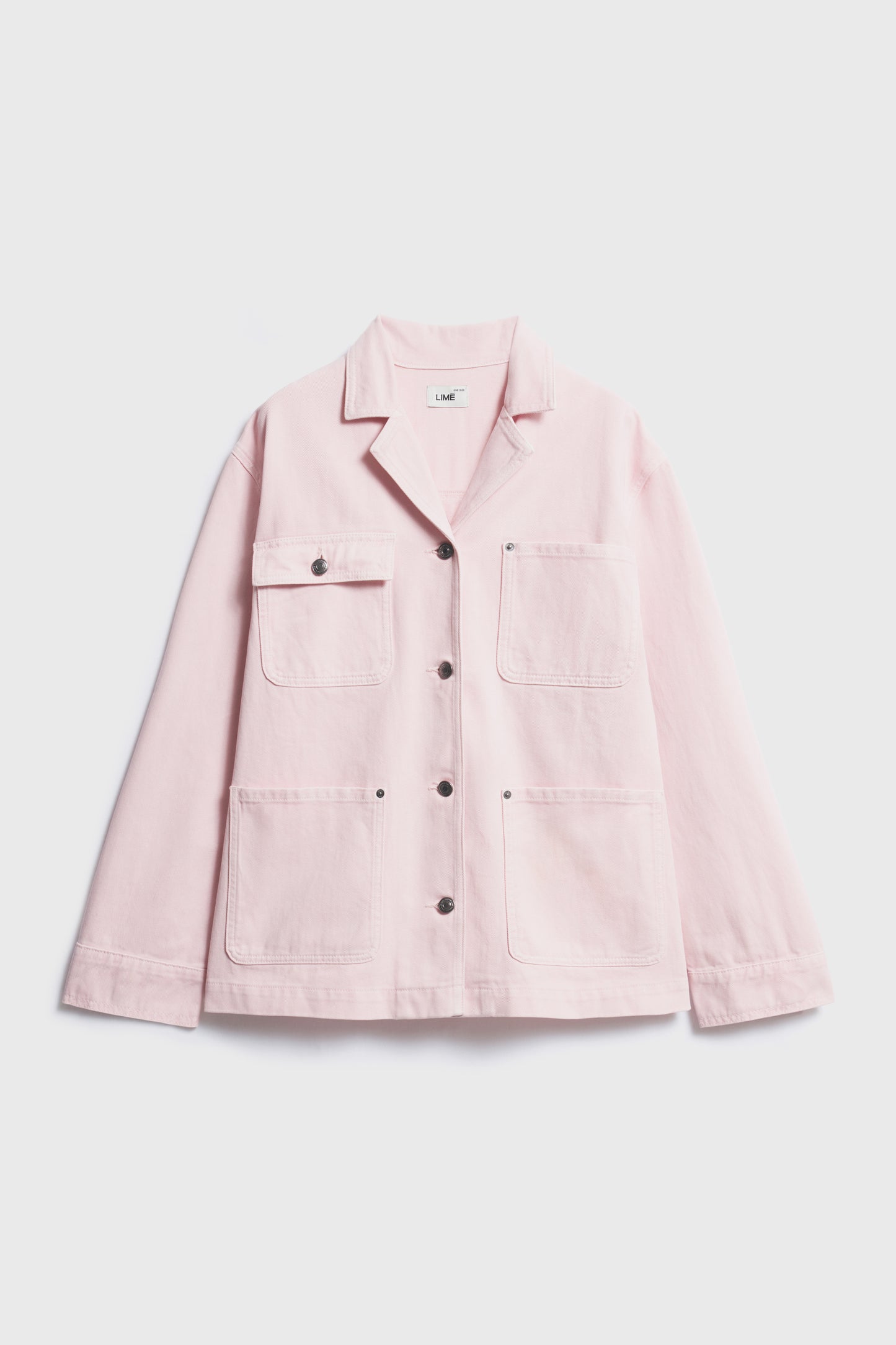 Oversized jacket in a cotton denim with patch pockets in a cargo style. Features a collar, long sleeves and metal button front.