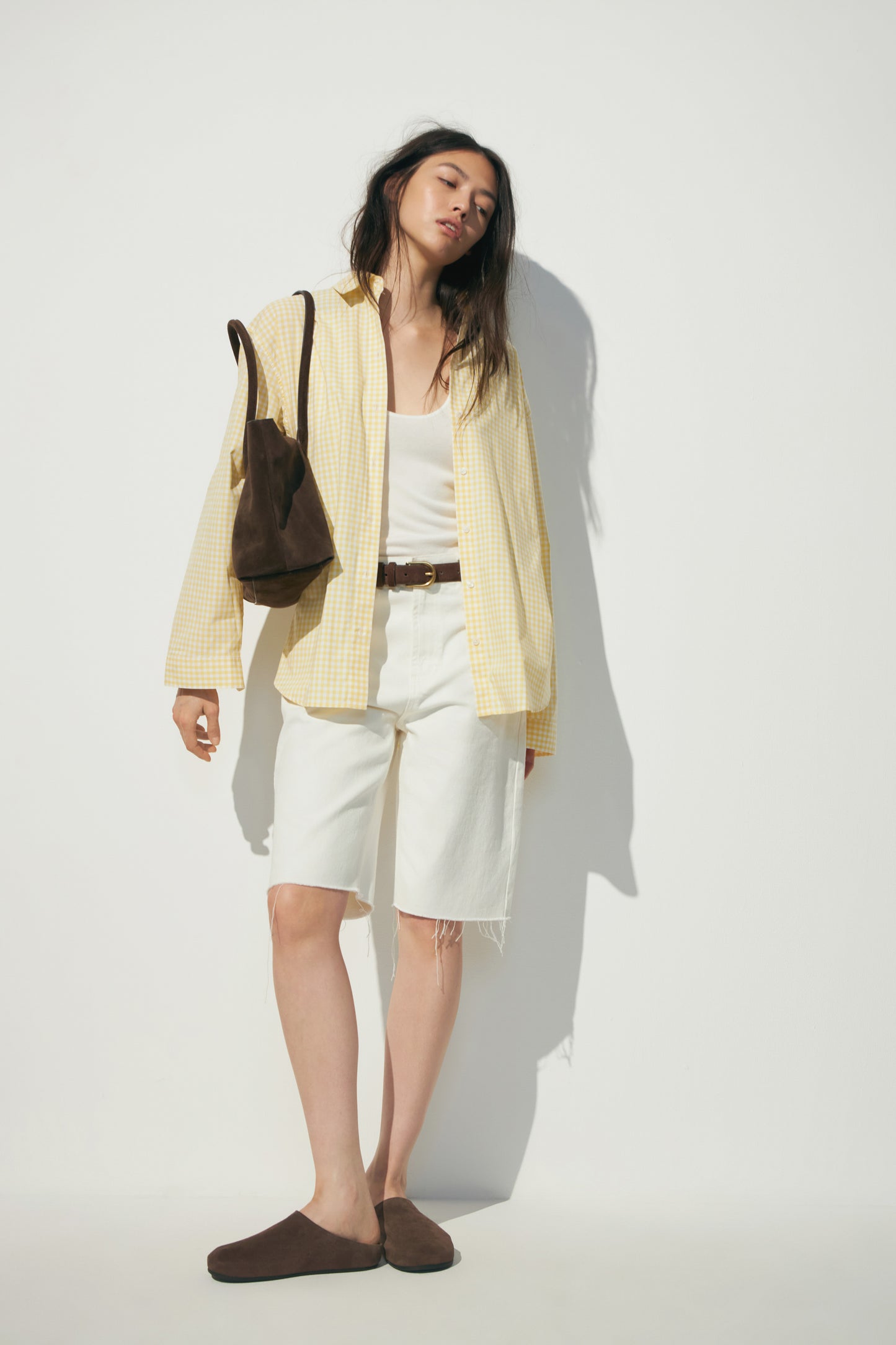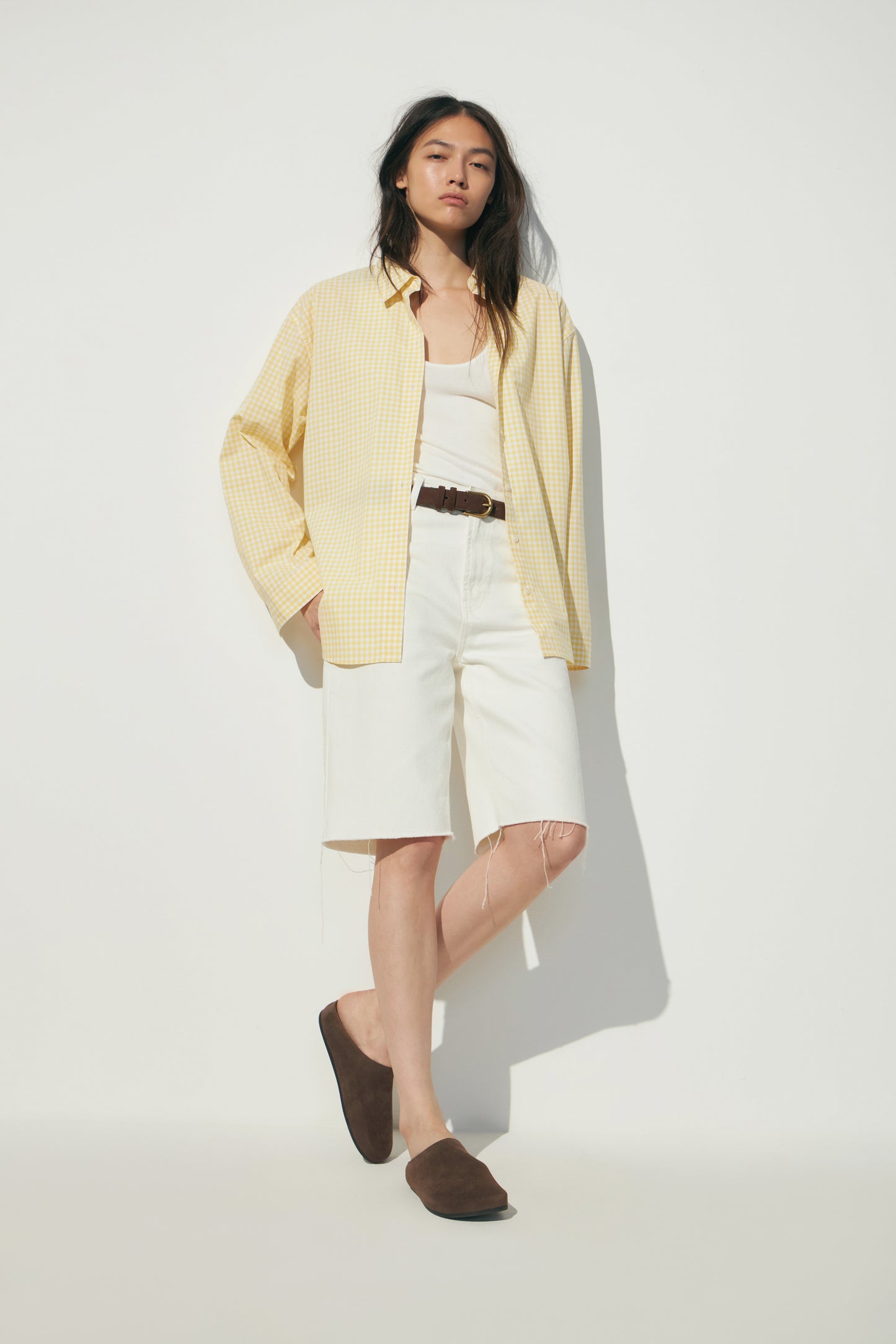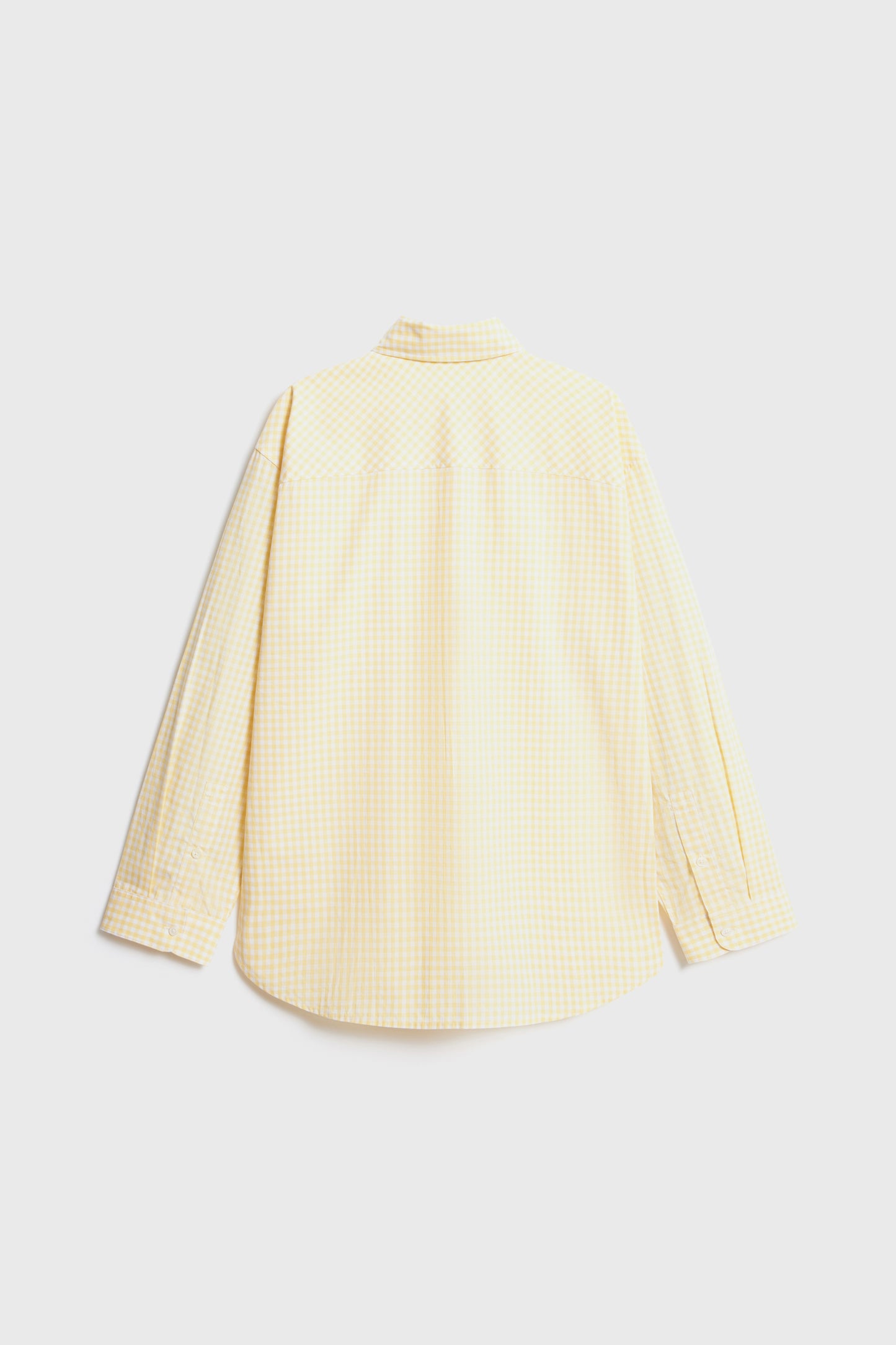Collared shirt in cotton with a check pattern. Button front and long sleeves with adjustable buttoning at the cuffs. Rounded hem.