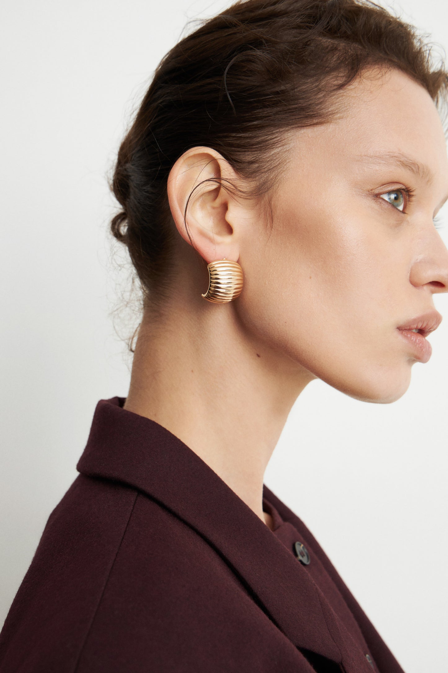 Chunky textured earrings in gold-tone brass. Sculpted in ribbed semicircle shape inspired by vintage style. Push-back closure.
