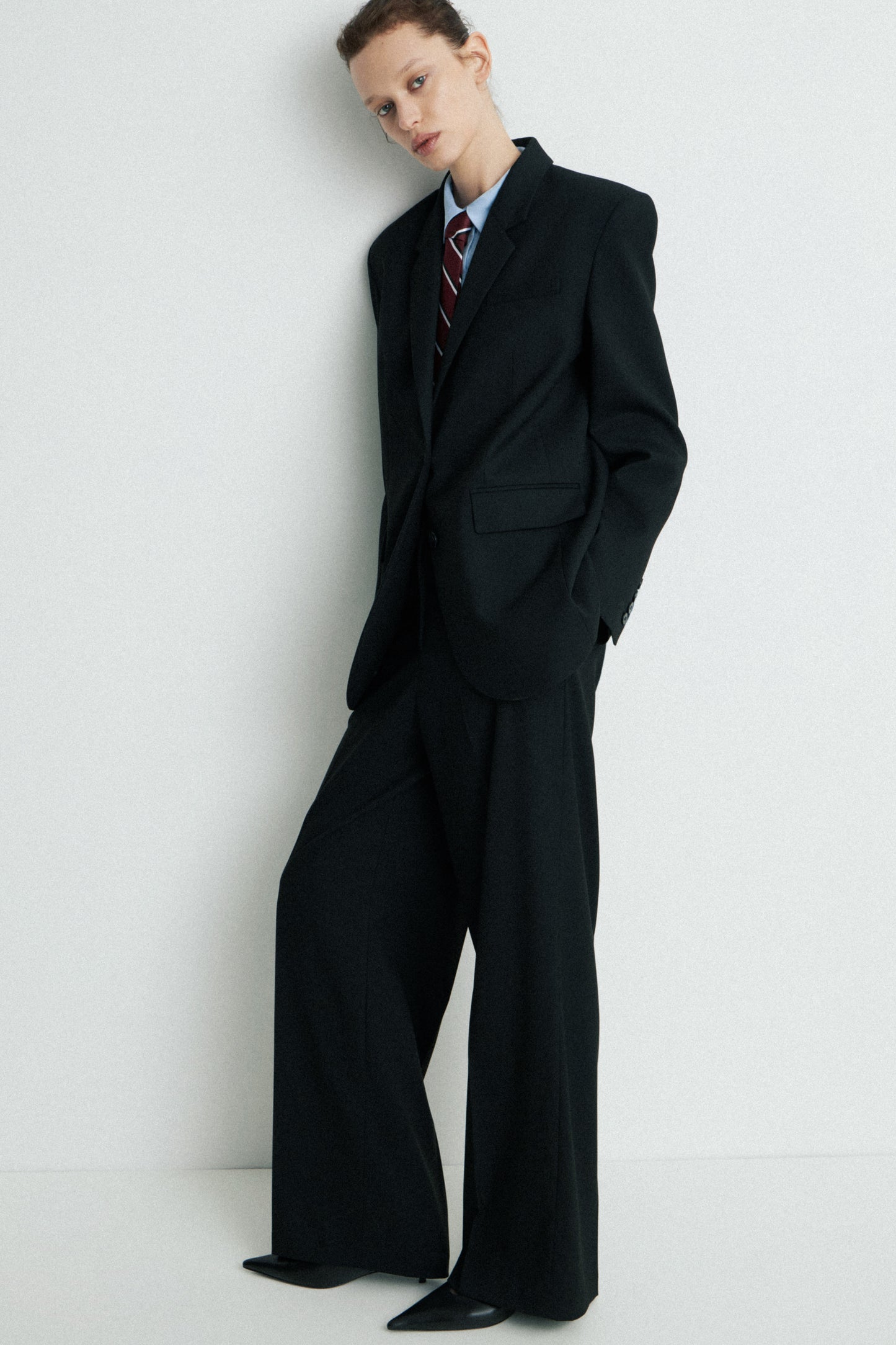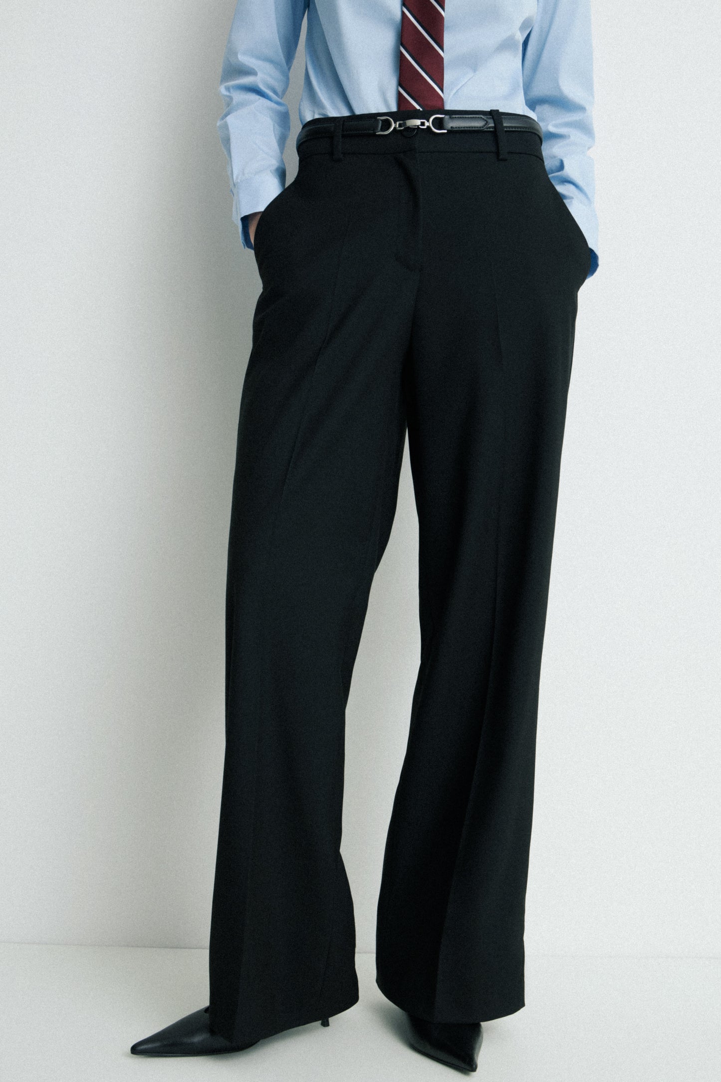 Trousers with discreet side pockets, fake back pocket and straight legs with creases. Features an elasticated detail at back. Zip, inside button and metal hook fastening at the front.