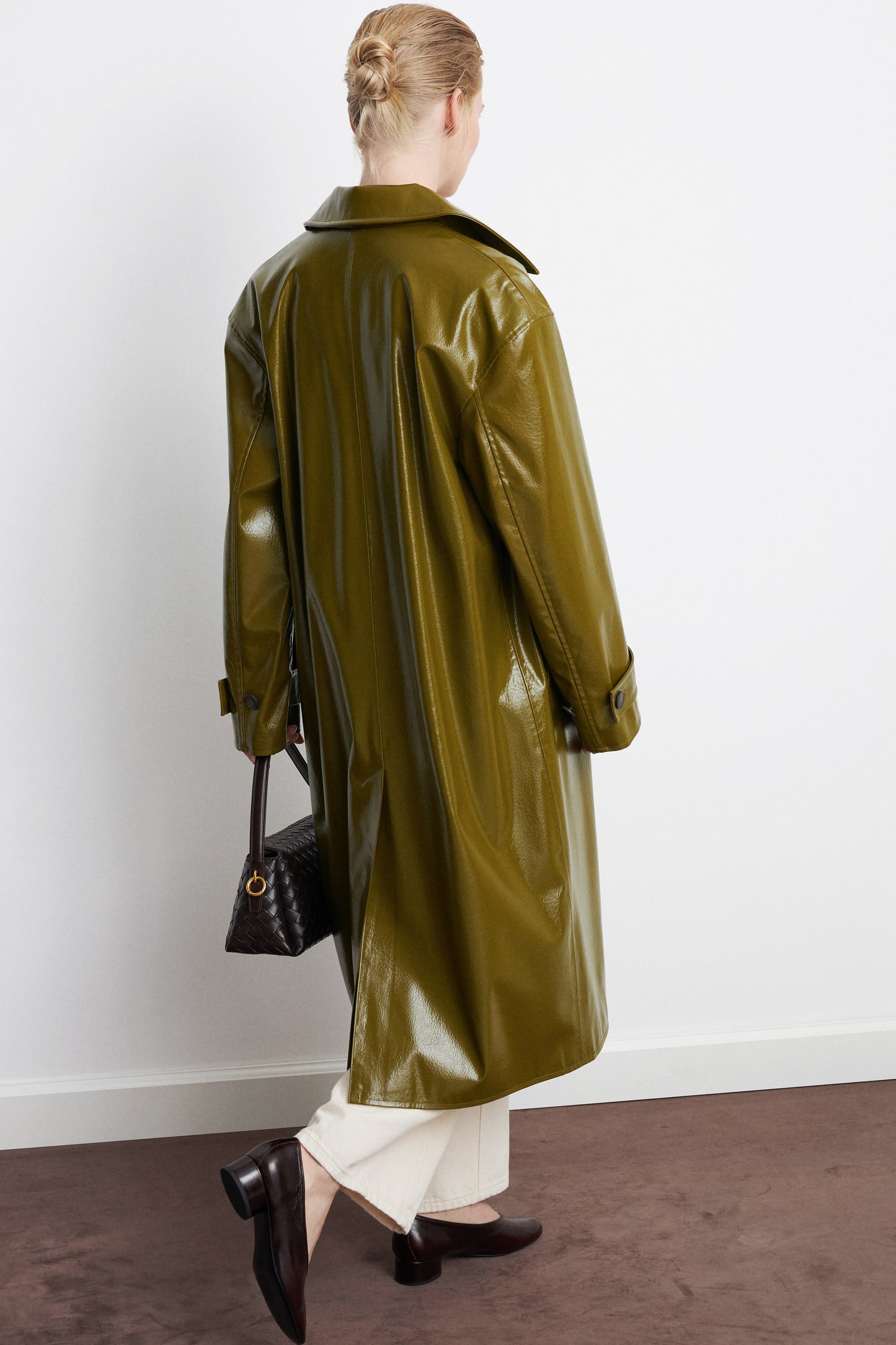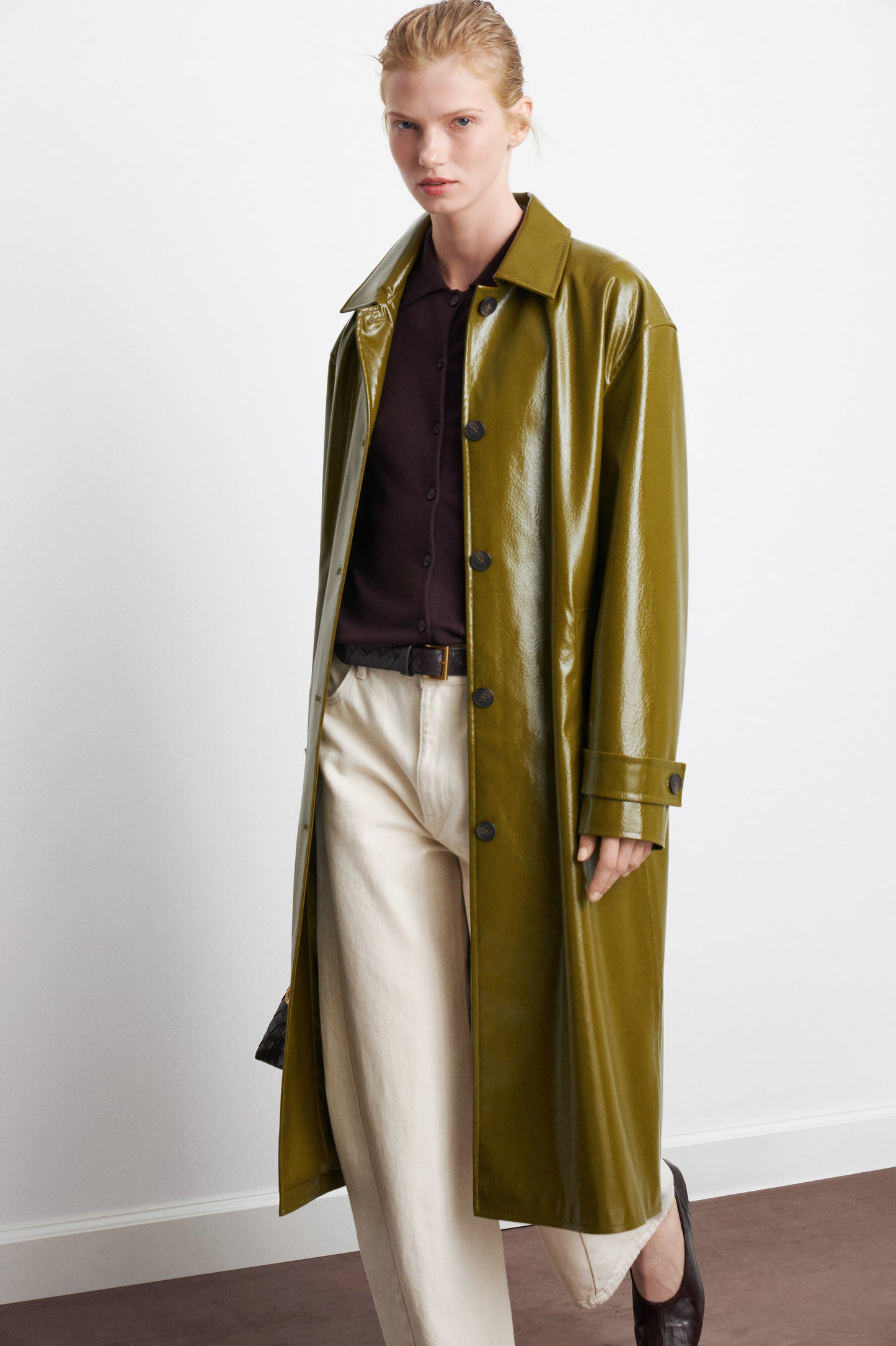 Straight-fit, long raincoat in coated fabric. Collar, long sleeves, and adjustable tab at cuffs, front pockets and button fasteners at front. Lined.