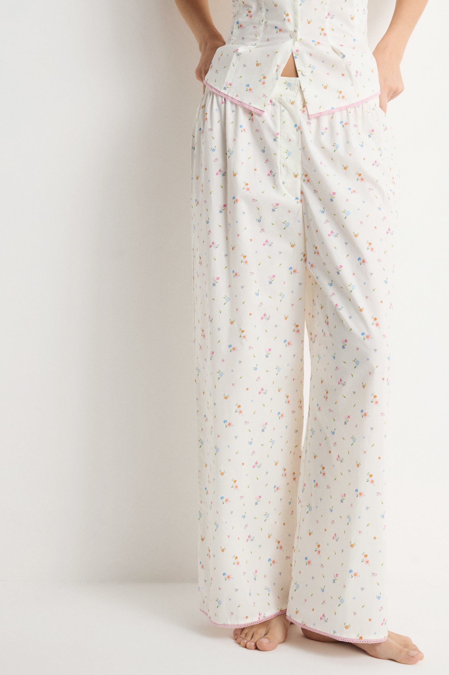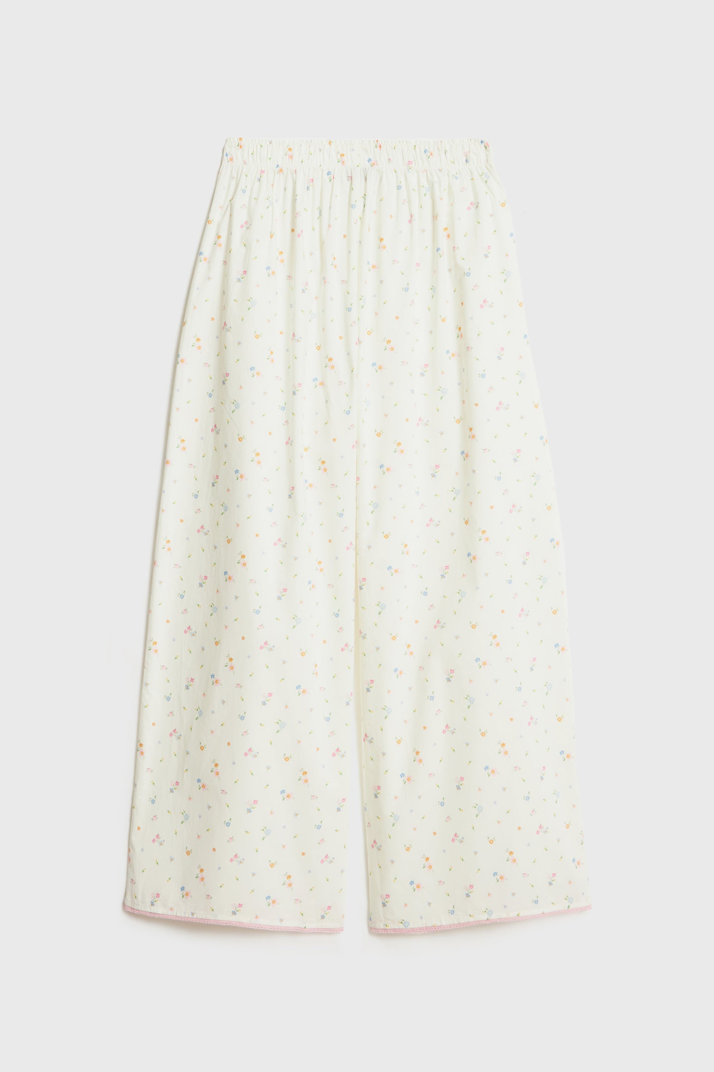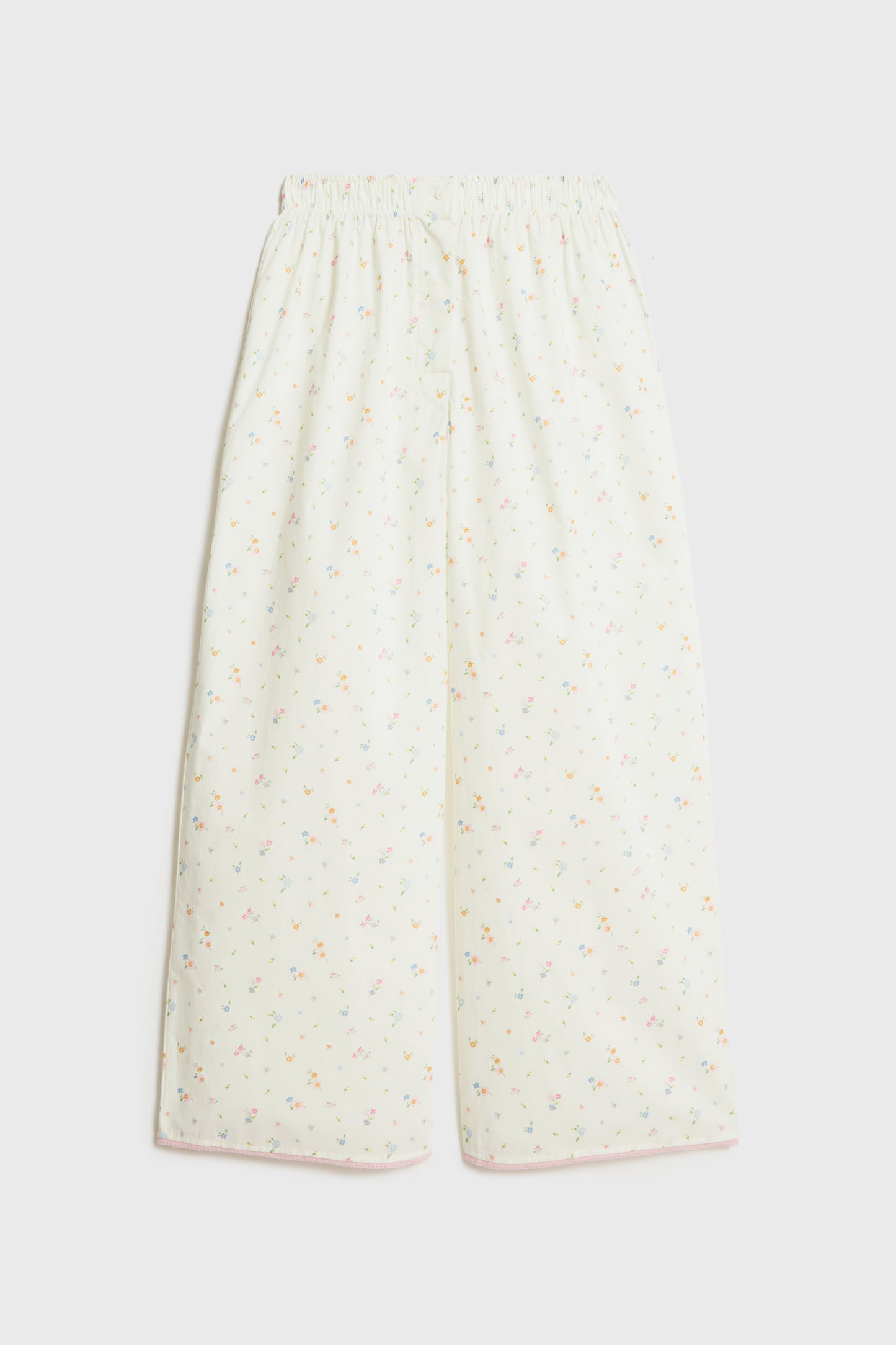 Trousers in cotton with lace. Straight legs. Covered elastication with button. Fake front fly.