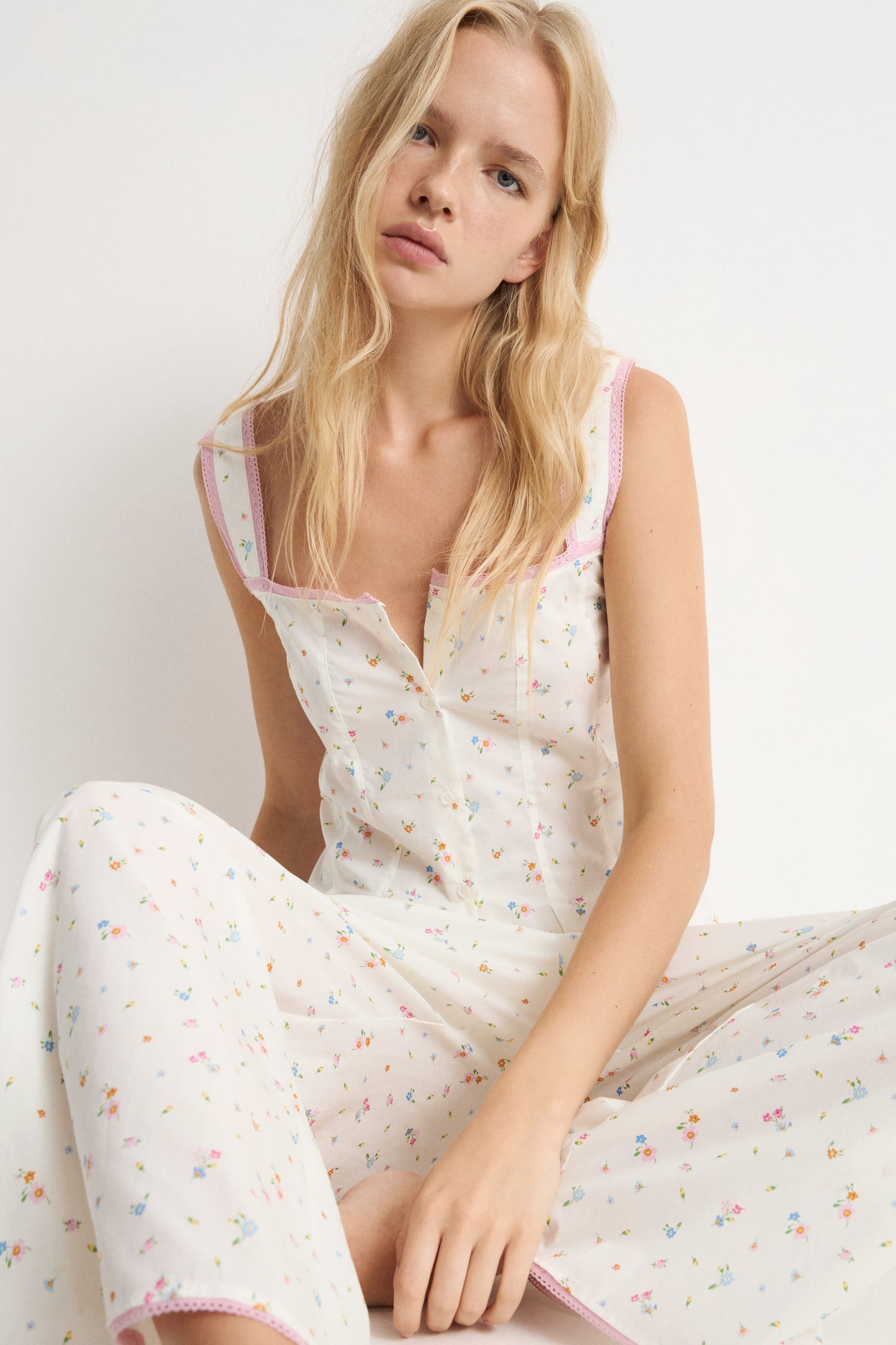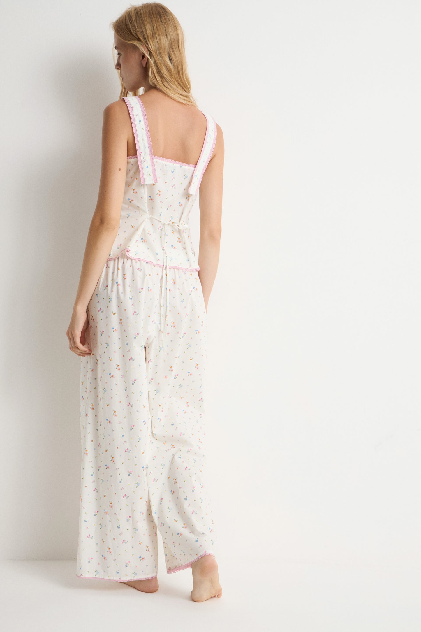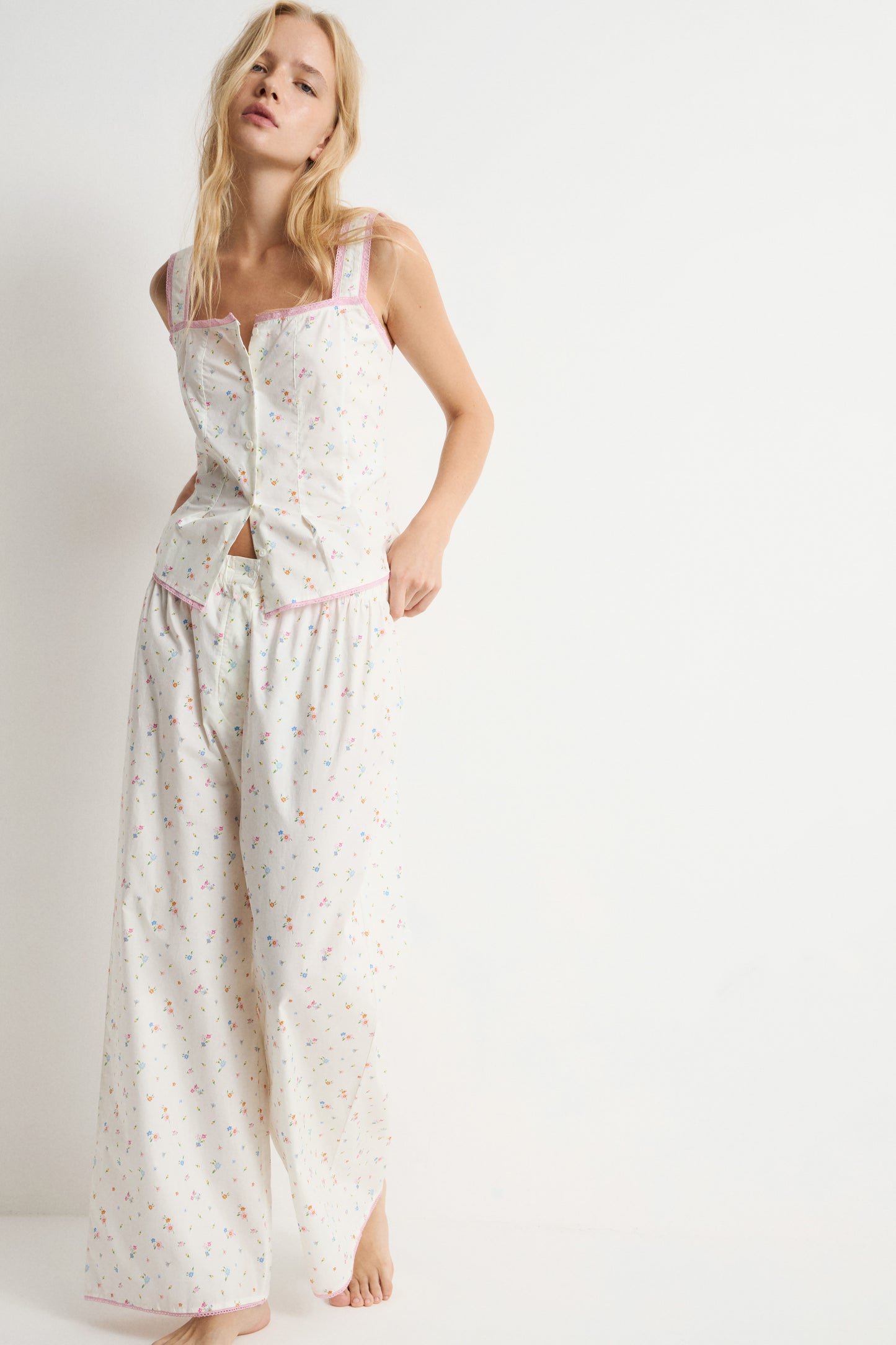 Trousers in cotton with lace. Straight legs. Covered elastication with button. Fake front fly.