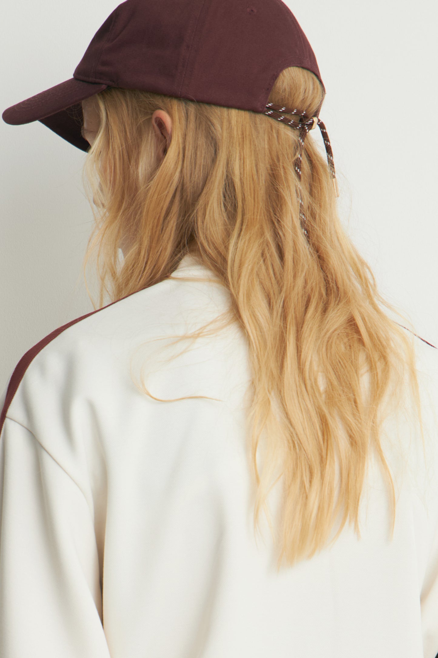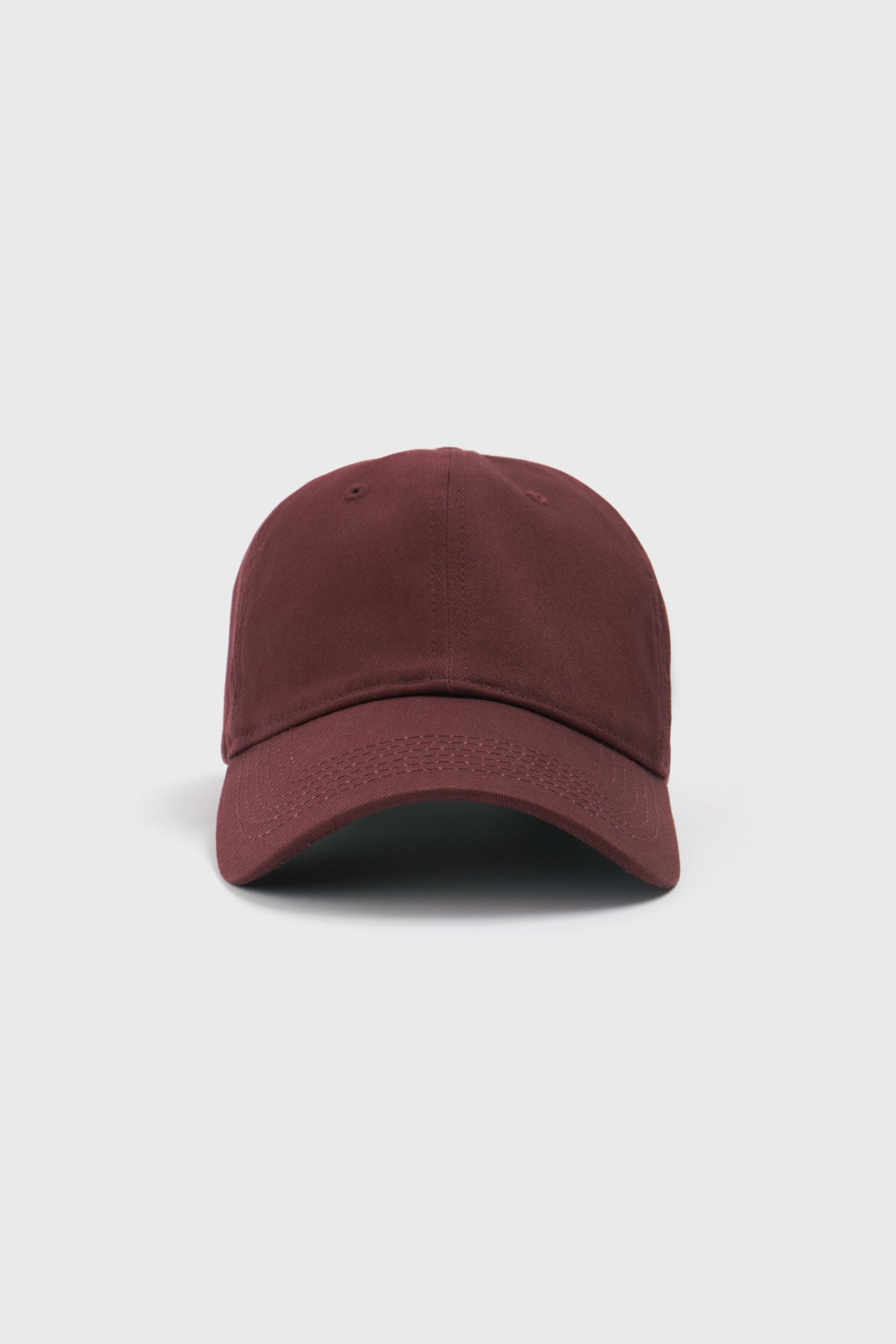Baseball cap made from high-quality cotton. Embroidered eyelets at top. Adjustable tab at back with metal fastener.