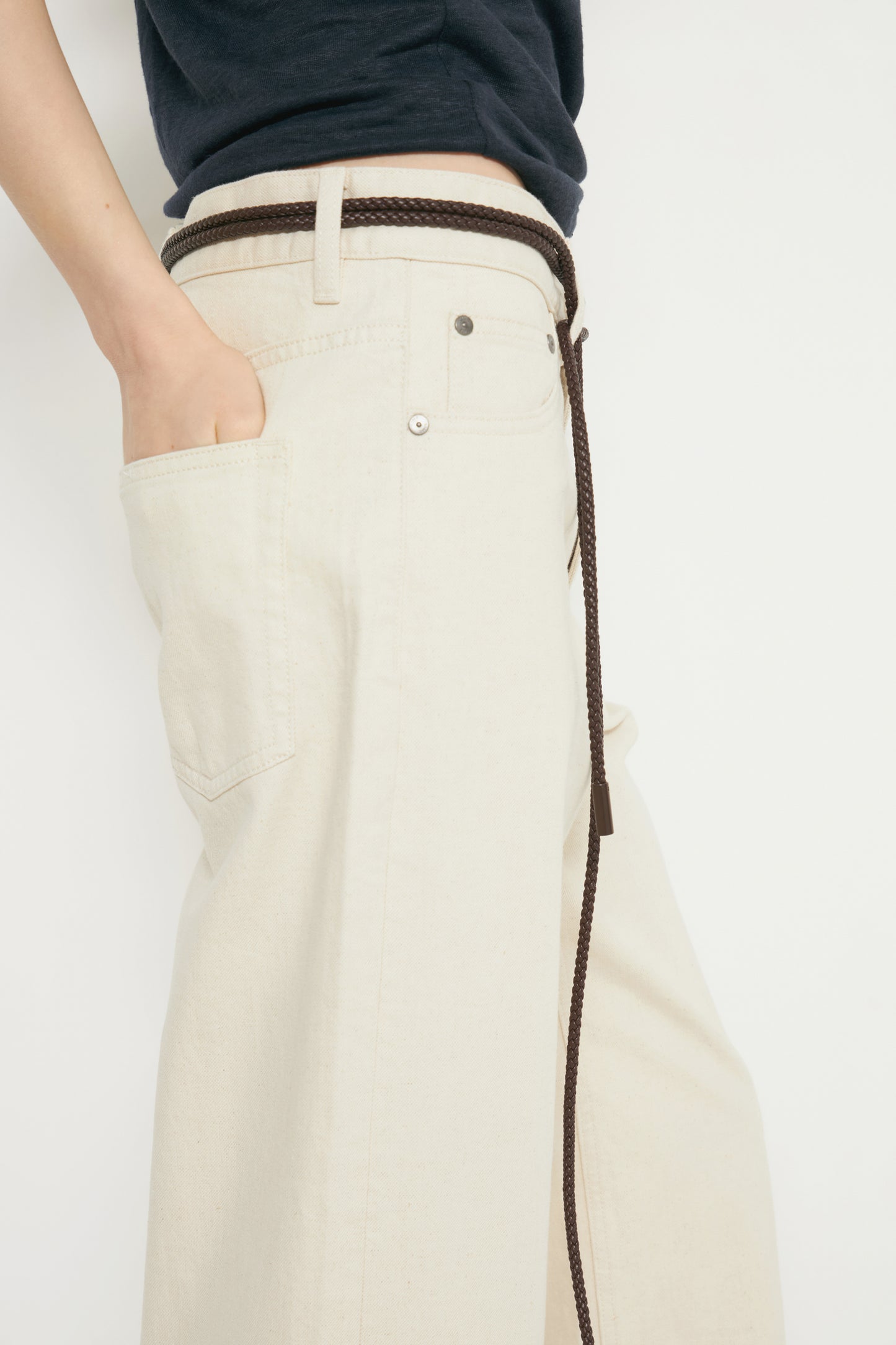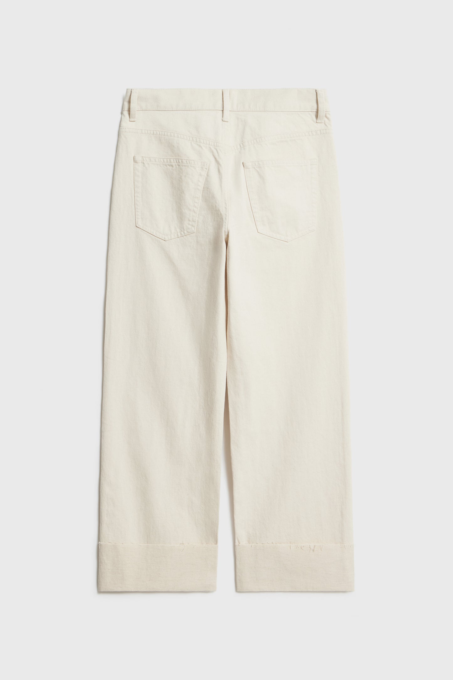 Mid-waist jeans with a five-pocket design made from cotton and linen blend denim. The straight legs have wide turn-up cuffs with raw edges that crop at the ankle. Front zip fly and metal button fastening.