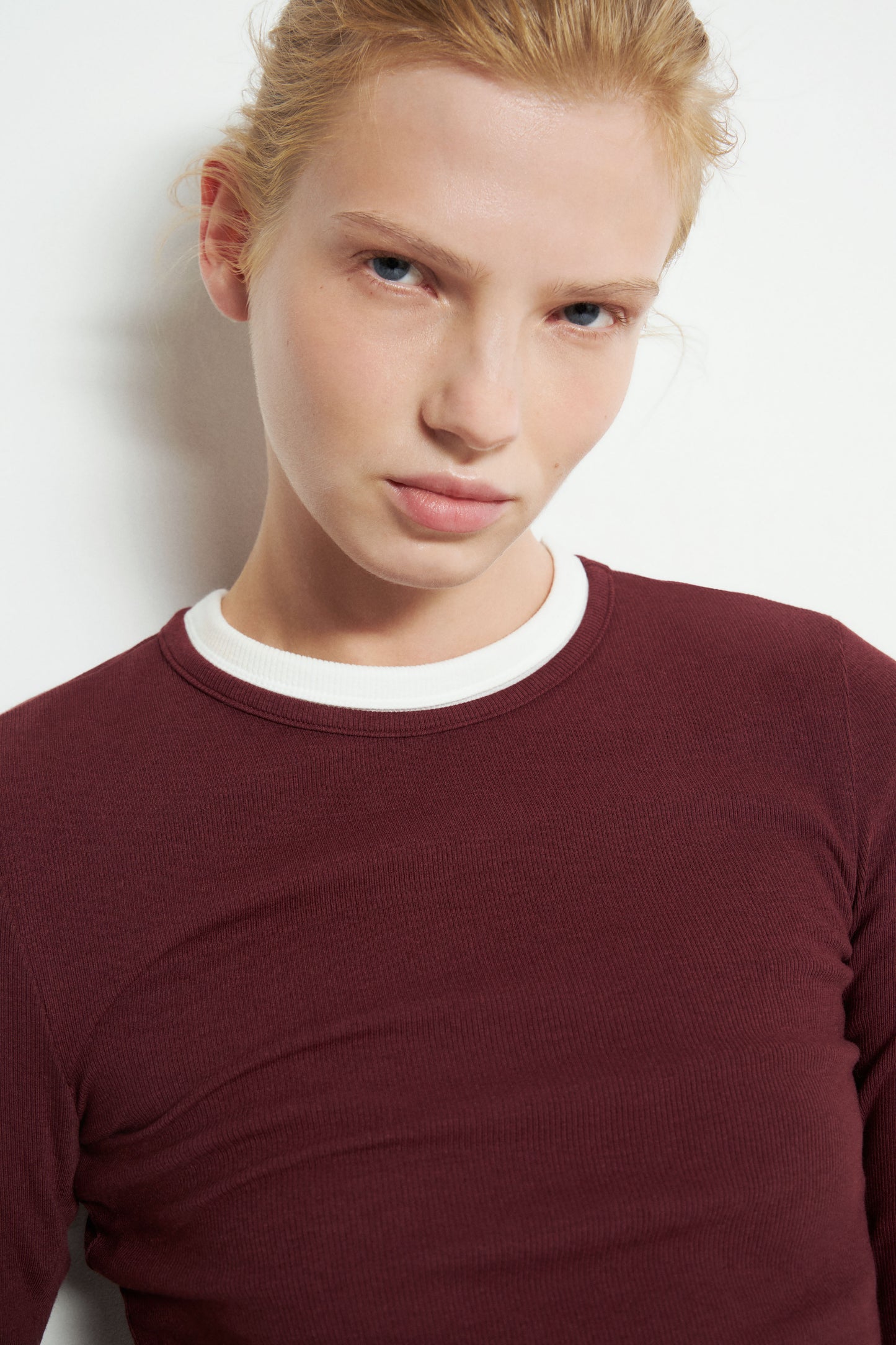 Fitted T-shirt in soft cotton and viscose blend with a round neckline and long sleeves.
