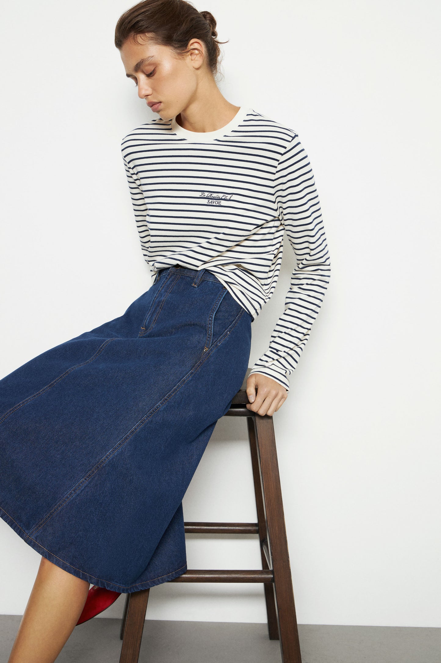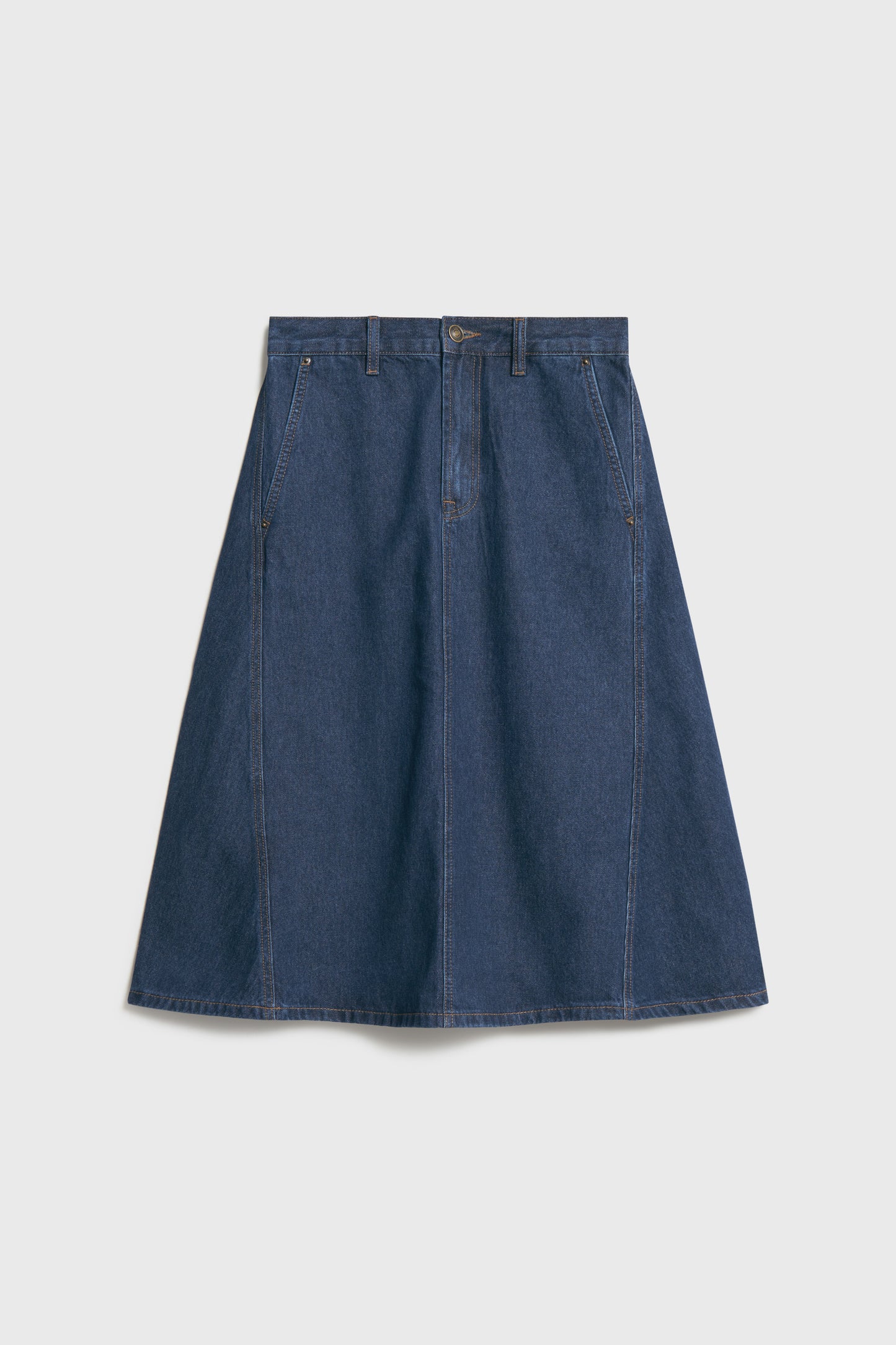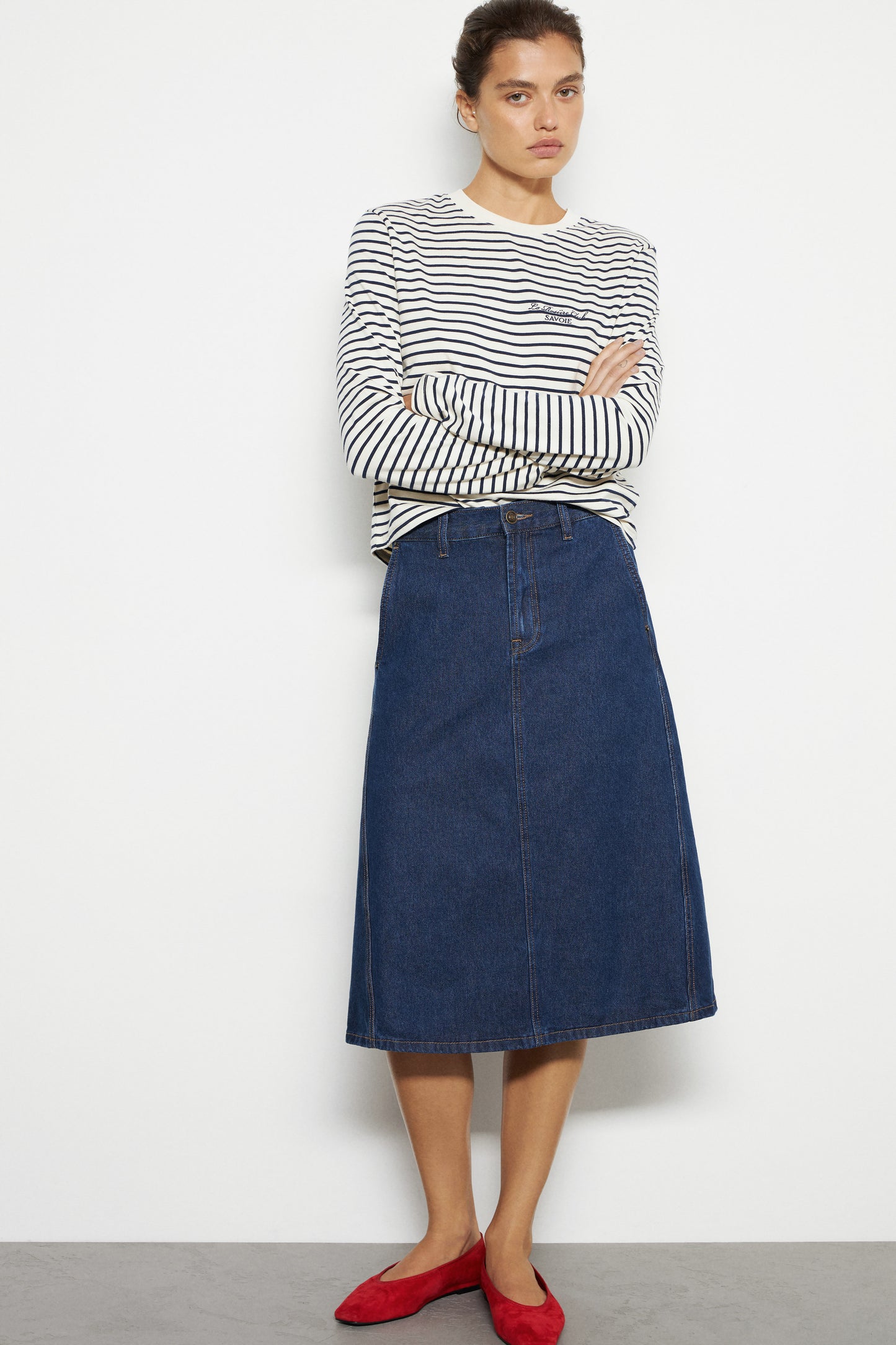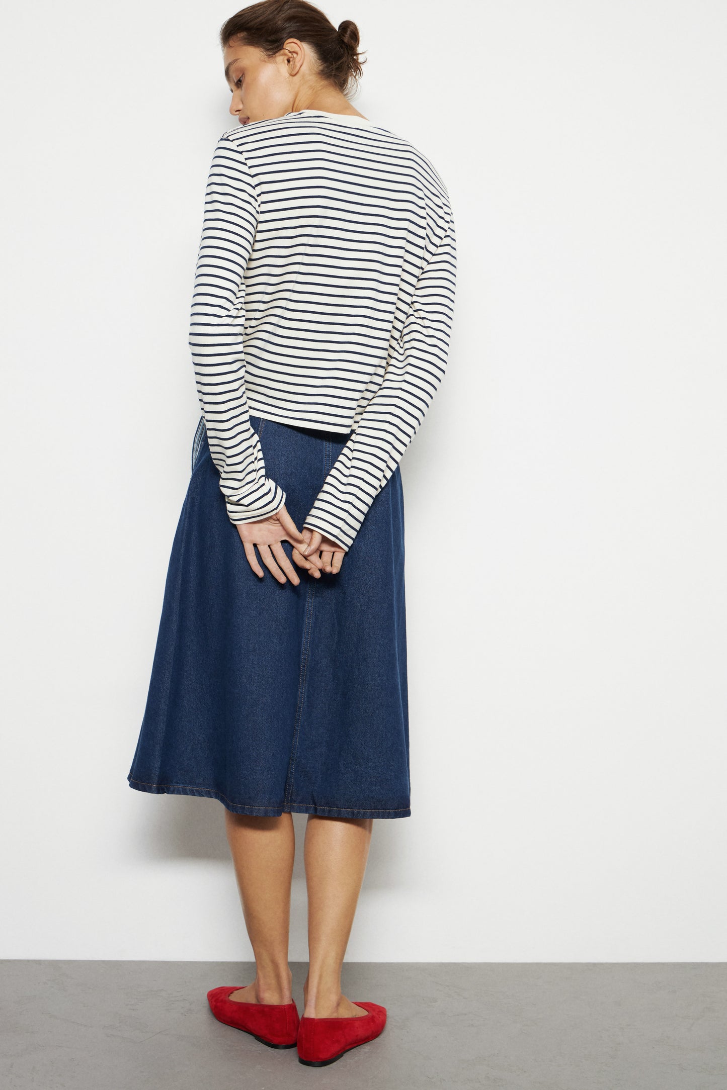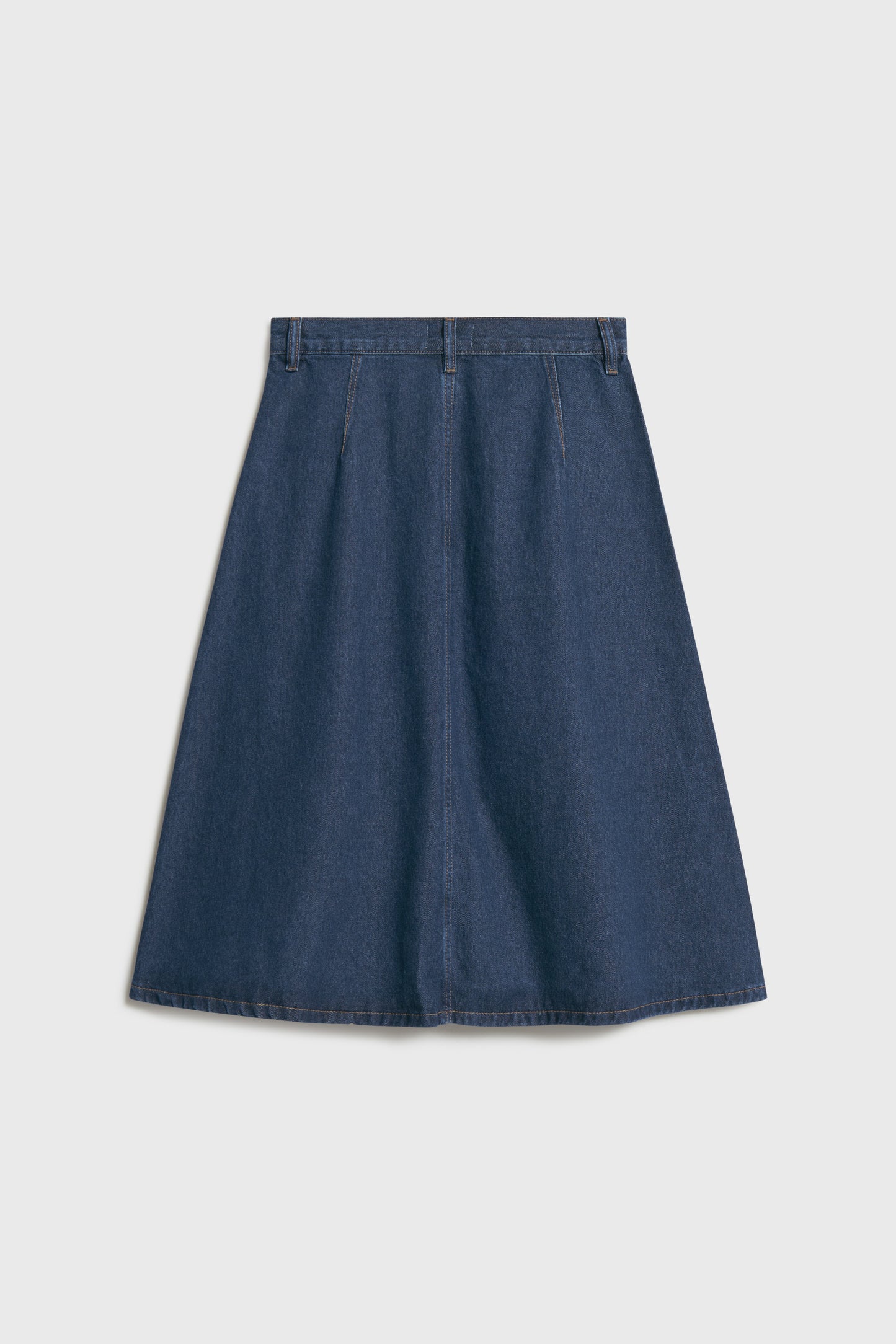 Knee-length skirt in faded denim crafted from a cotton and lyocell blend. Flared hem. Side pockets. Zip and metal button fastening.