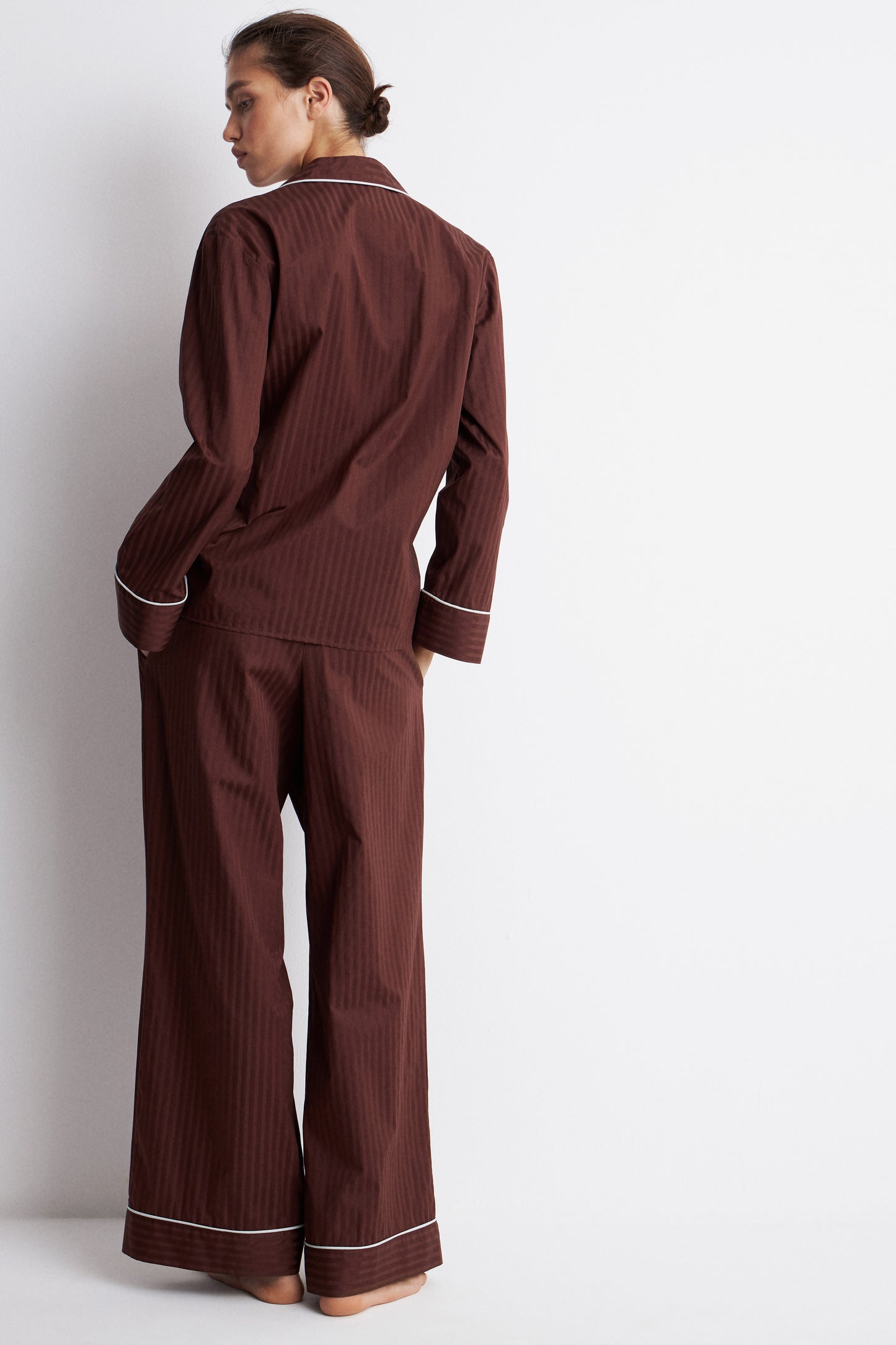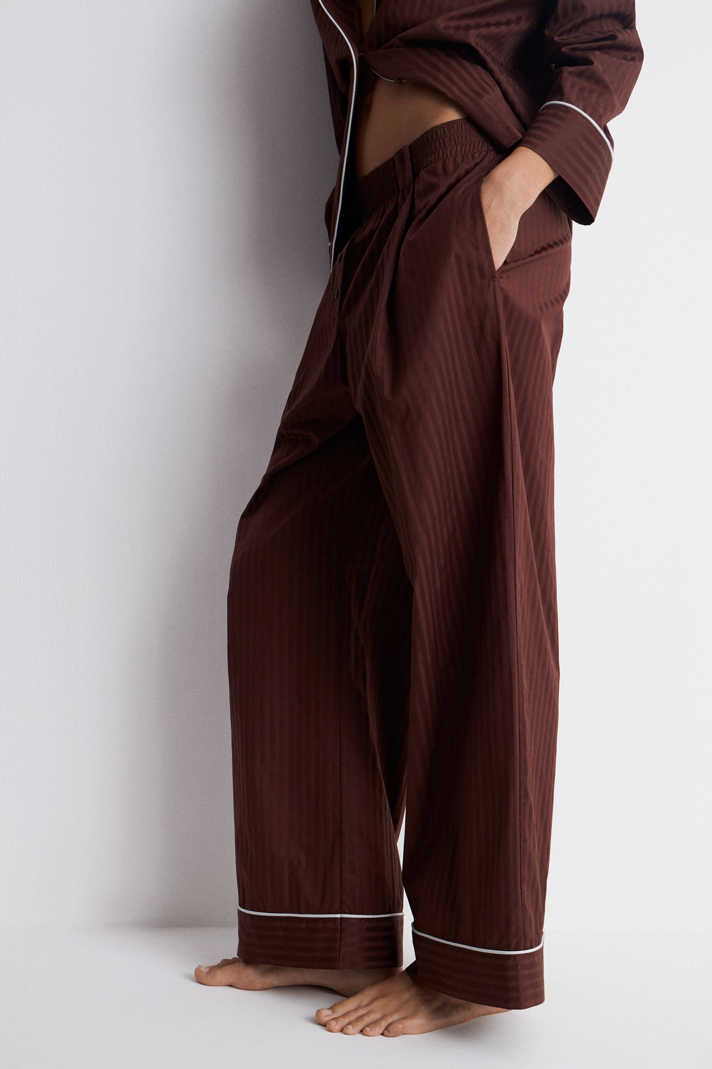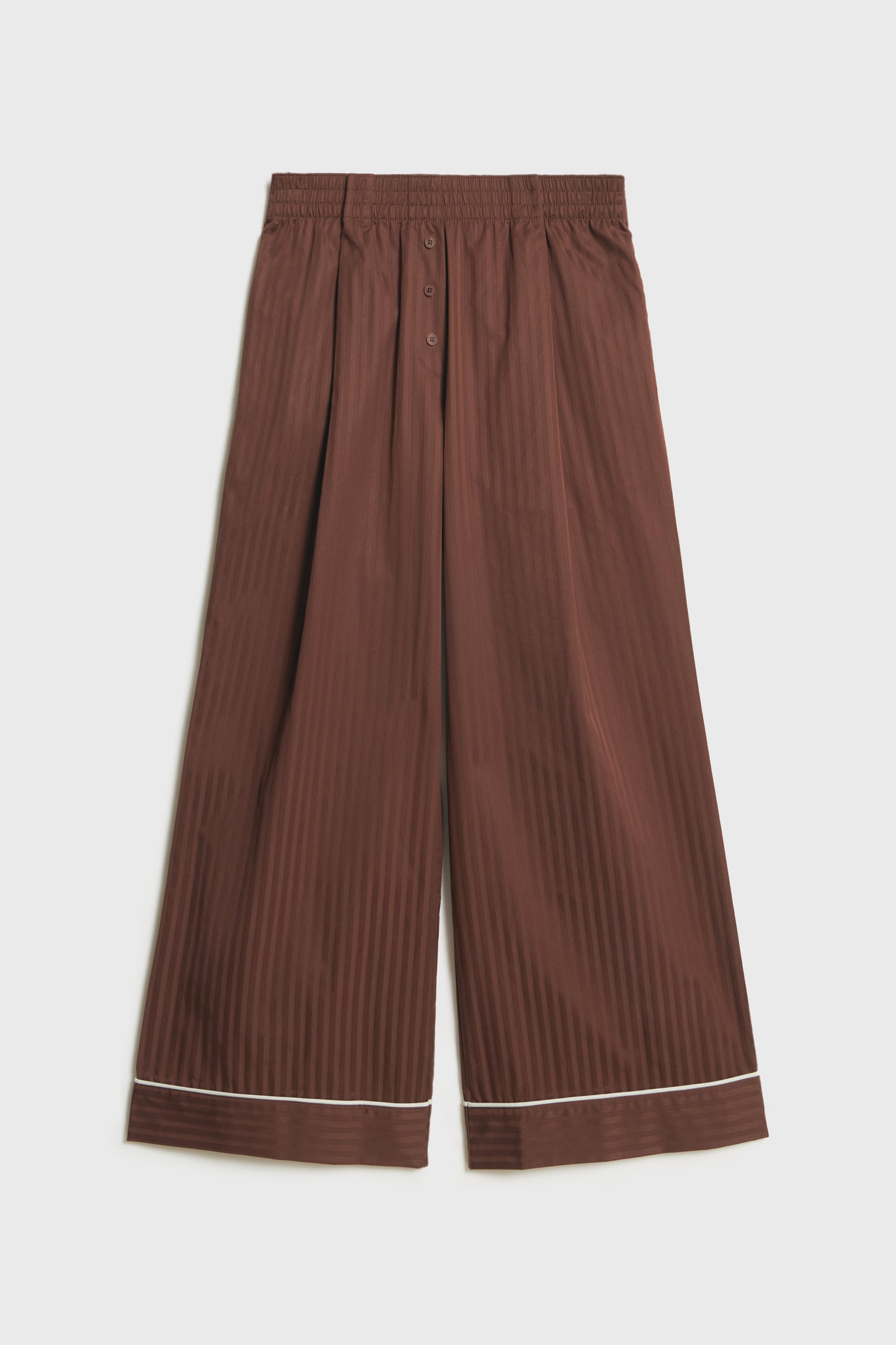 Trousers in cotton with contrasting color piping. Featuring a fake front fly and a paperbag waist with pleats. Side pockets and turn-up hems.