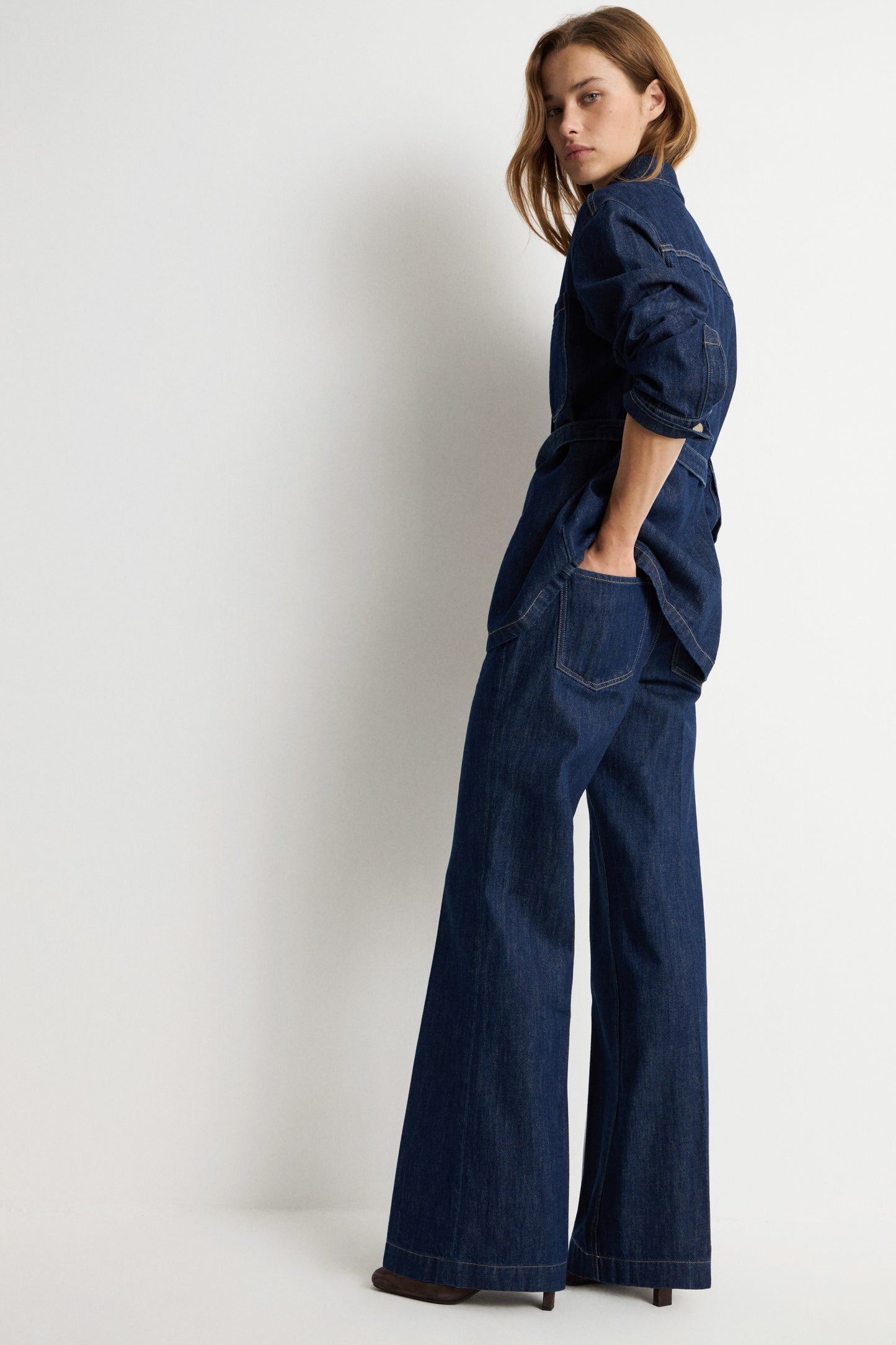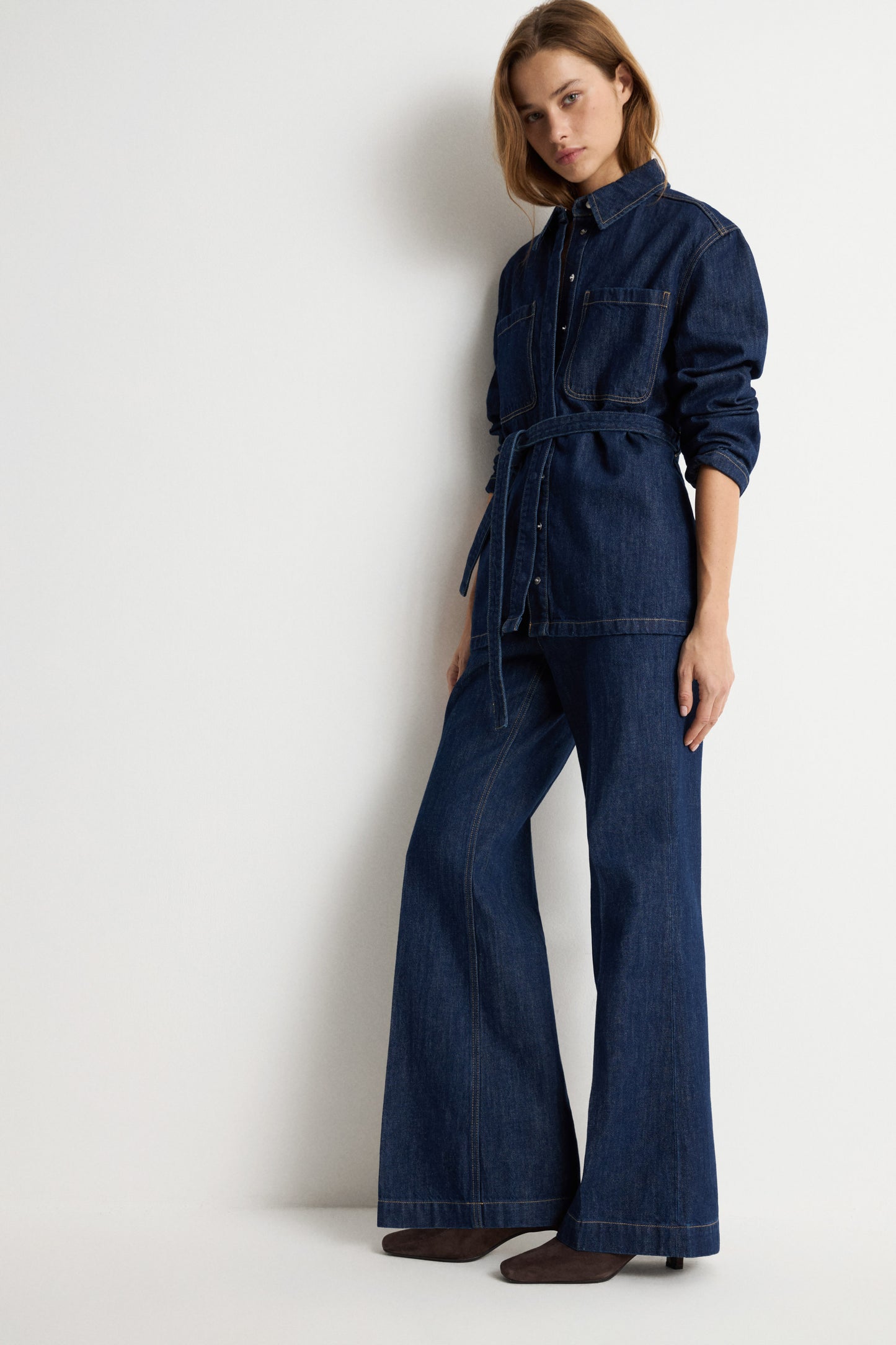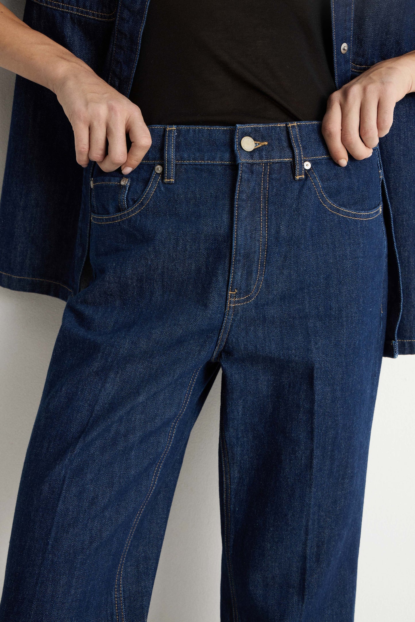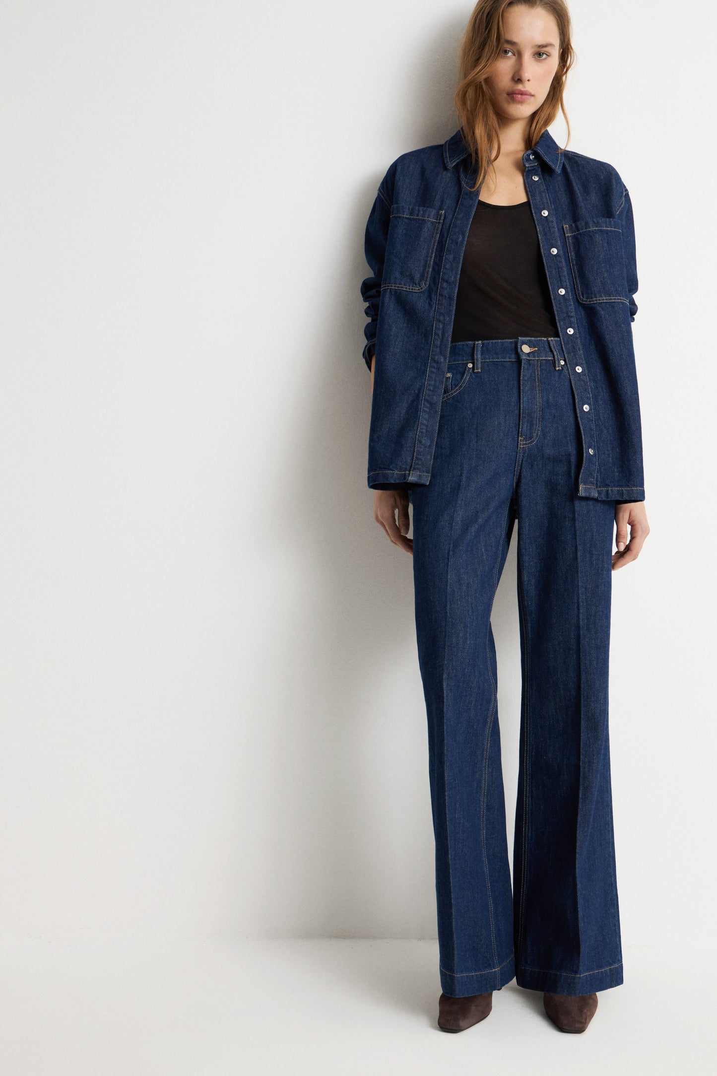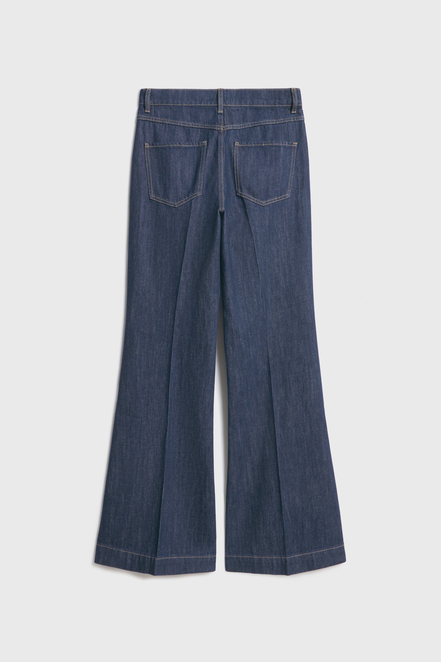 Mid-waist jeans in cotton denim featuring a five-pocket design and front press creases. Each bordered with tobacco-brown topstitching. Flared hems. Front zip fly and button fastening.