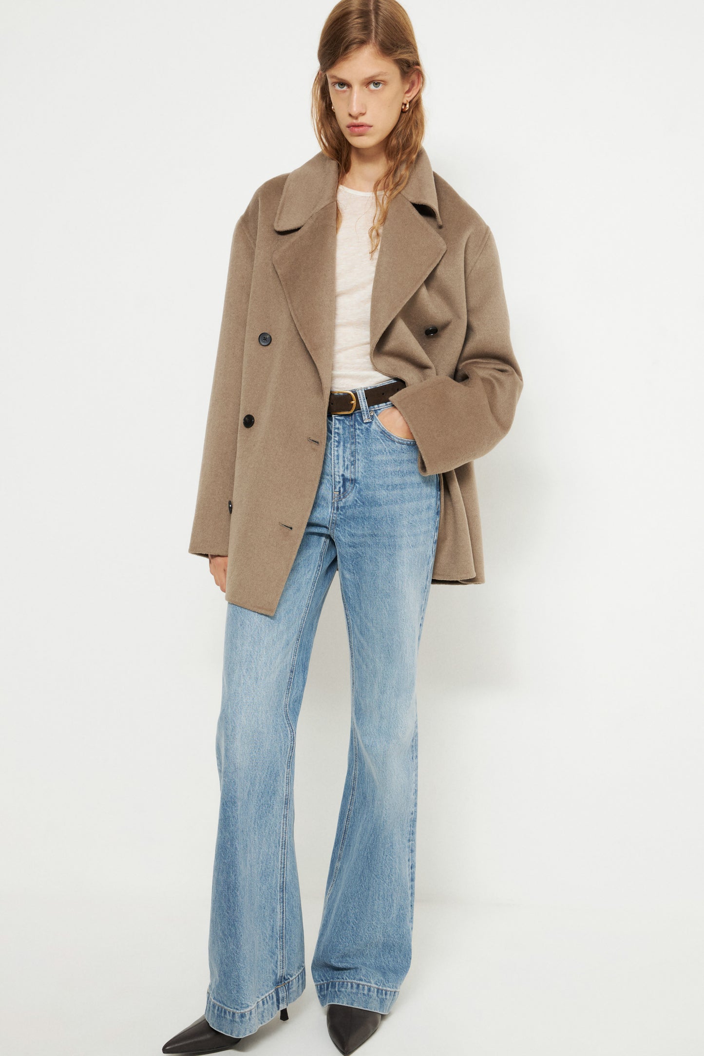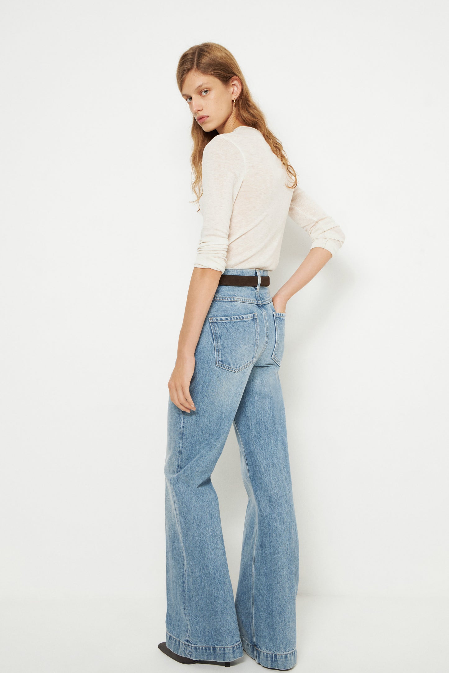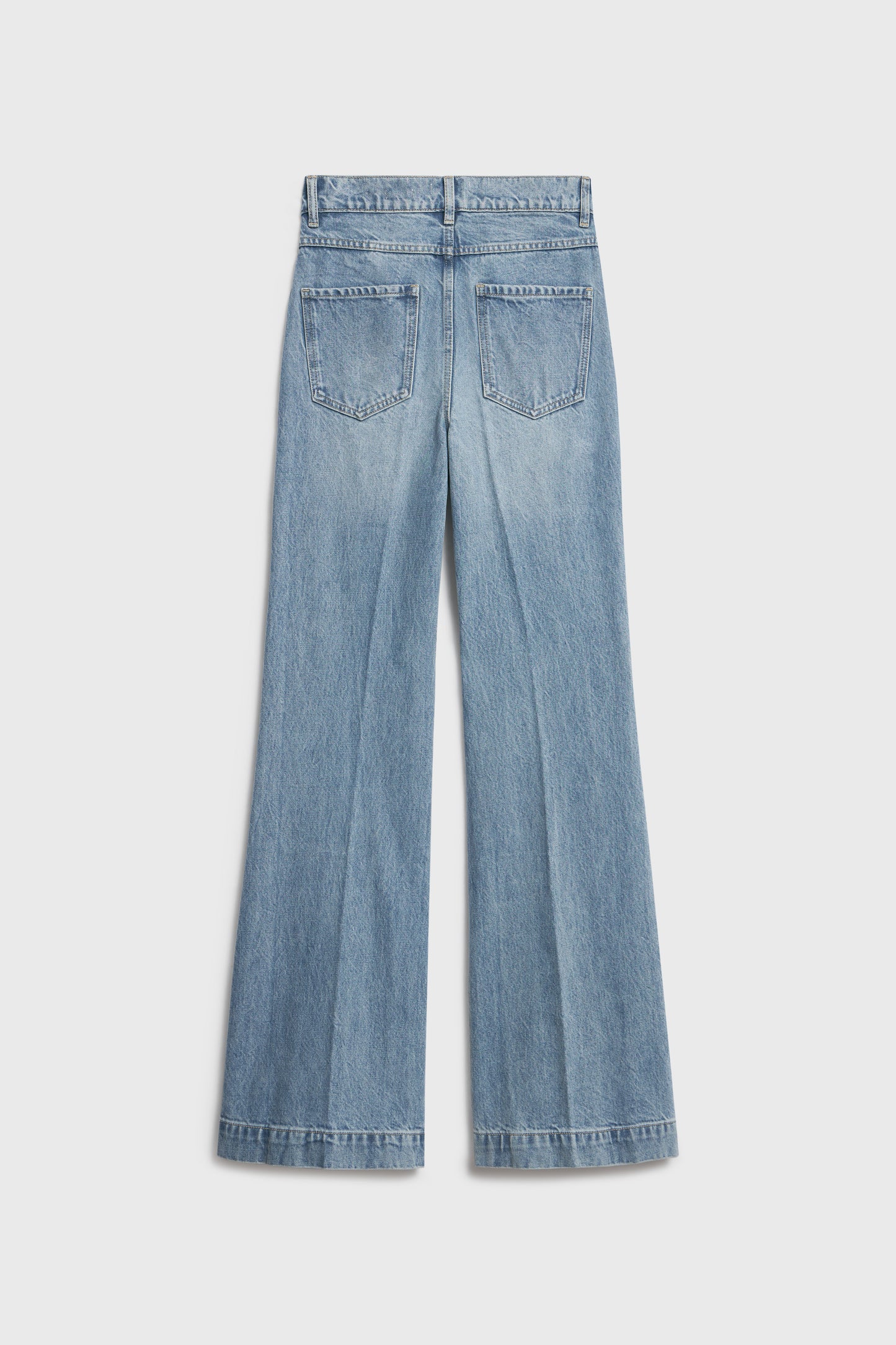 Mid-waist jeans in cotton denim featuring a five-pocket design and front press creases. Faded effect. Flared hems. Front zip fly and button fastening.
