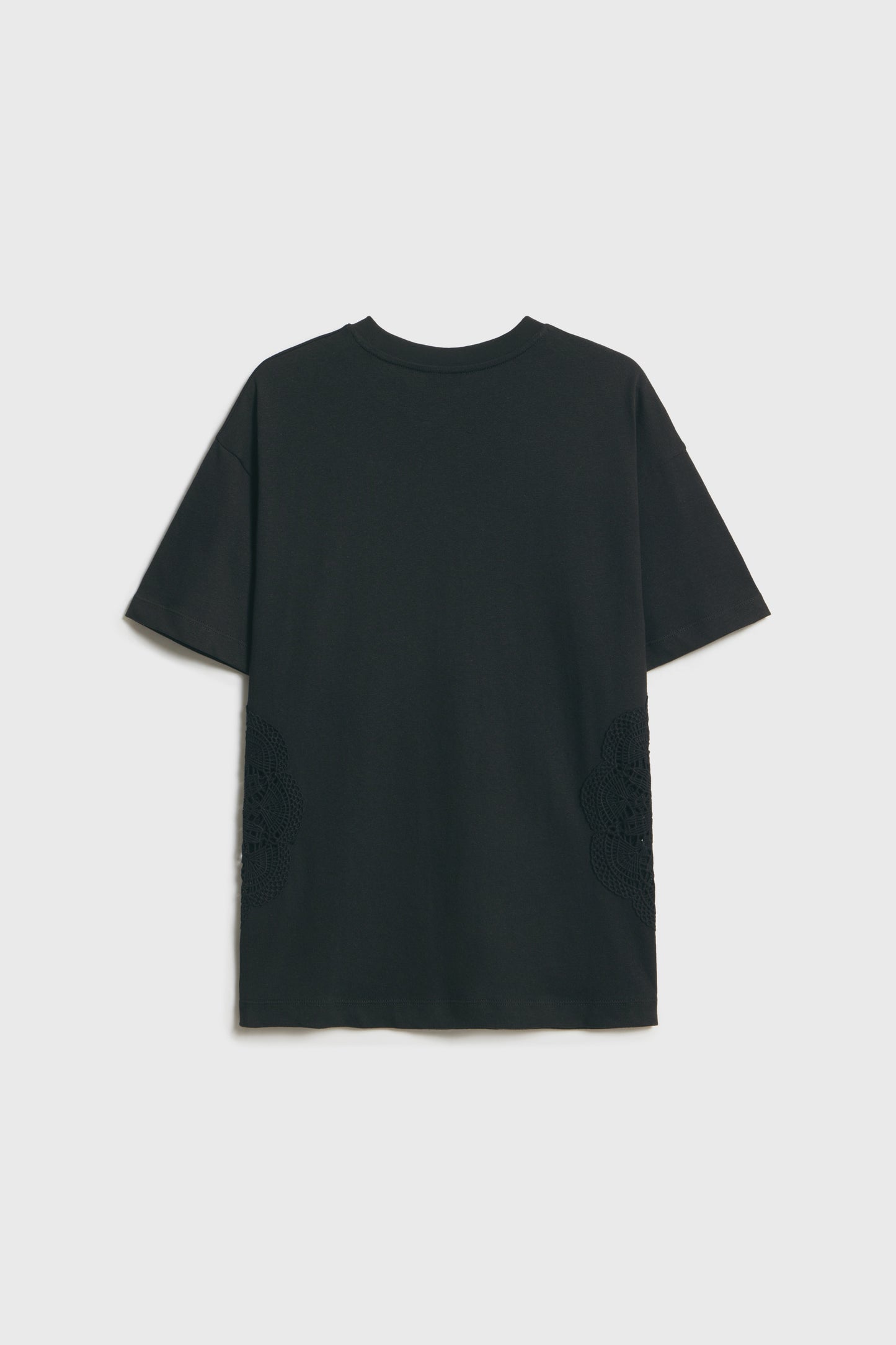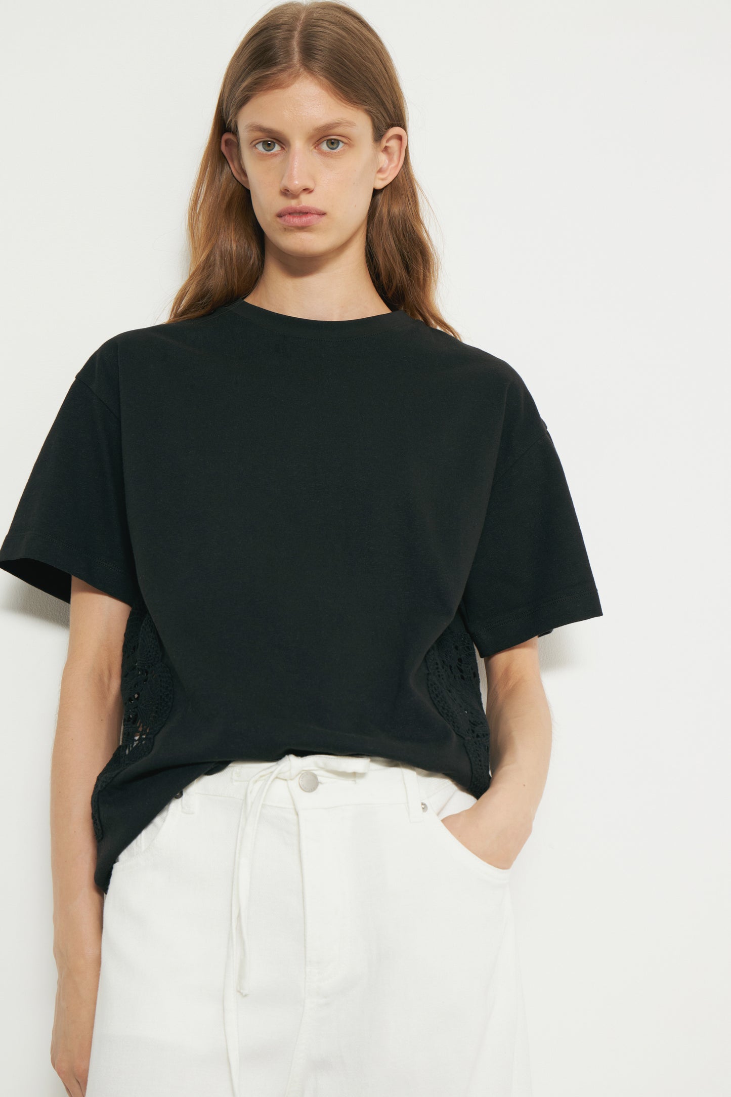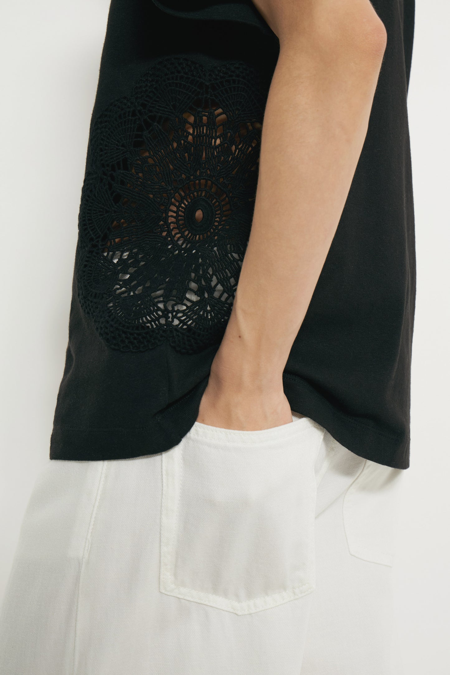 Round neck T-shirt in a cotton weave with short sleeves. Crochet-look details.