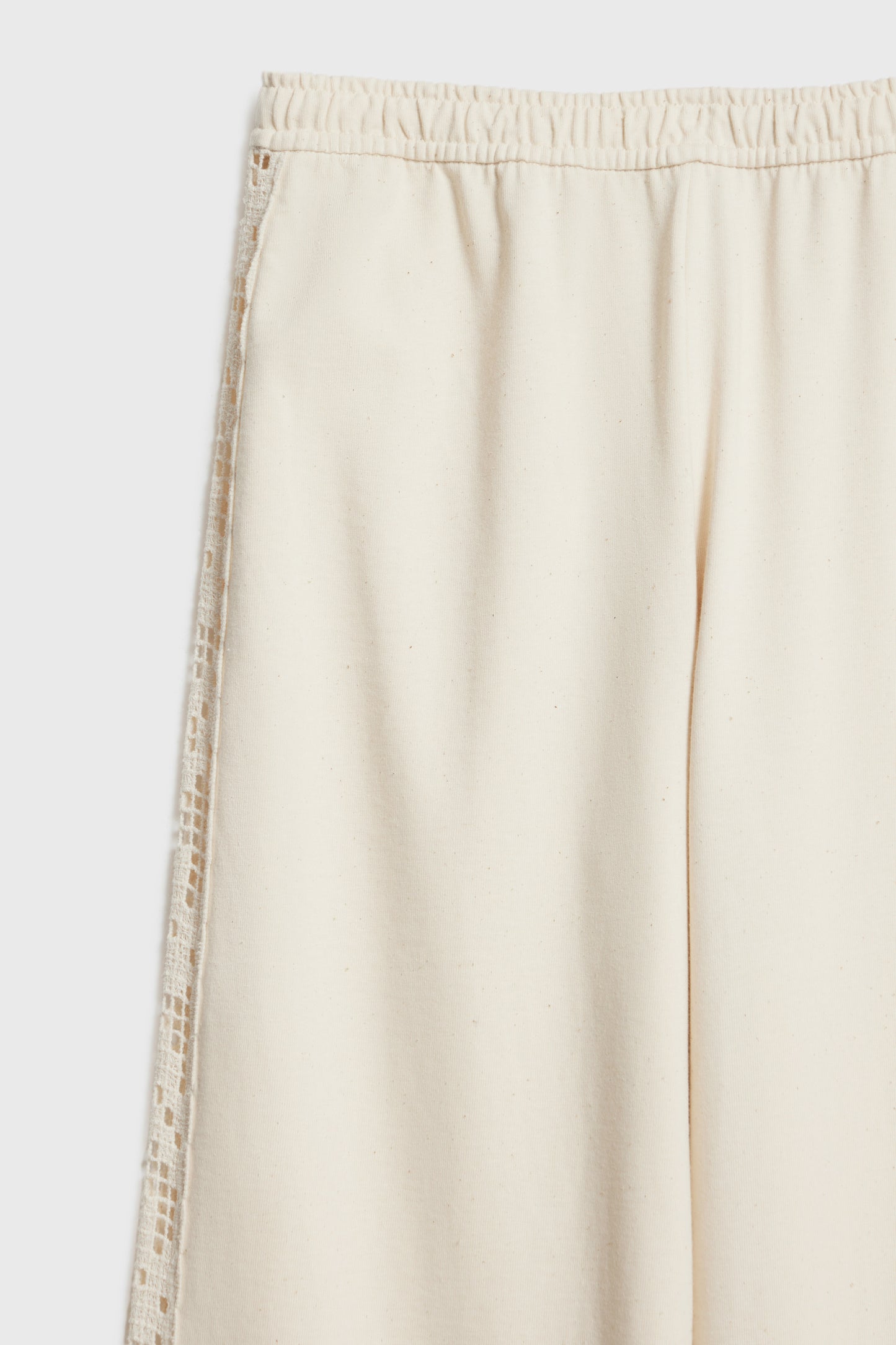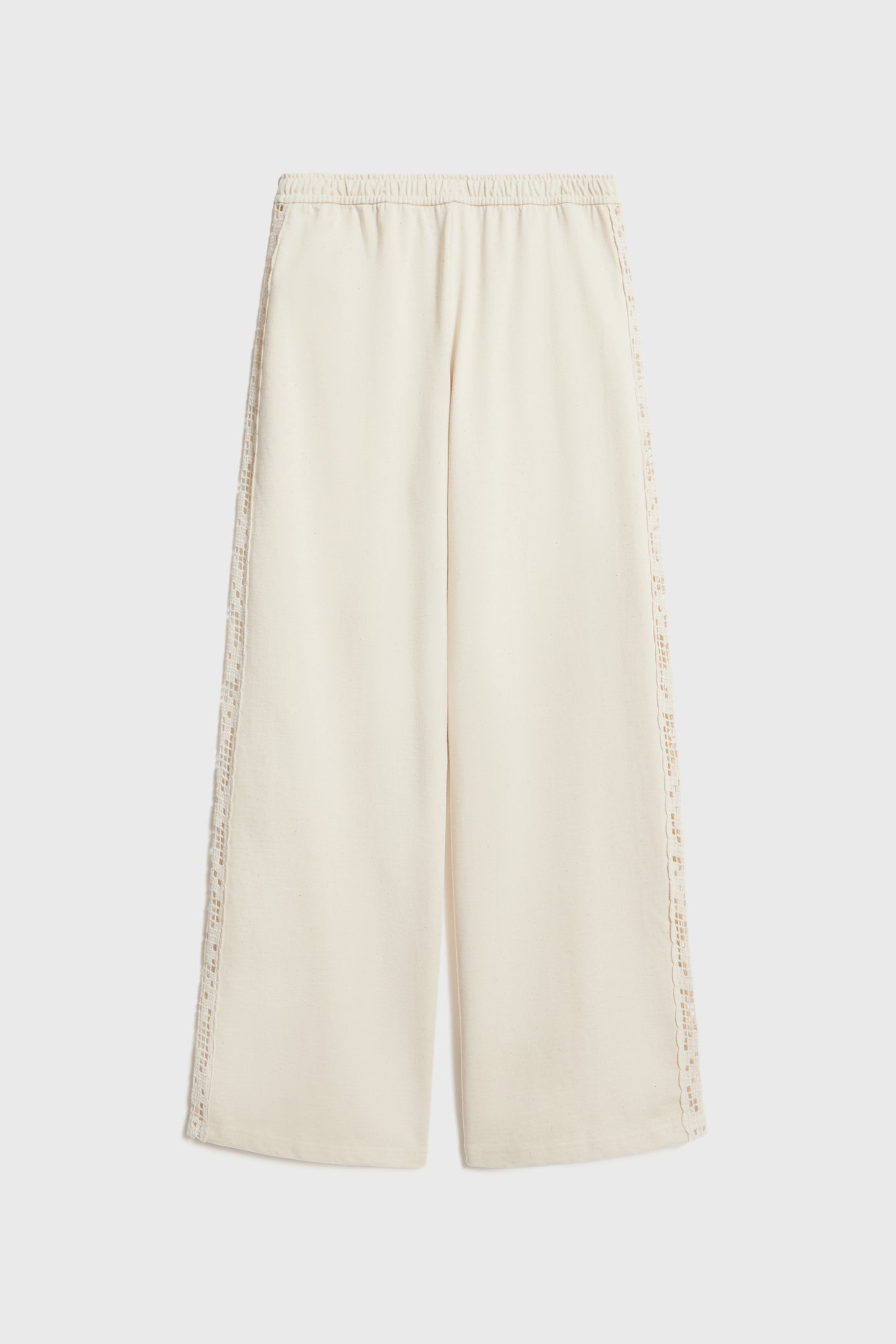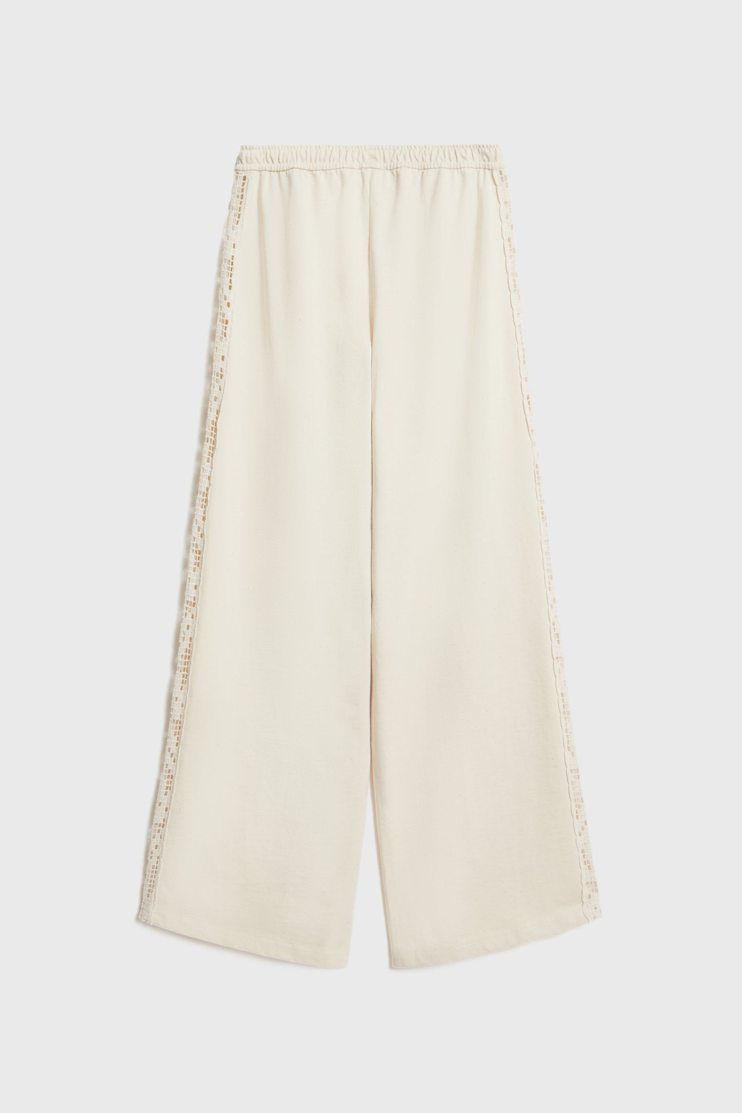 Wide trousers in melange cotton fabric containing some exotic cotton-like kapok fibers. Elasticated drawstring waist. Decorated with side crochet-look inserts.