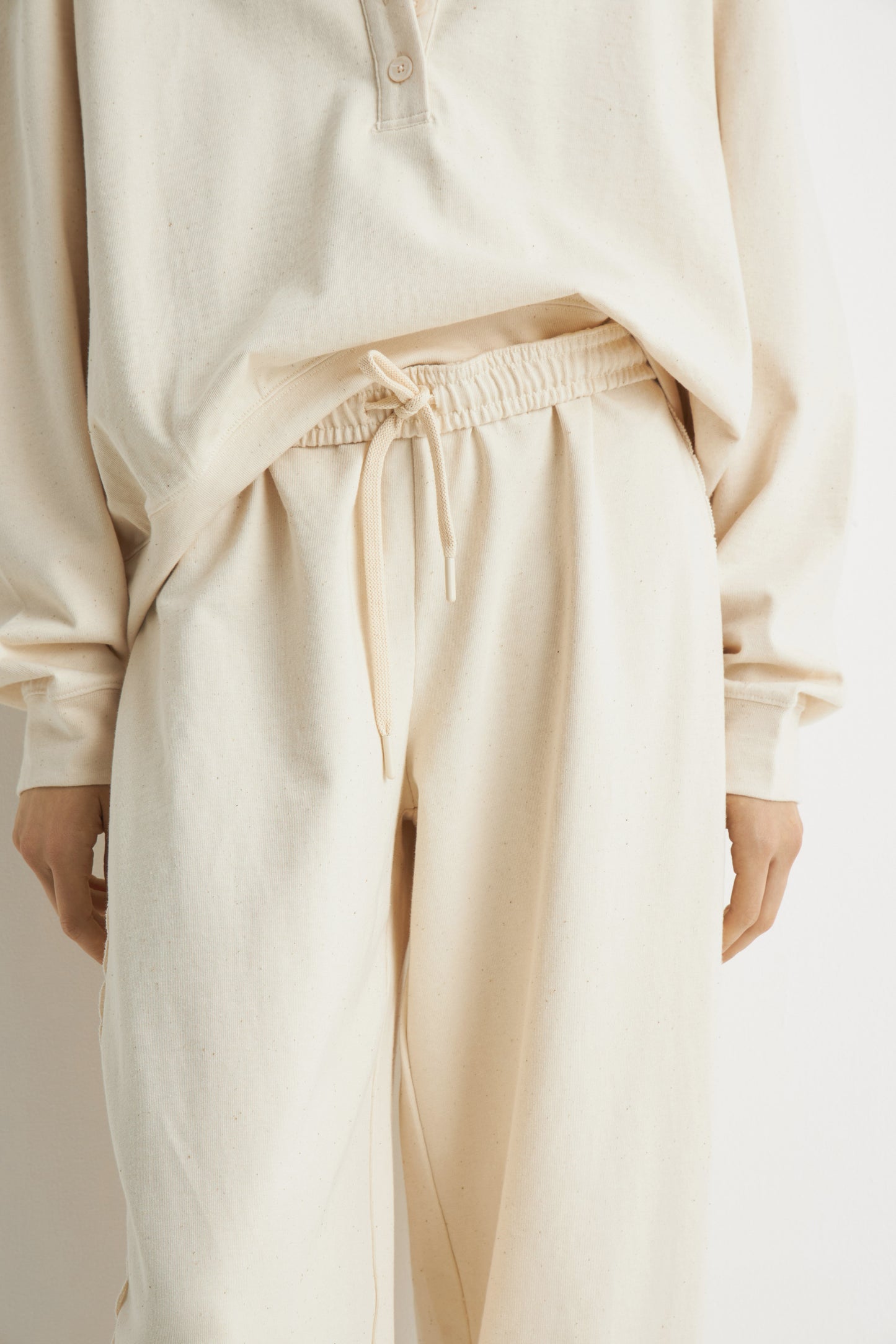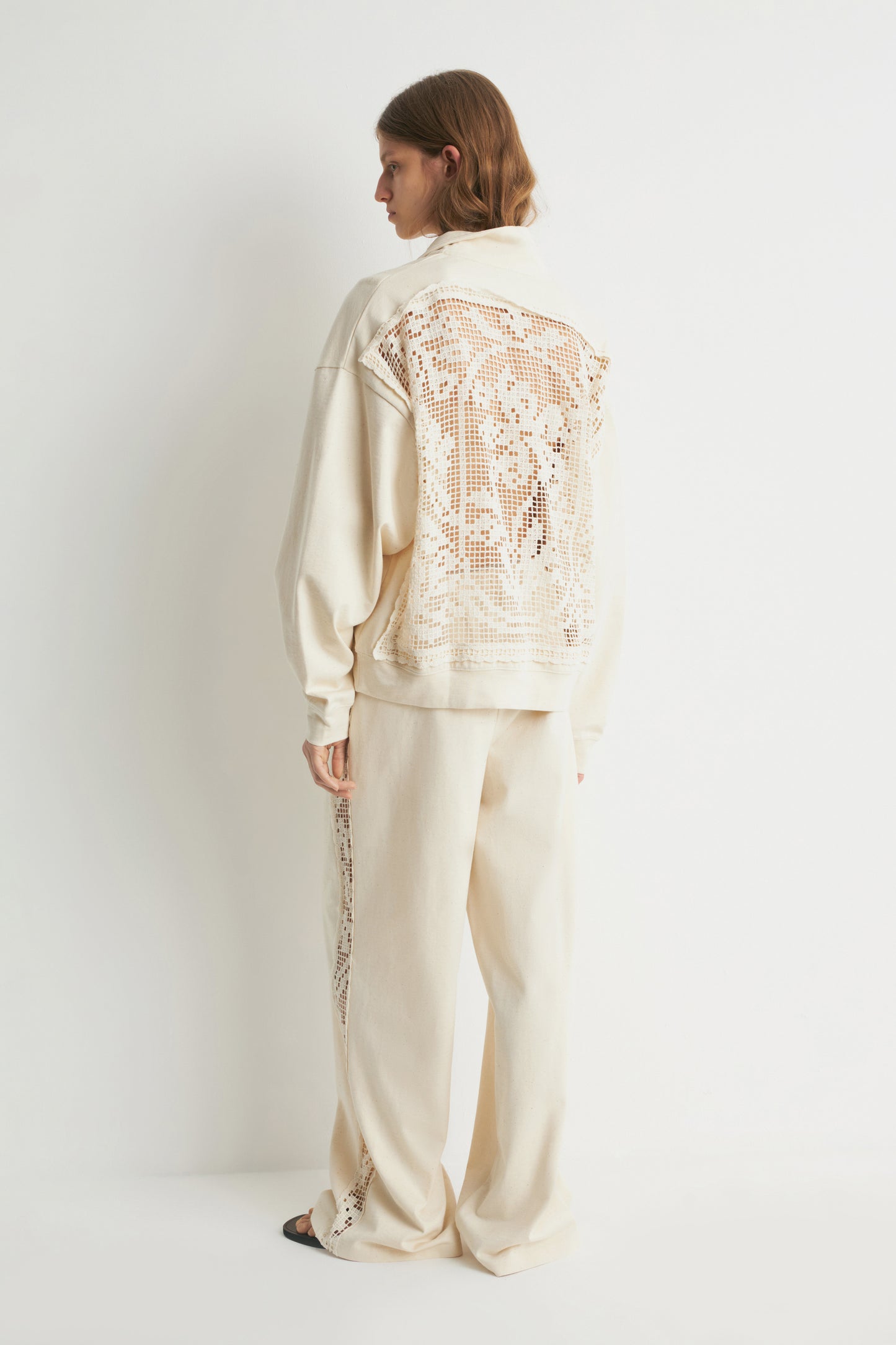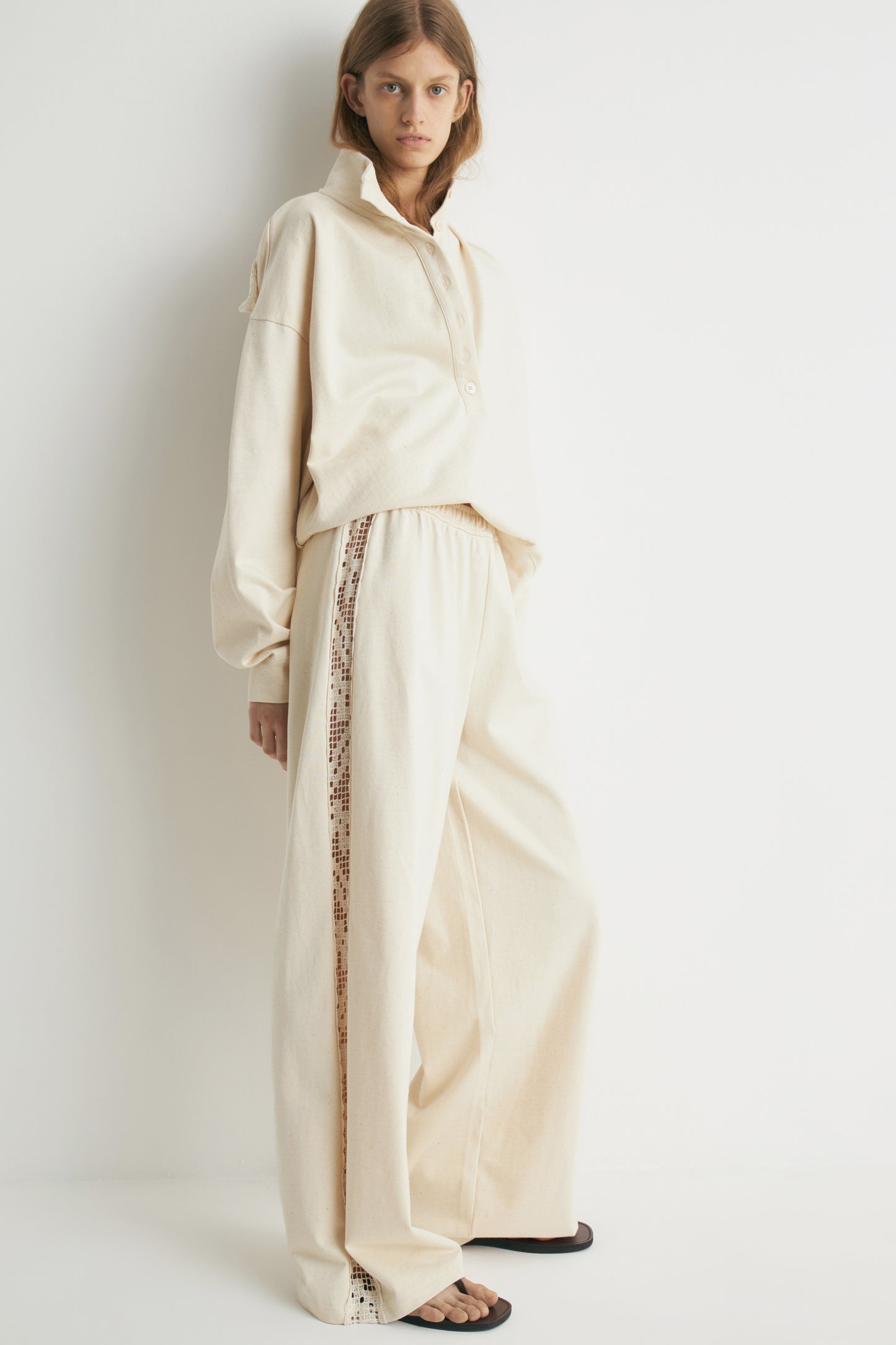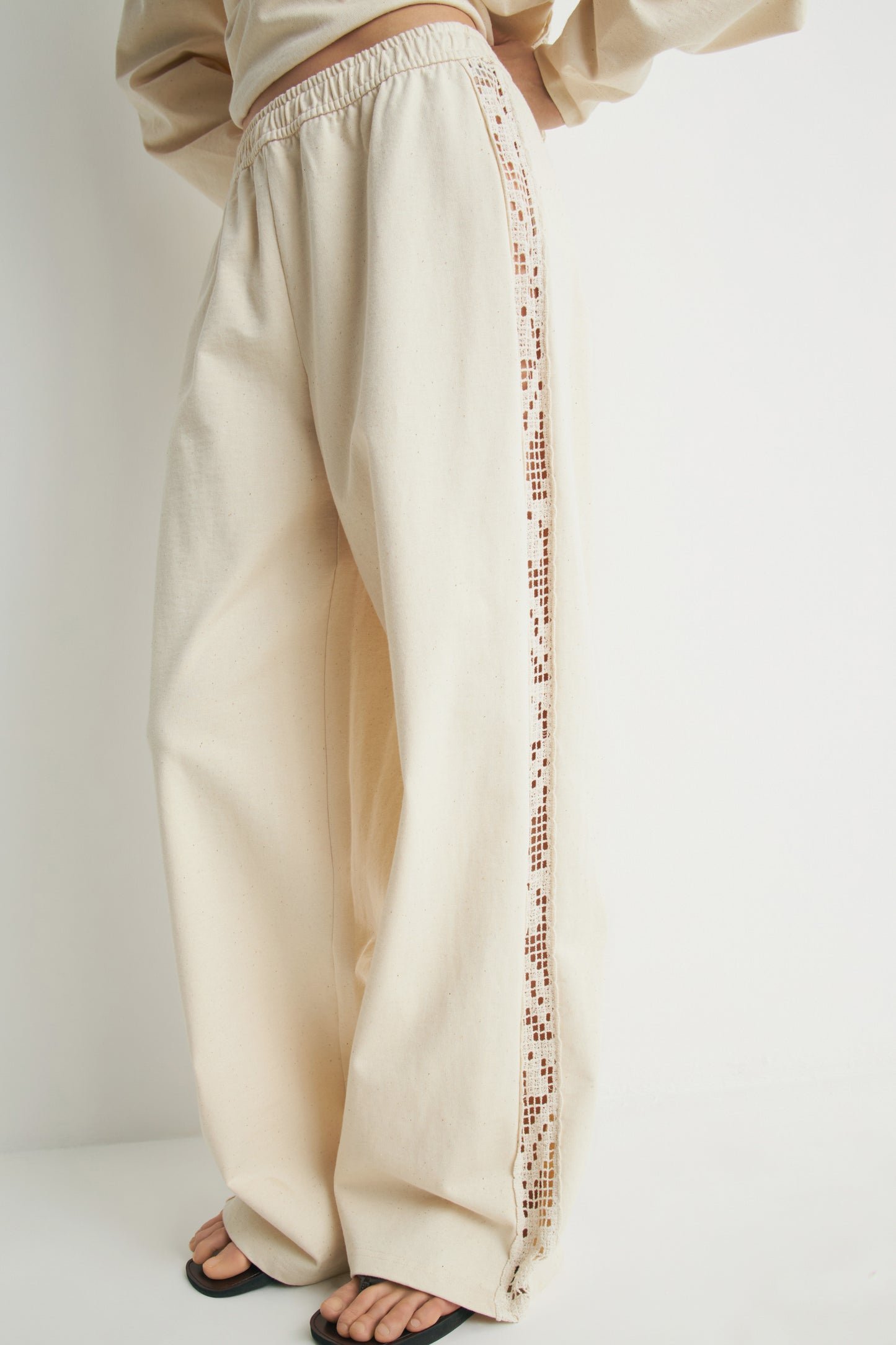 Wide trousers in melange cotton fabric containing some exotic cotton-like kapok fibers. Elasticated drawstring waist. Decorated with side crochet-look inserts.