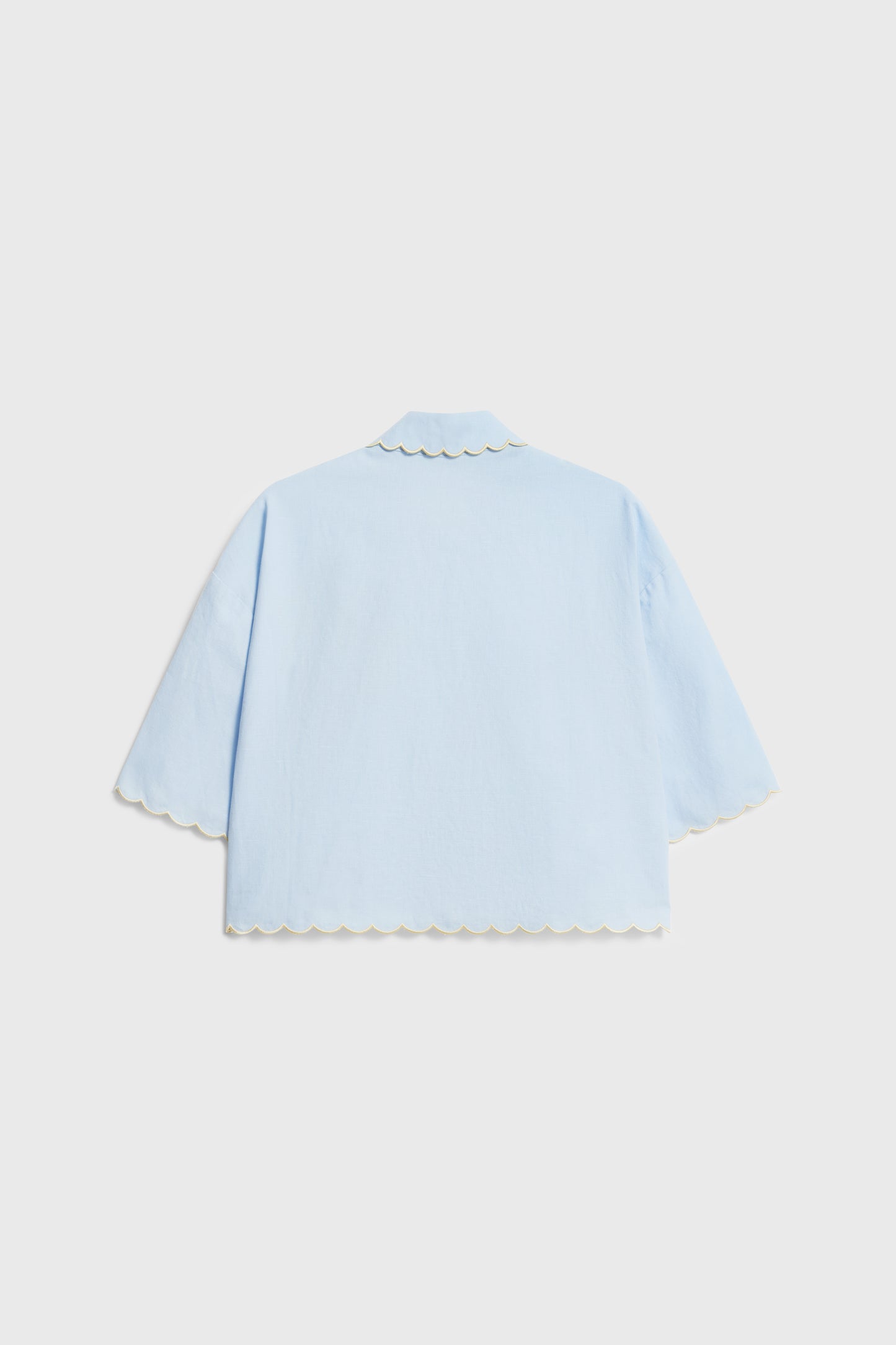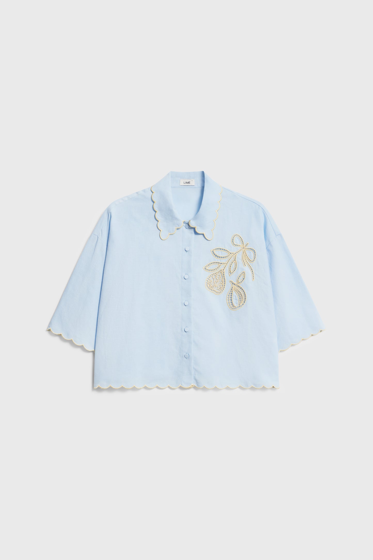 Short, straight-fit shirt in an airy cotton and linen weave with a collar, short sleeves and covered buttons down the front. The piece has scalloped edges with accent color stitching all around and an embroidered cutwork detail.