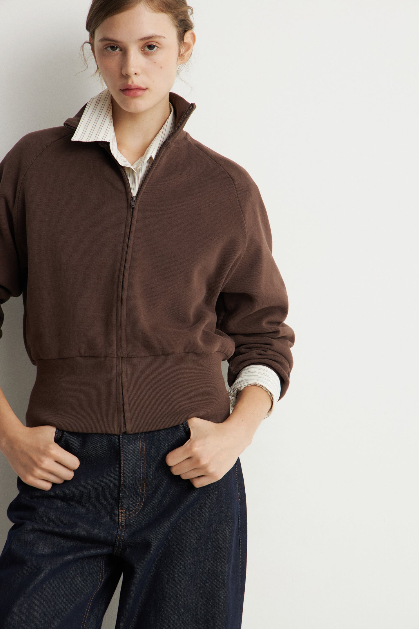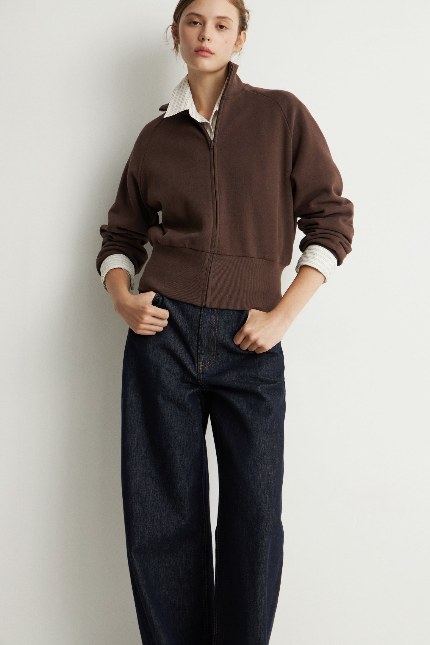 Slim-fit, short sweatshirt with a fitted silhouette. Matching topstitching detail. Stand-up collar, zip at front, and long sleeves. Ribbing at cuffs, and wide hem.
