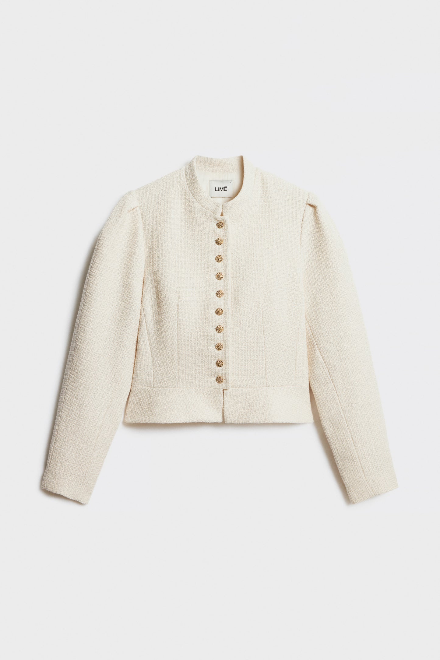 Cropped, slim fit blazer in tweed. Featuring a stand collar, long sleeves with shoulder pads and a flared peplum. Matching lining. Single-breasted front with textured metal buttons.