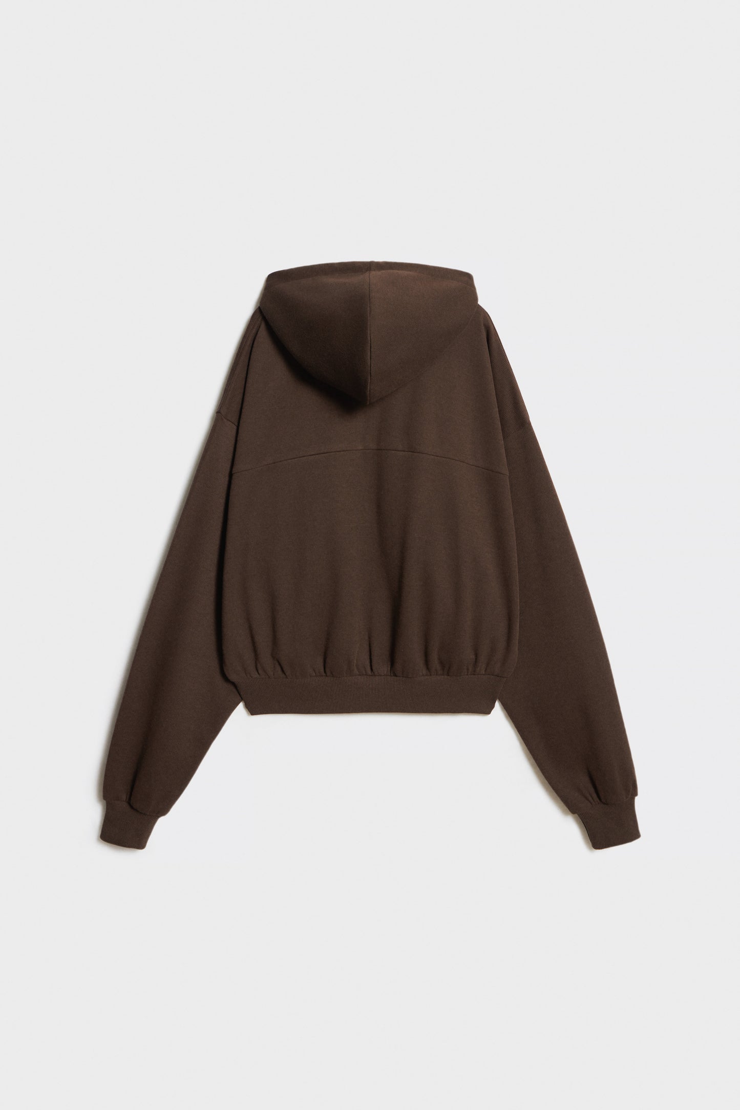 Cropped zip-through hoodie made from a cotton blend. Detailed with a zip down the front, long sleeves and drawstring hood with long ties. Oversized fit.