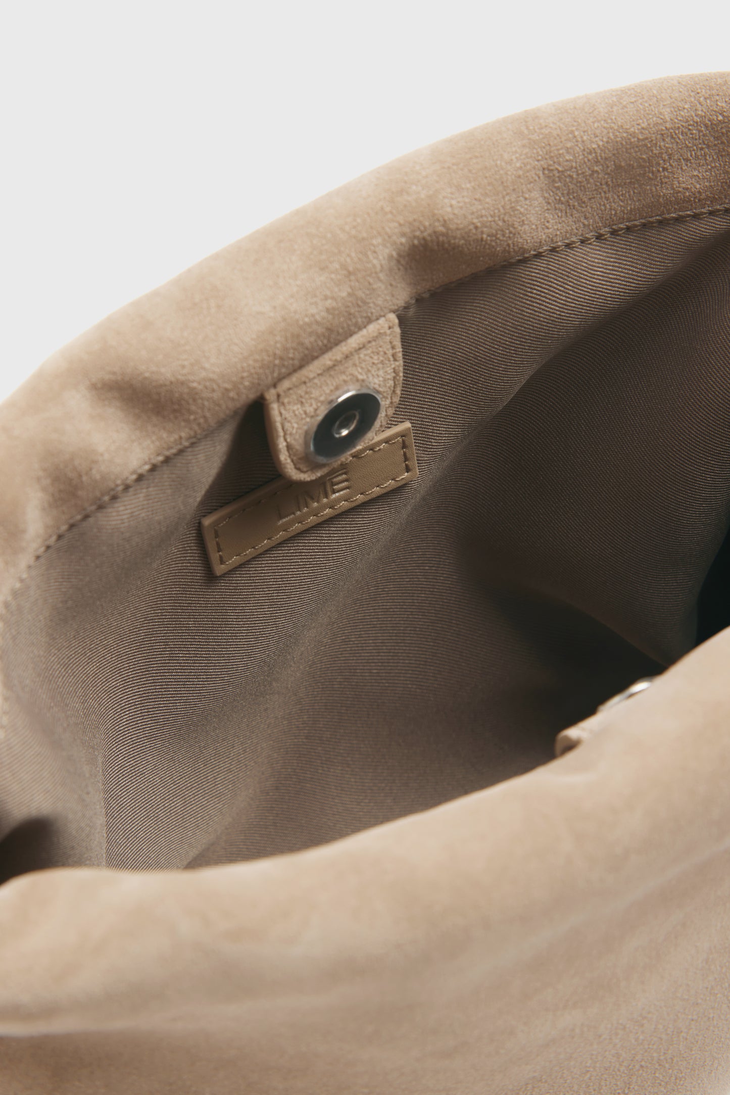 Crossbody suede bag. Features a shoulder strap and drawstring. Magnetic closure. Lined. Size: 28 х 6 х 25 cm (length х width х height).