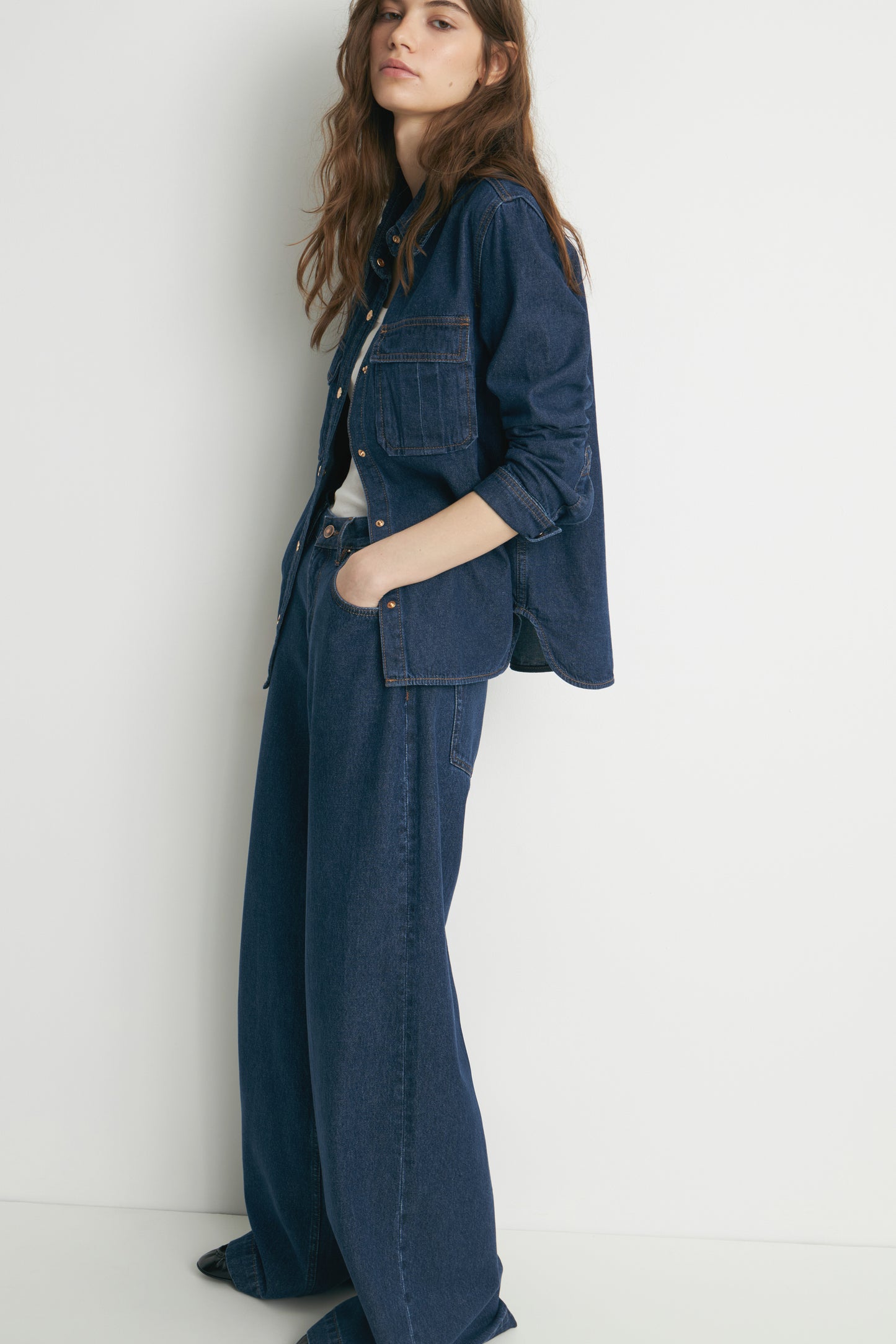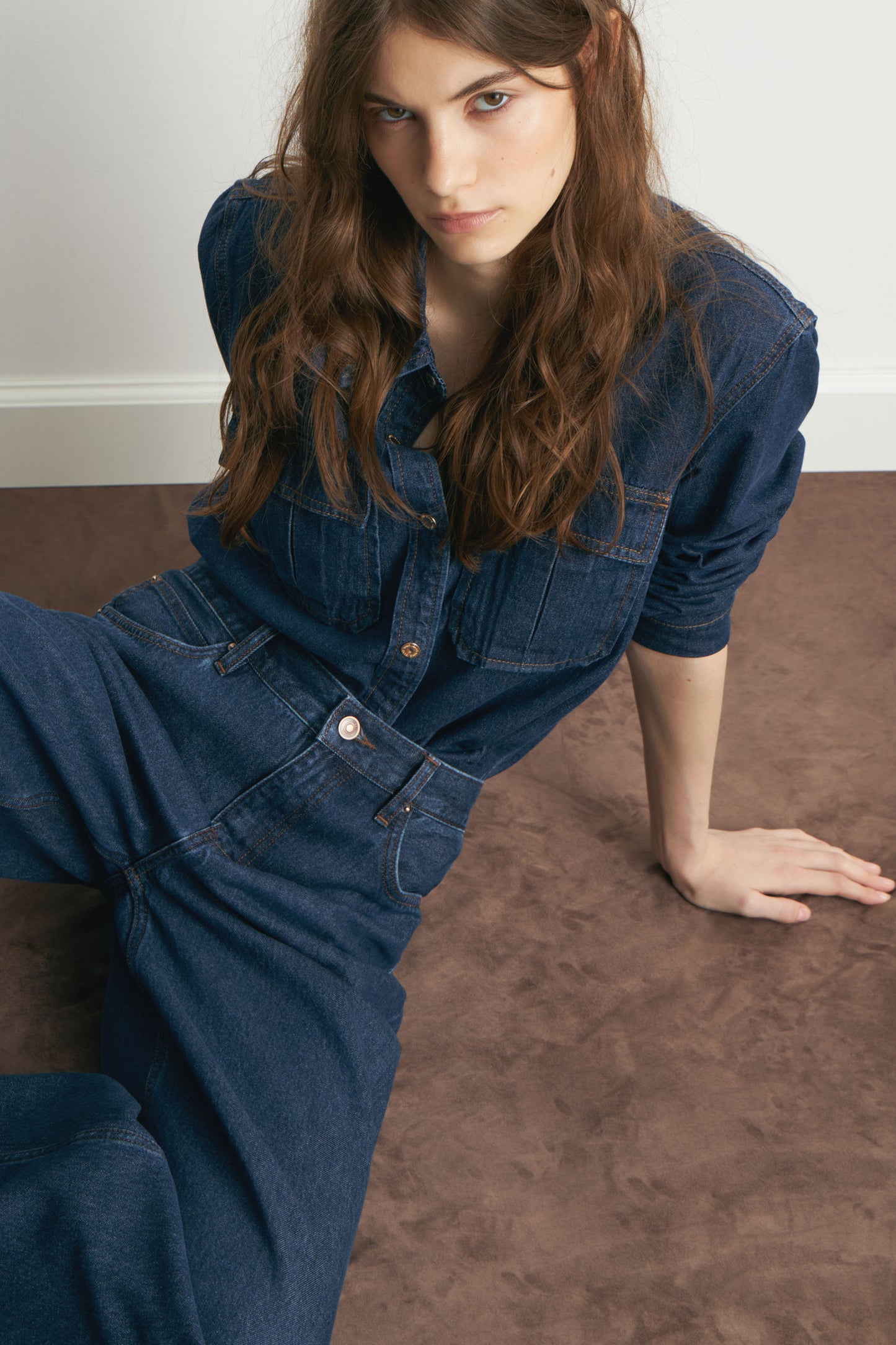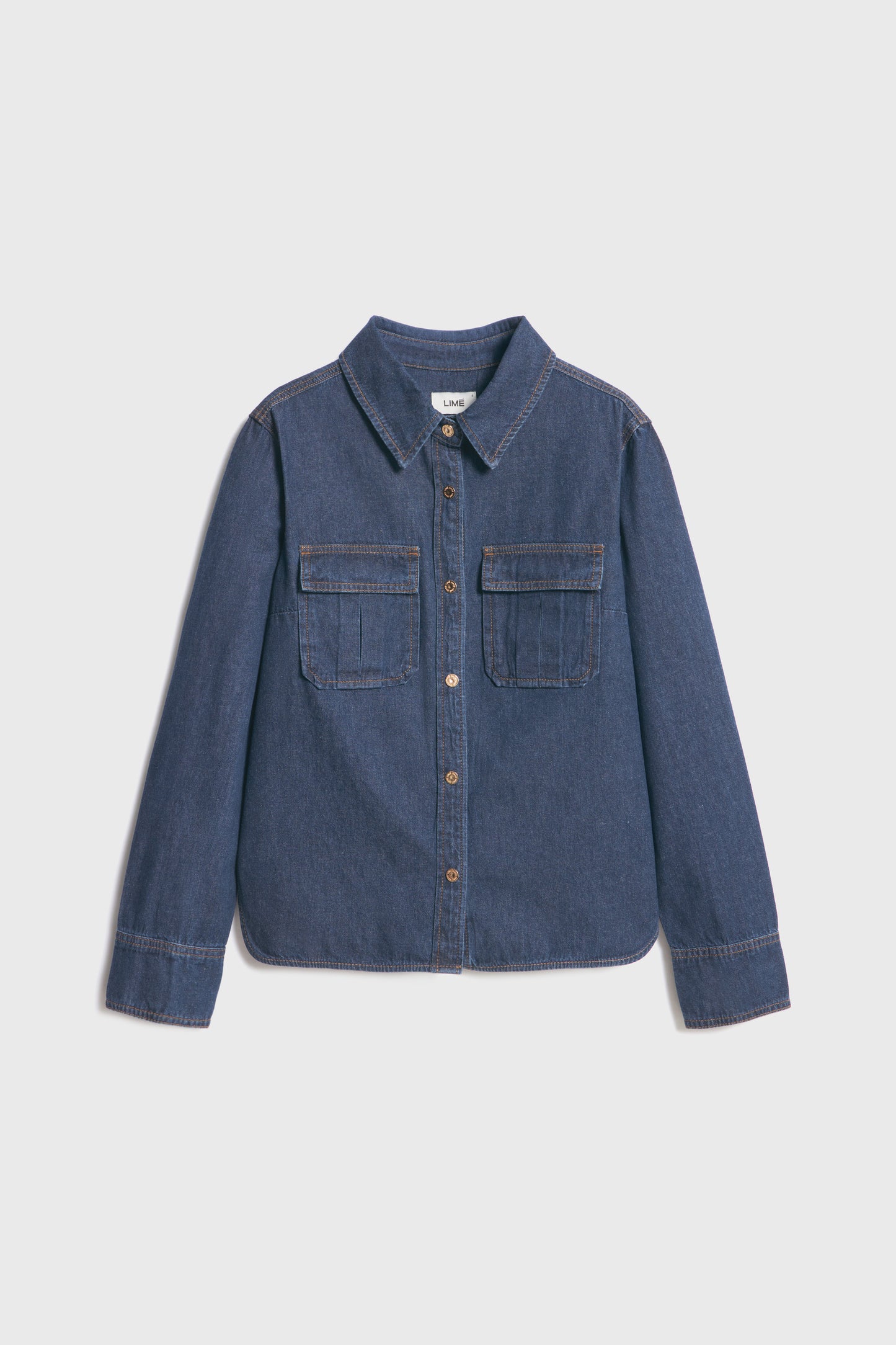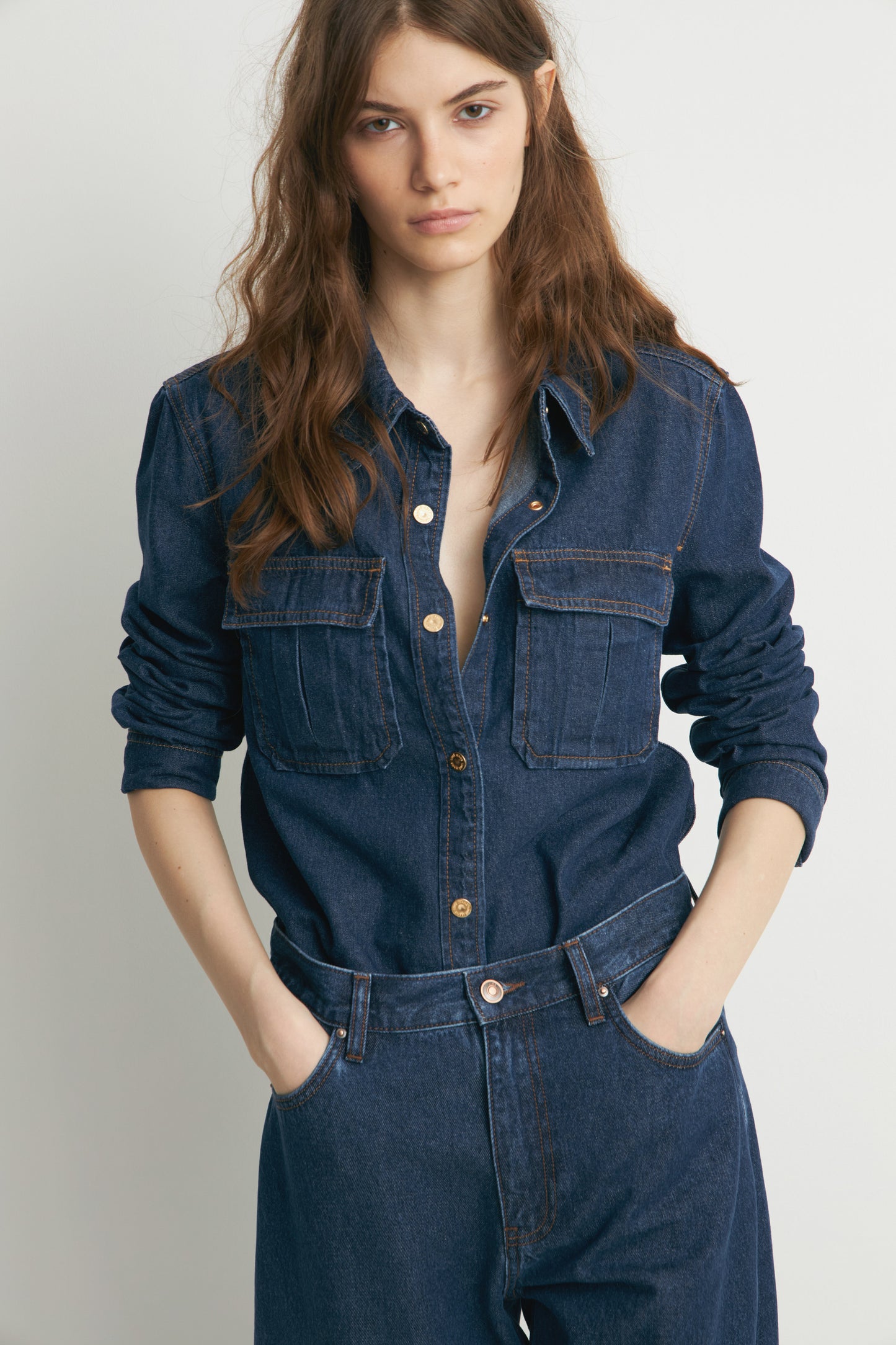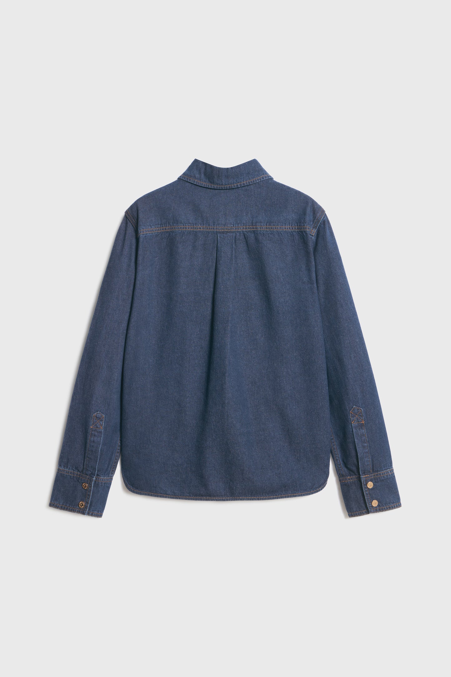 Shirt in cotton denim with a collar. Featuring long sleeves buttoned cuffs and chest pockets. Rounded hem. Slim fit. Front snap button fastening.