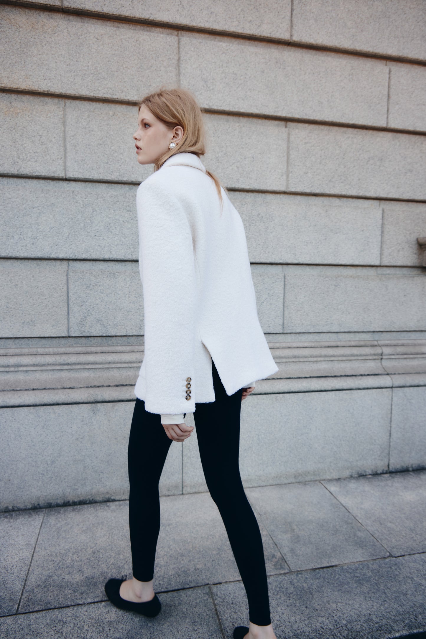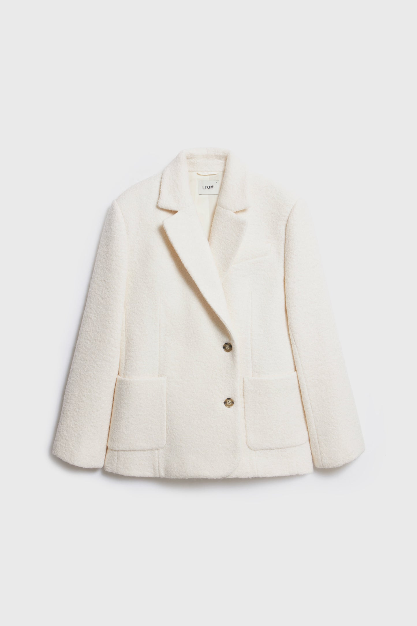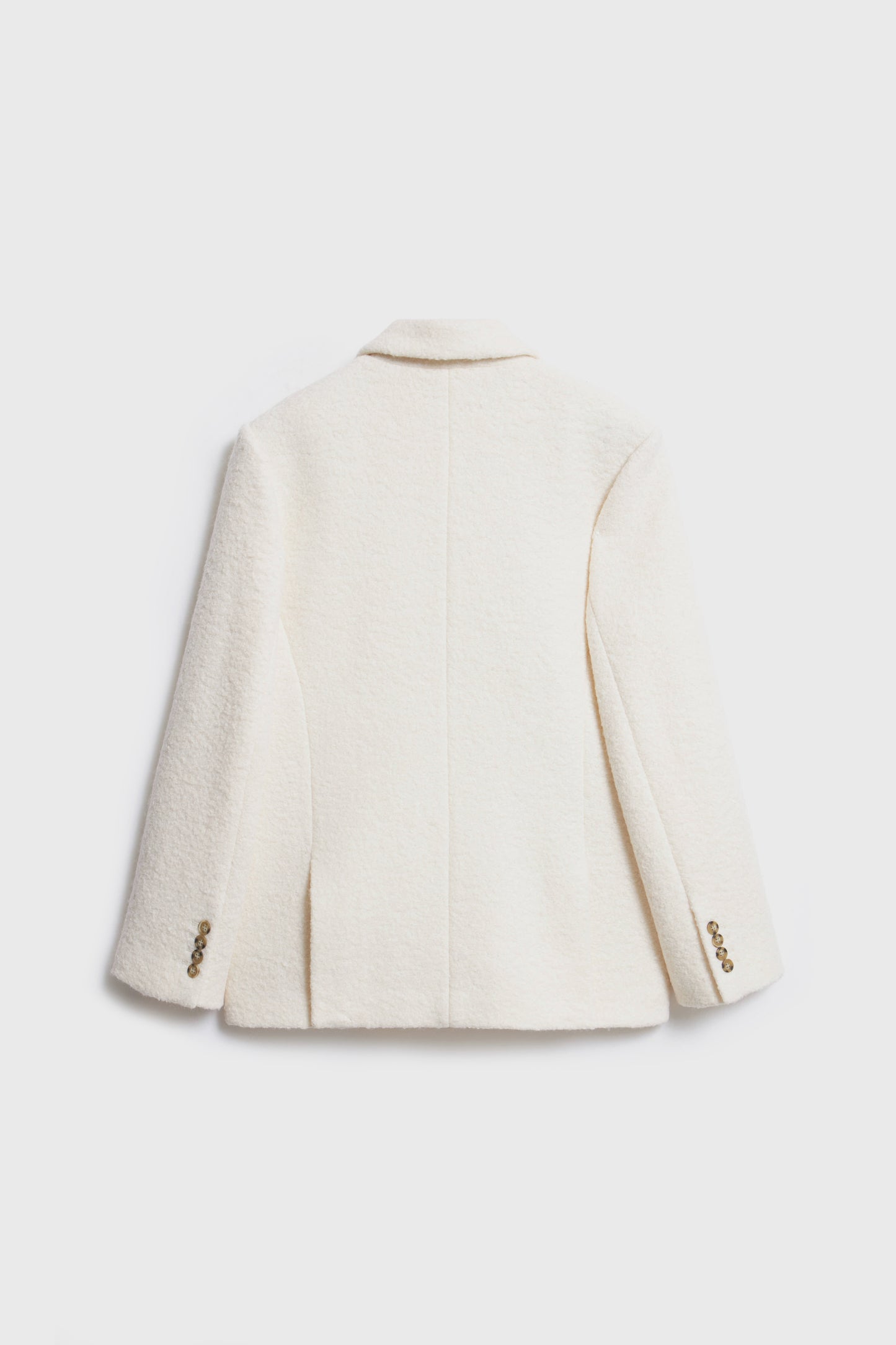 Oversized short coat made of wool blend fabric. Notched lapel collar. Long sleeves with button details on the cuffs, shoulder pads. Chest fake welt pocket and hip flap pockets. Double-breasted front button fastening. Lined.