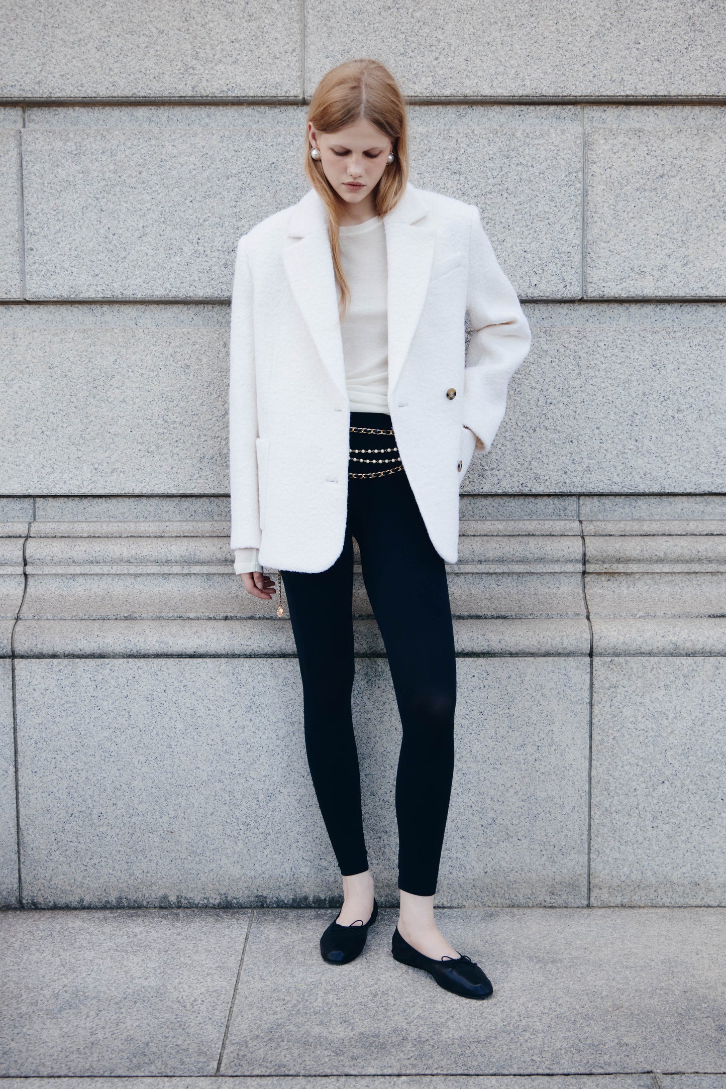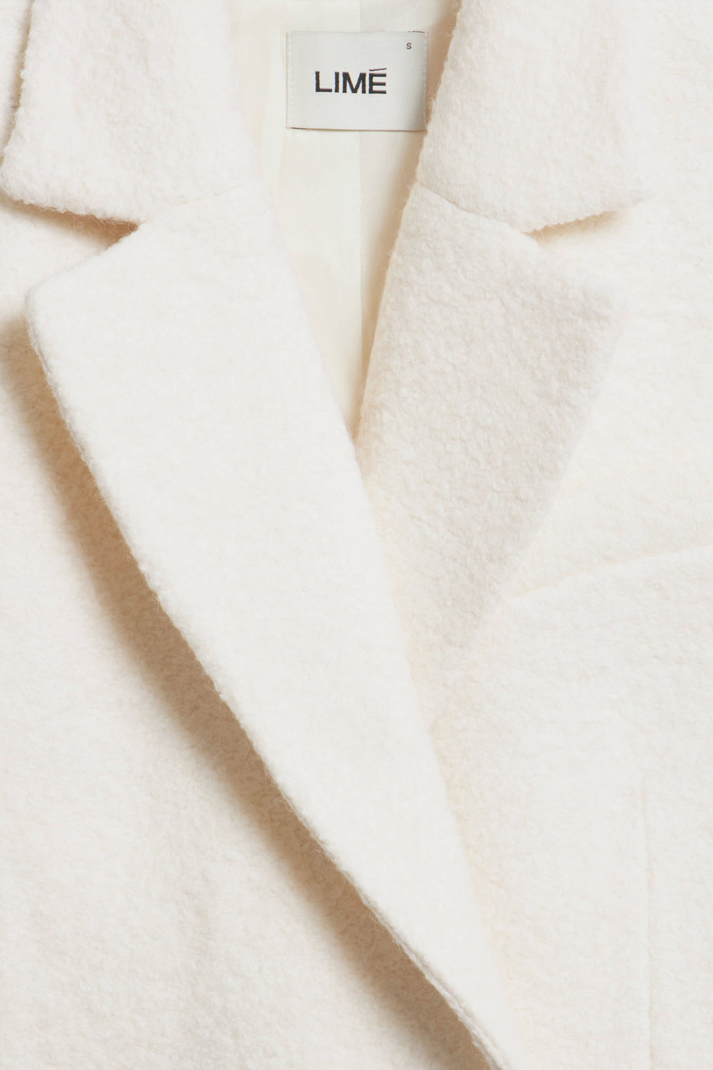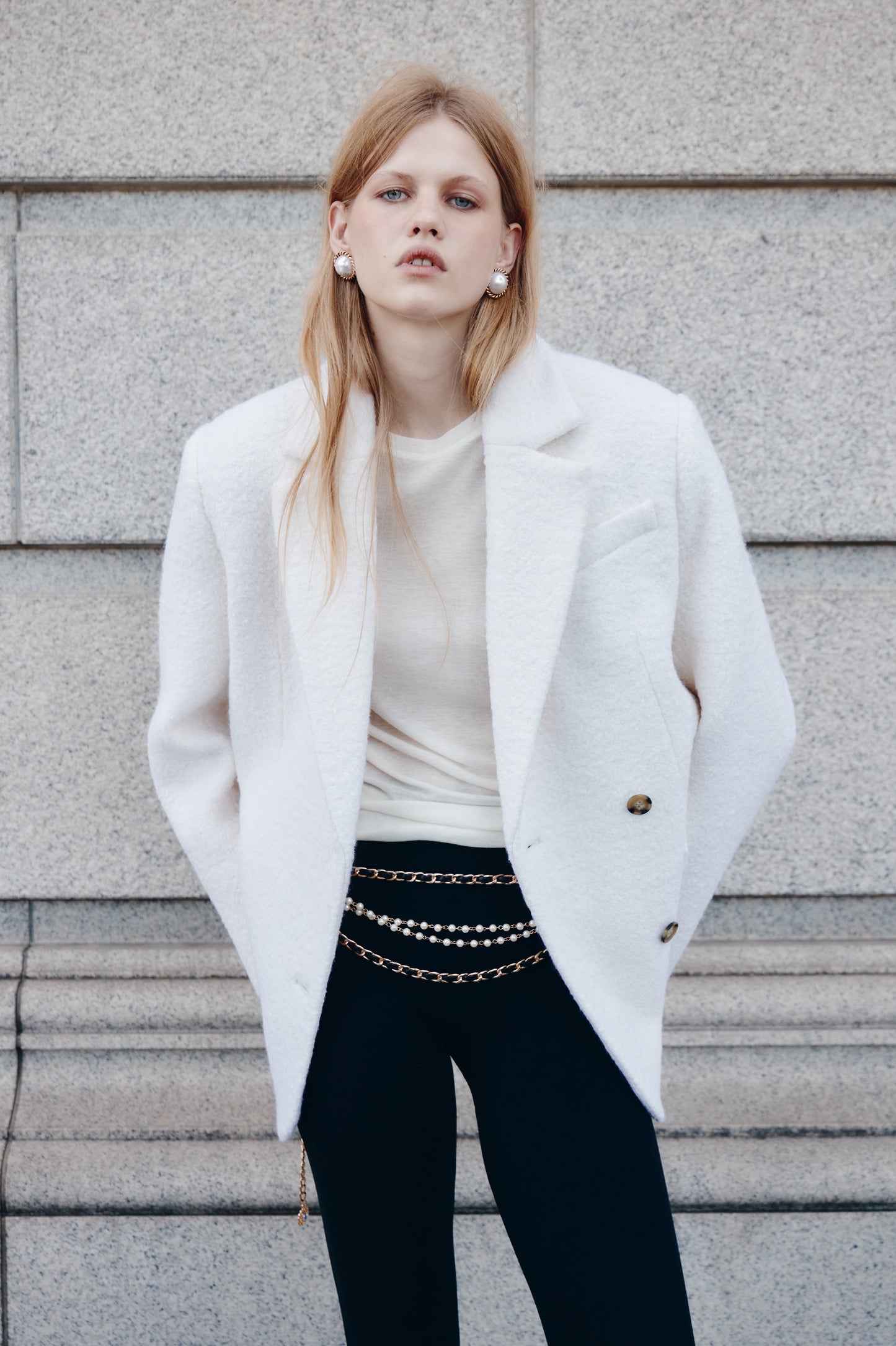 Oversized short coat made of wool blend fabric. Notched lapel collar. Long sleeves with button details on the cuffs, shoulder pads. Chest fake welt pocket and hip flap pockets. Double-breasted front button fastening. Lined.