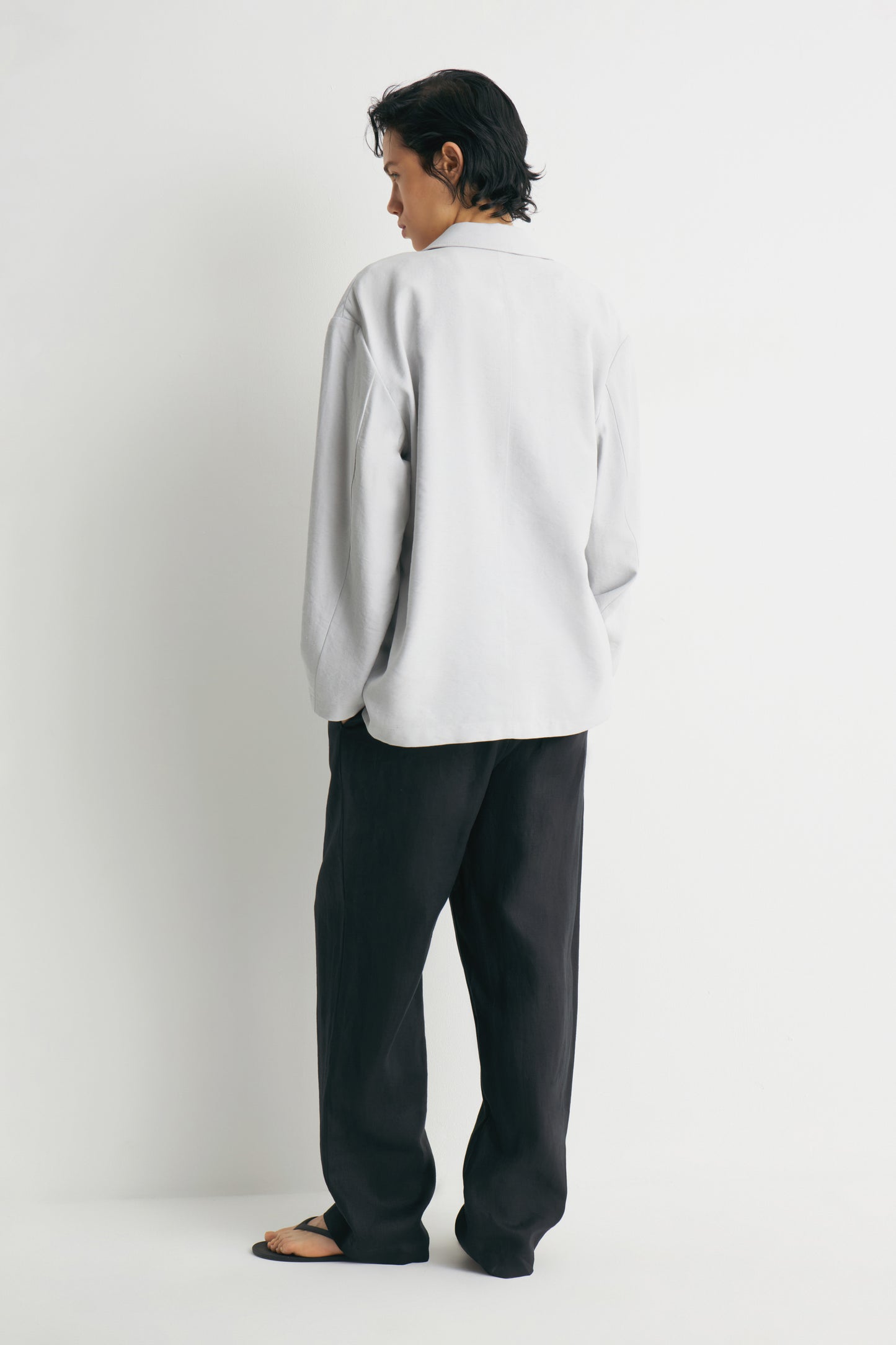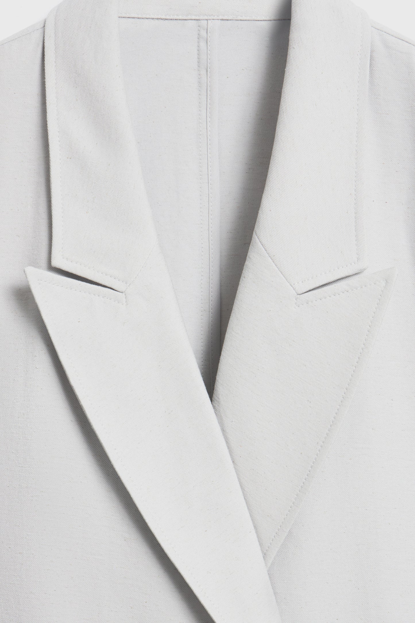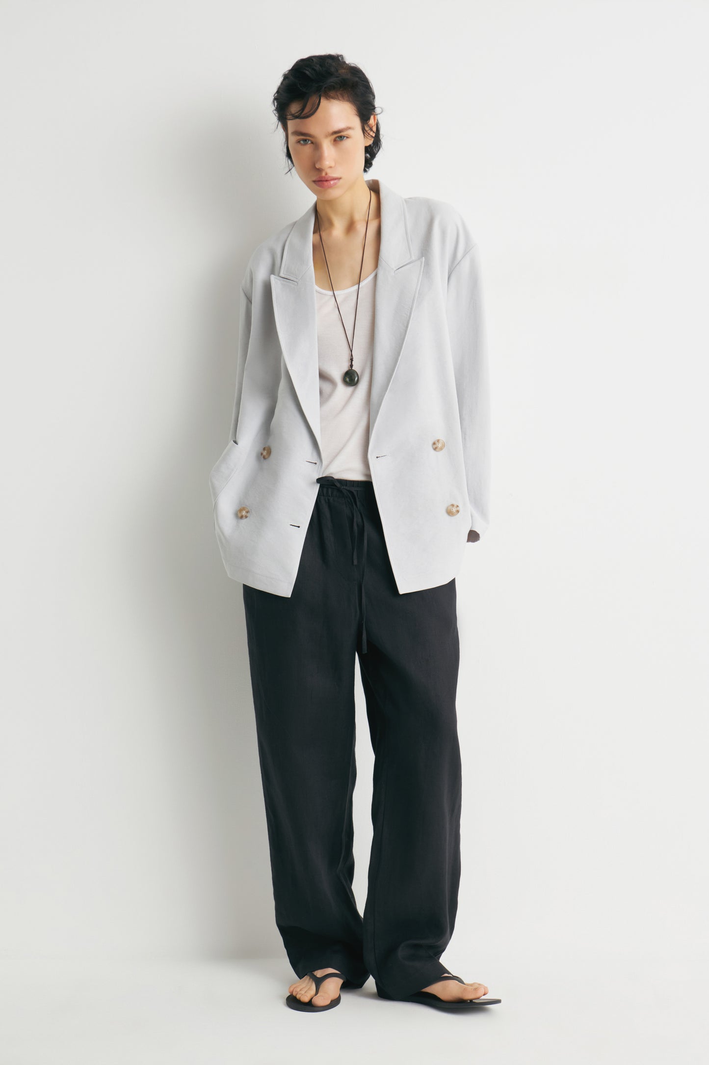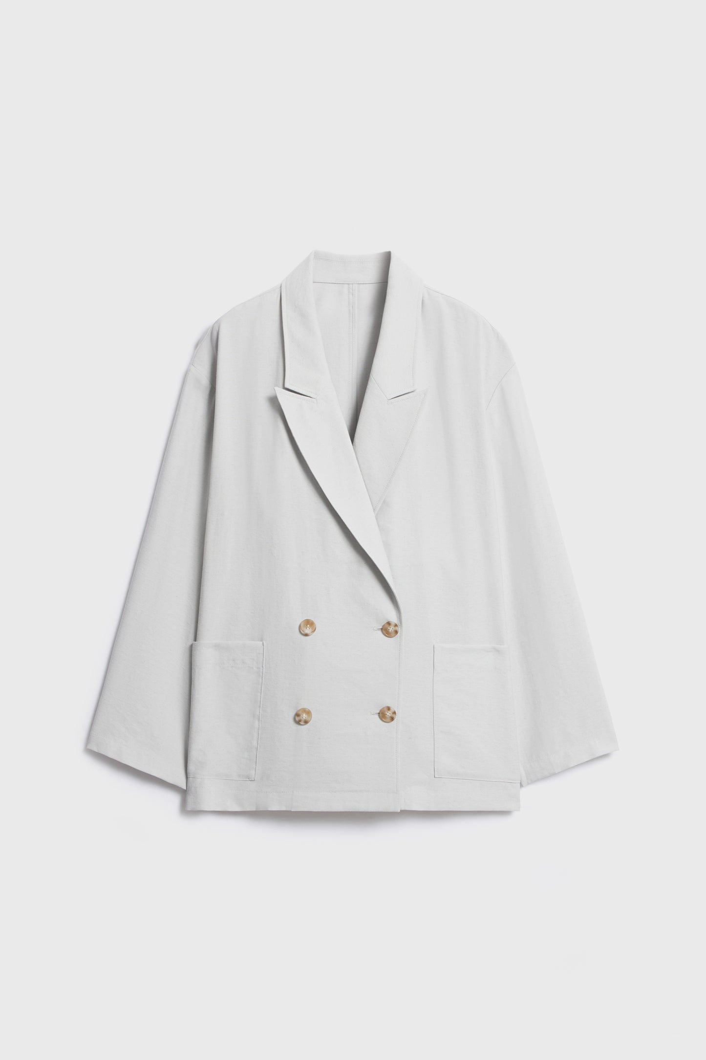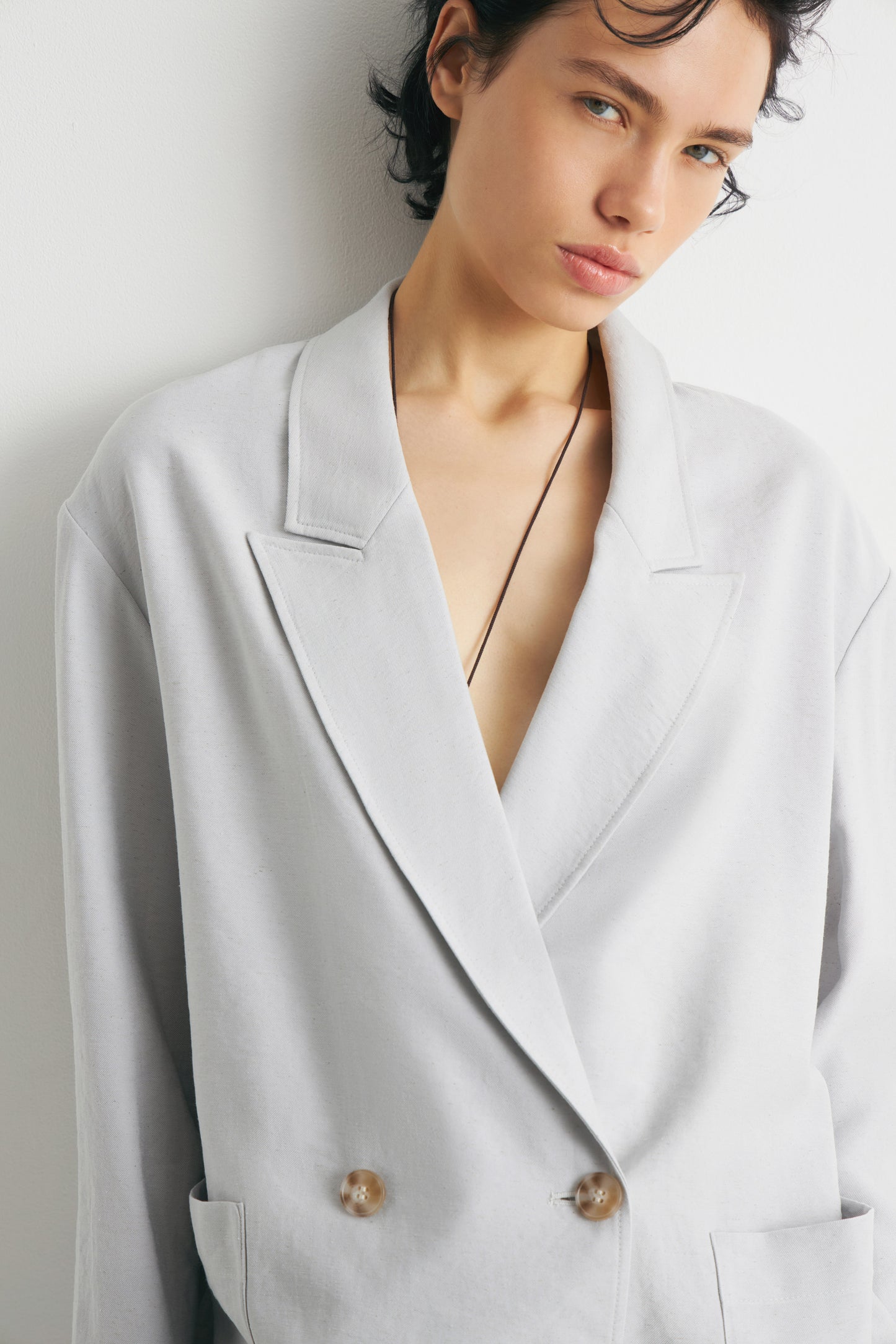 Crafted from viscose and lyocell blend blazer featuring a peaked lapels and long sleeves. Front patch pockets. Double-breasted button fastening. It has an oversize fit.