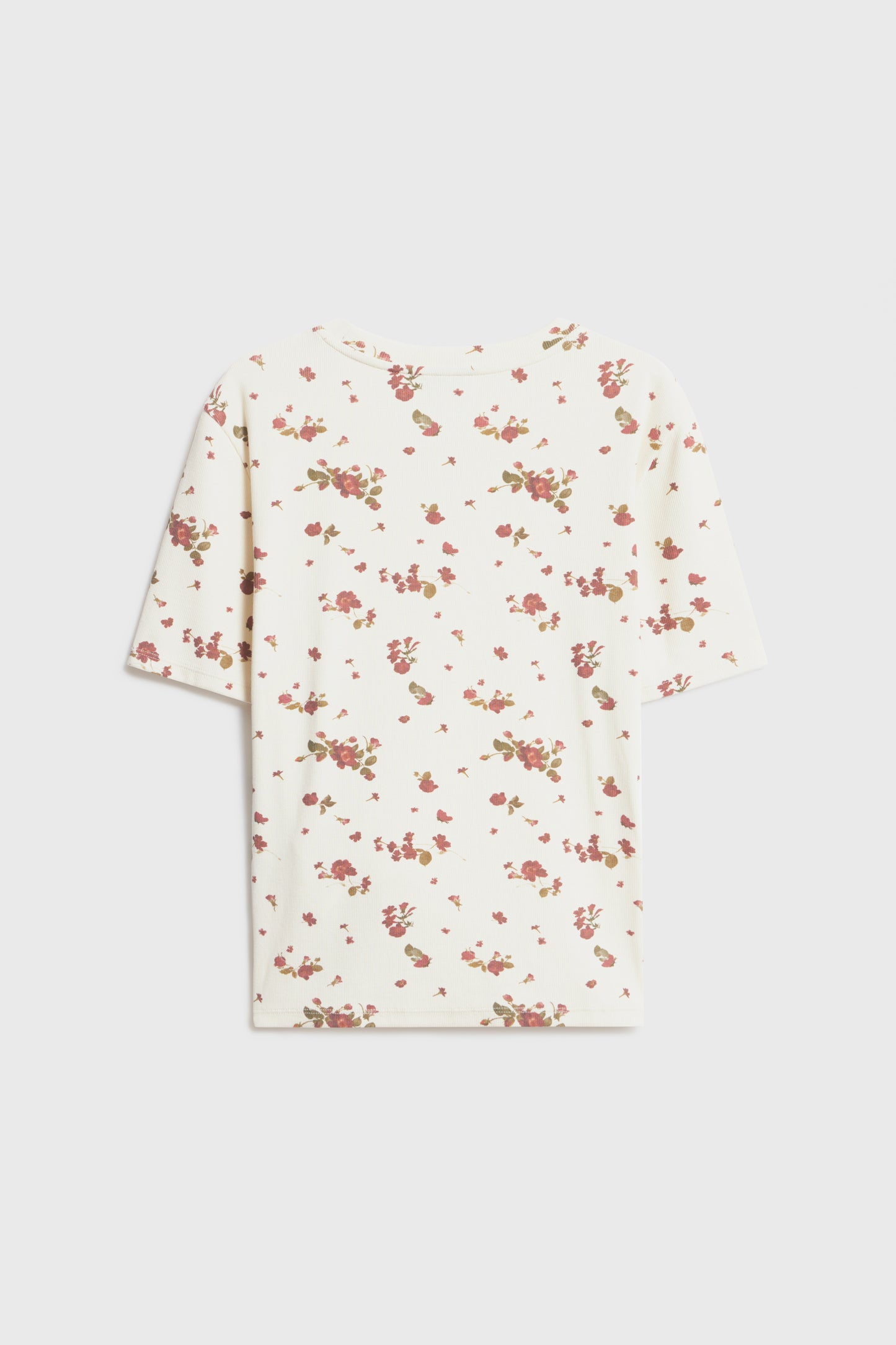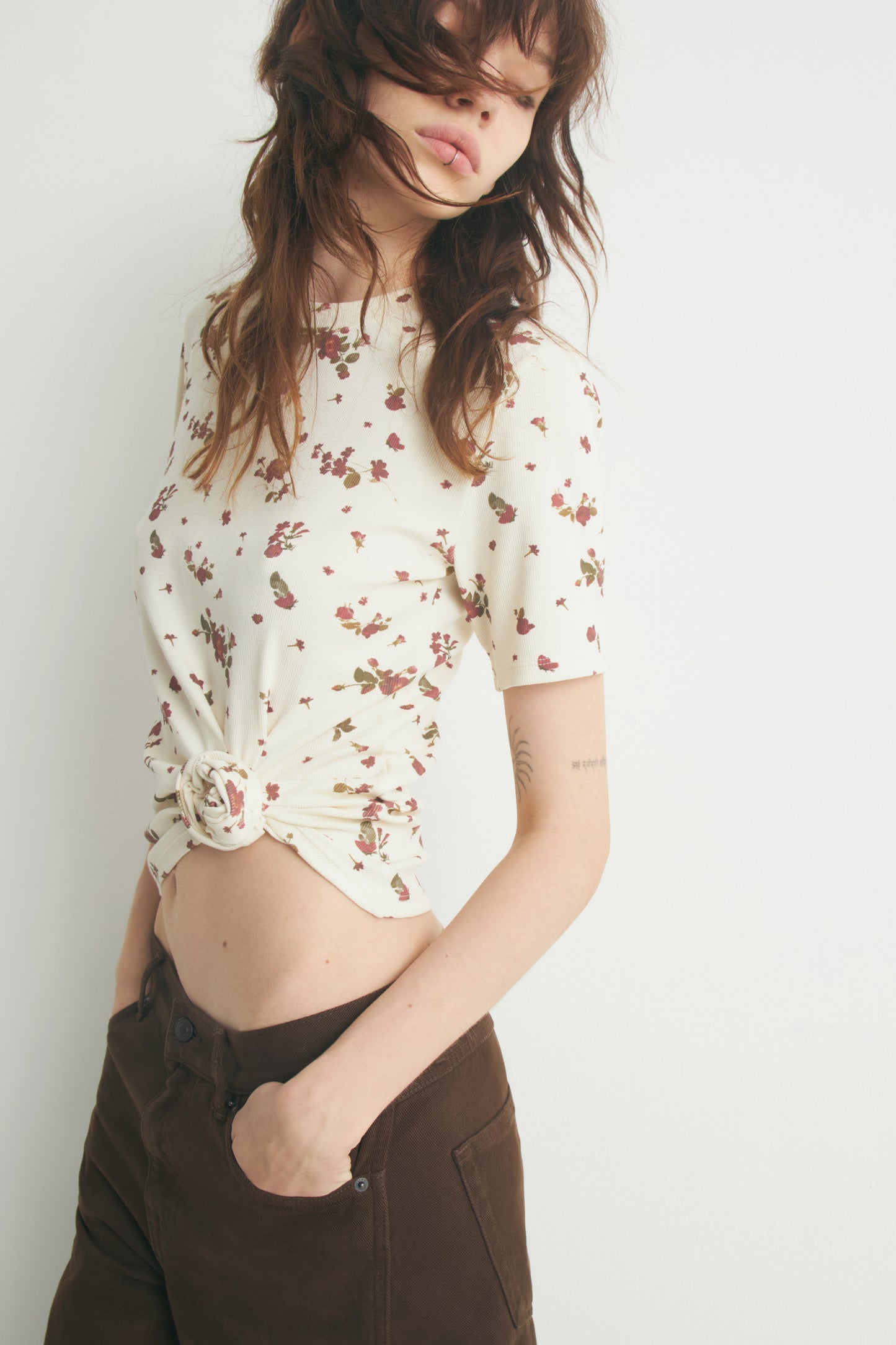 Short, fitted T-shirt in soft, printed jersey made of cotton and viscose with stretch. Round neckline, gathered seam at the hem with delicate flower-look knot, and short sleeves.