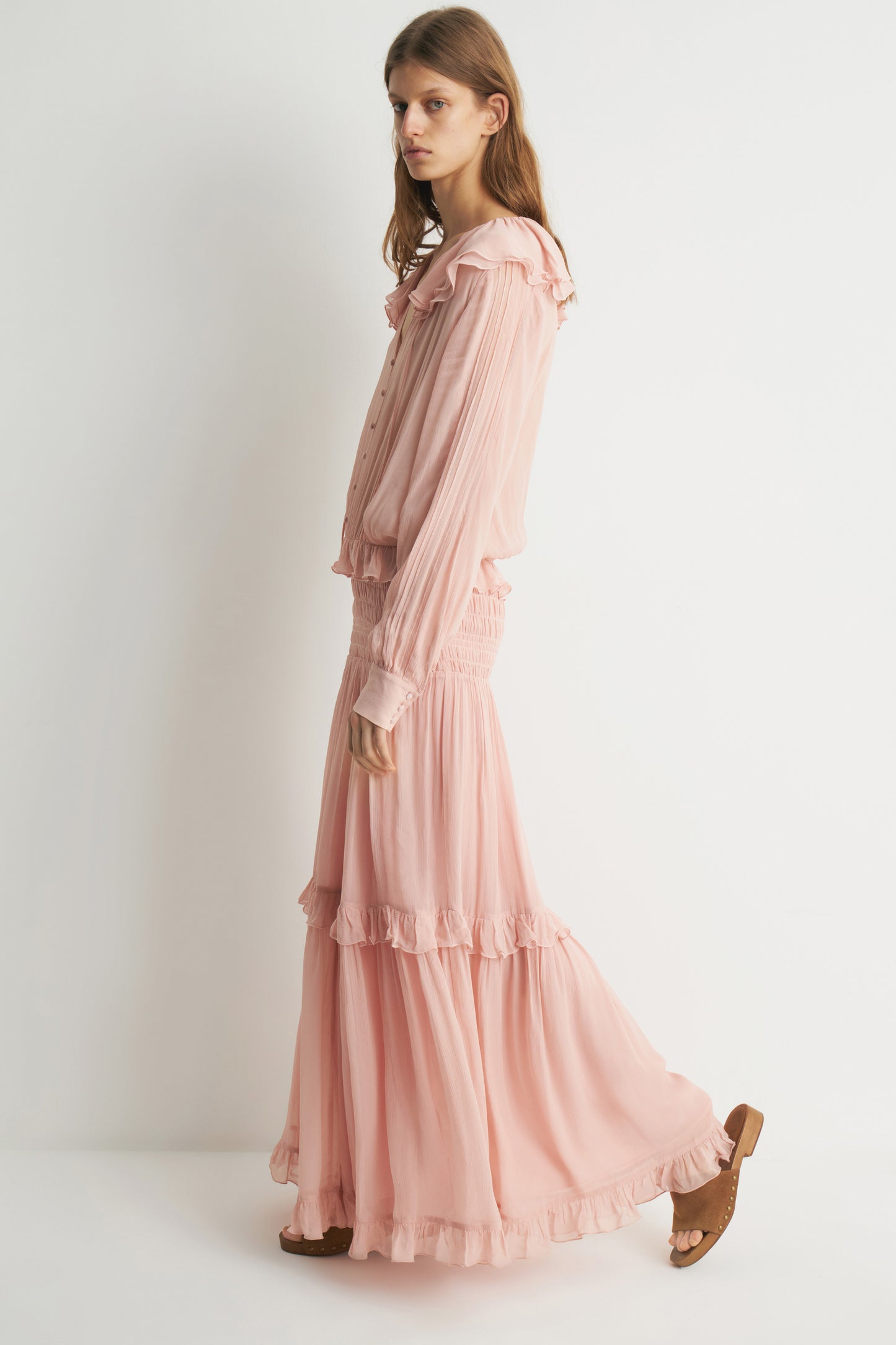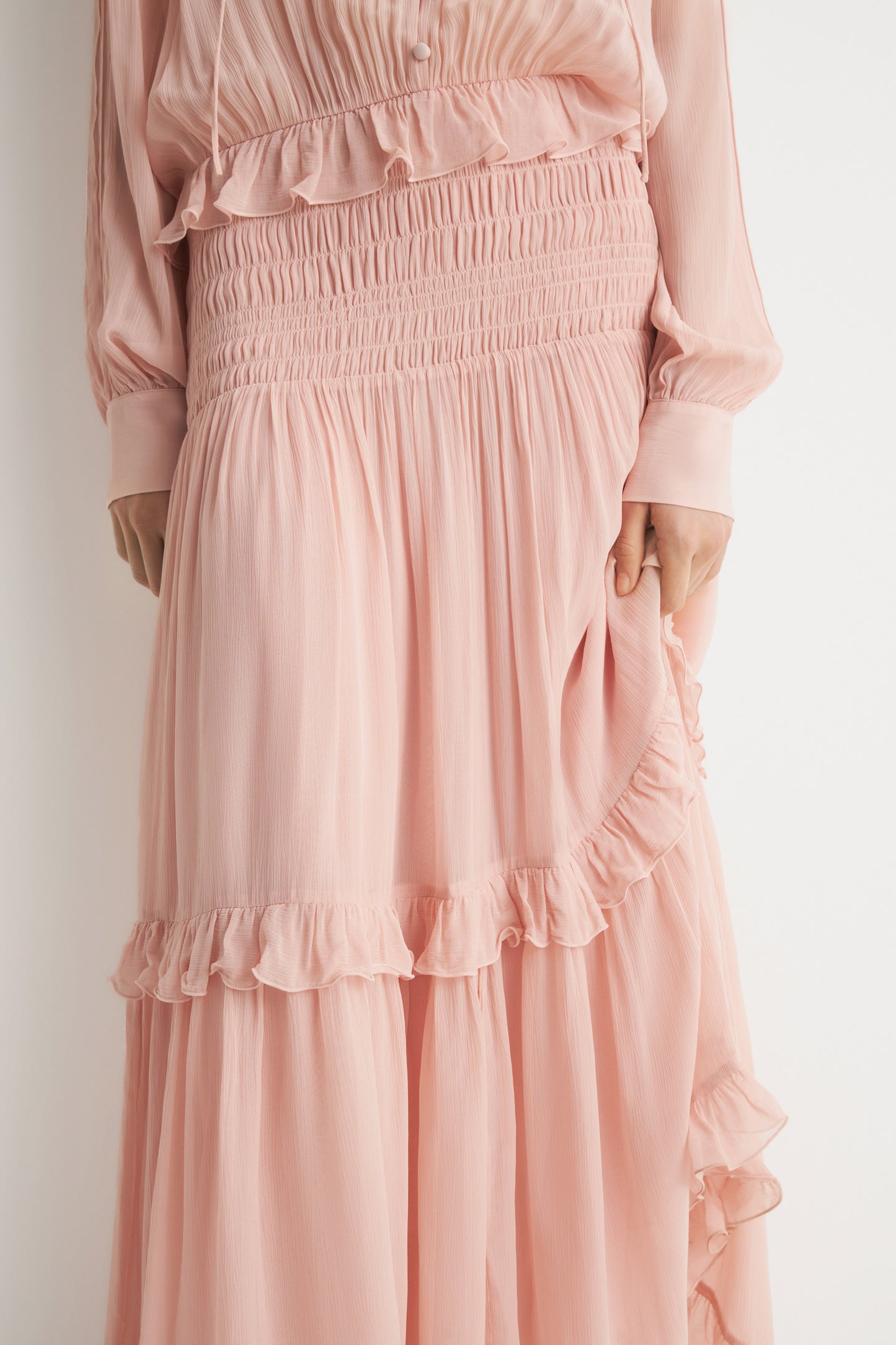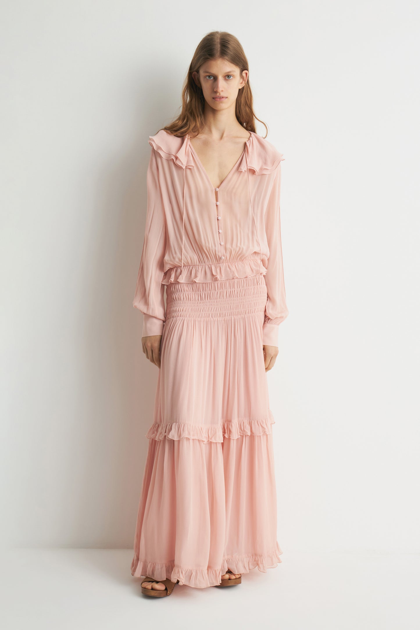 Ankle-length, fitted dress in soft viscose with a frill-trimmed round neck and long sleeves. All-over pleats for a gently draped effect. Covered buttons down the front and buttoned cuffs. Lined.