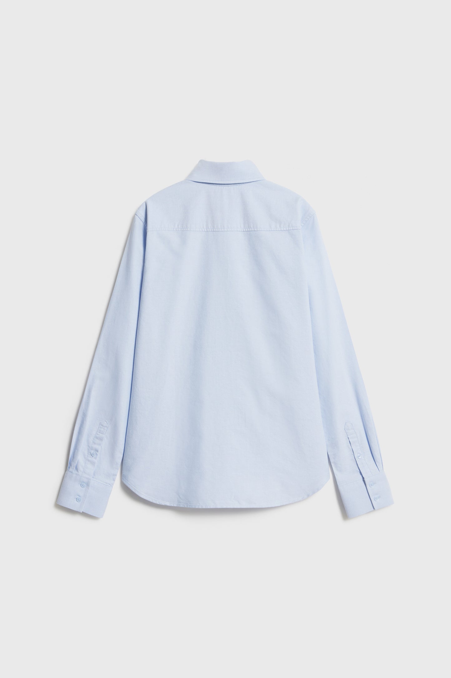 Straight fit shirt with cuffed long sleeves in 100% textured cotton. Featuring a button-down collar embellished with metal flower-shaped beads. Rounded hem. Button-up front.