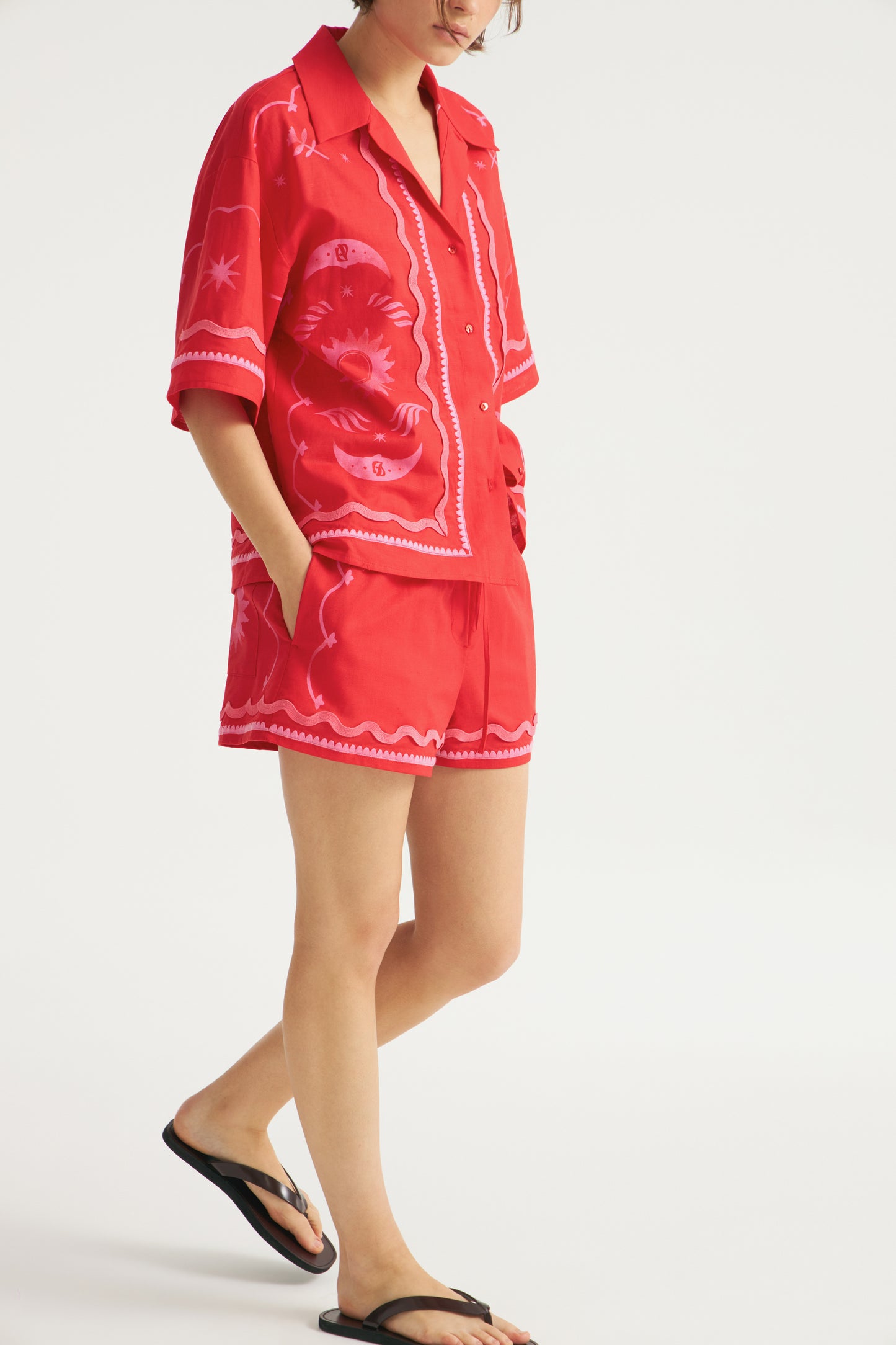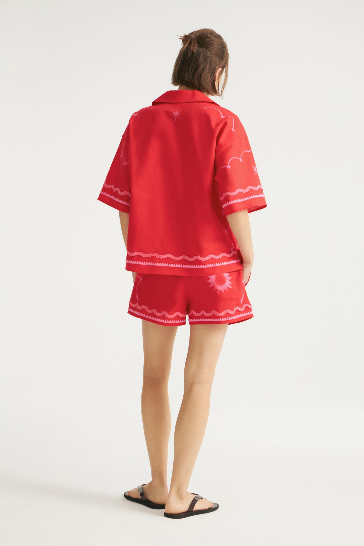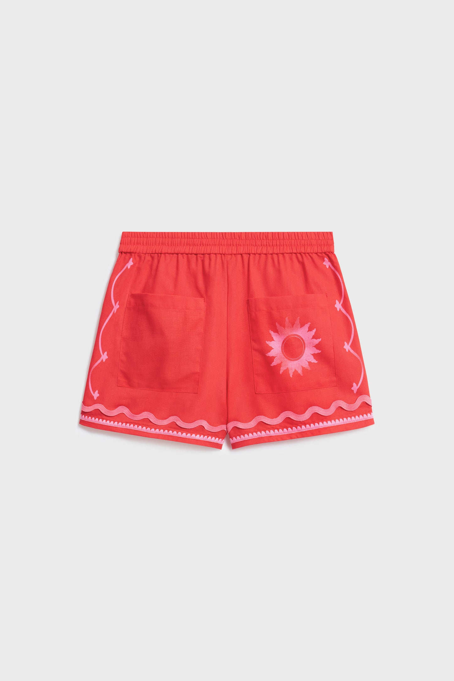 Loose-fit shorts in airy, woven cotton and linen blend with print-motif, contrast embroidery and rick rack trimming. Elasticized drawstring waist, diagonal front pockets and patch back pockets.
