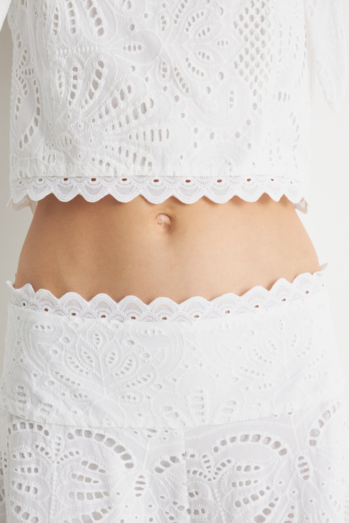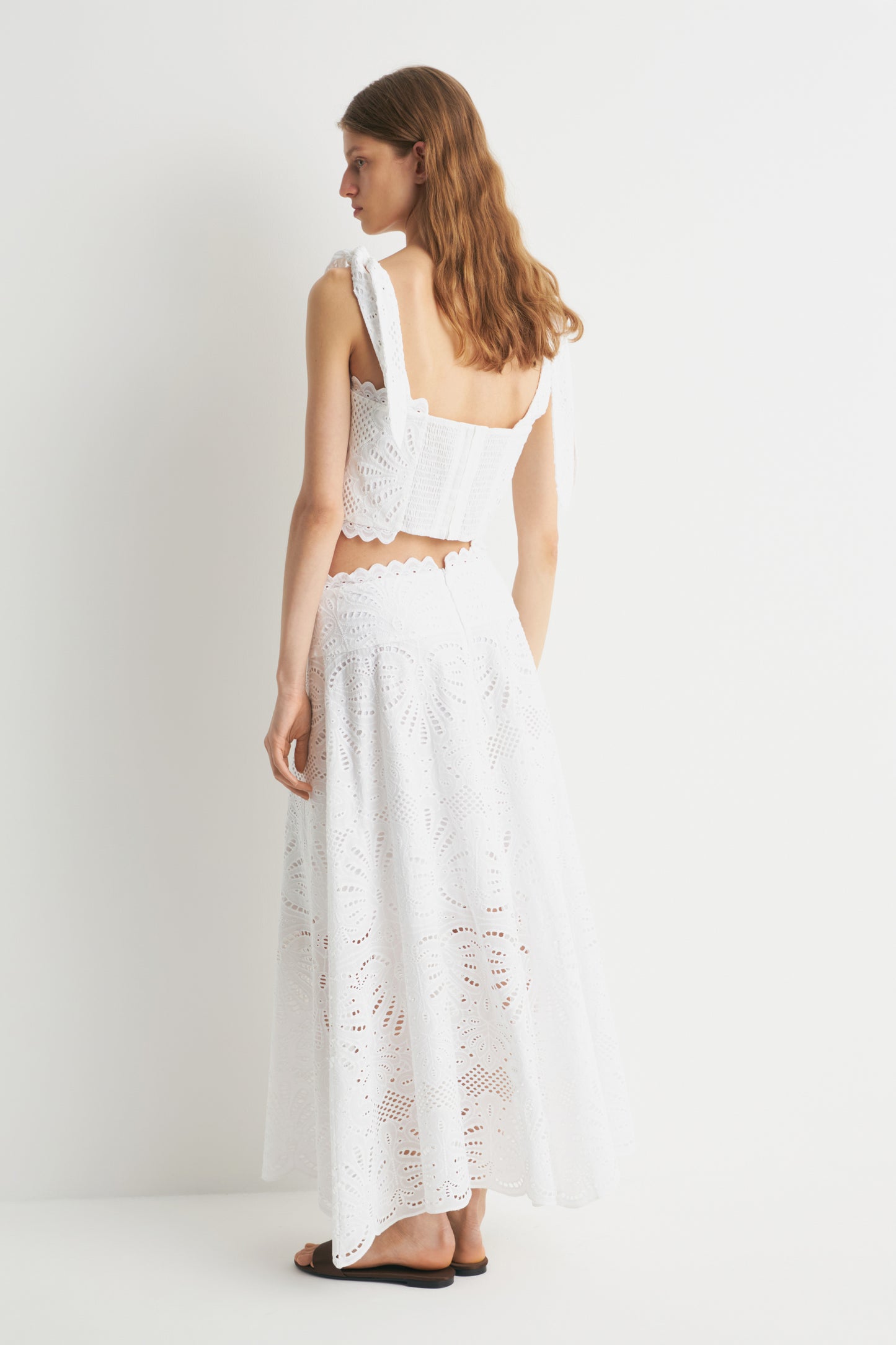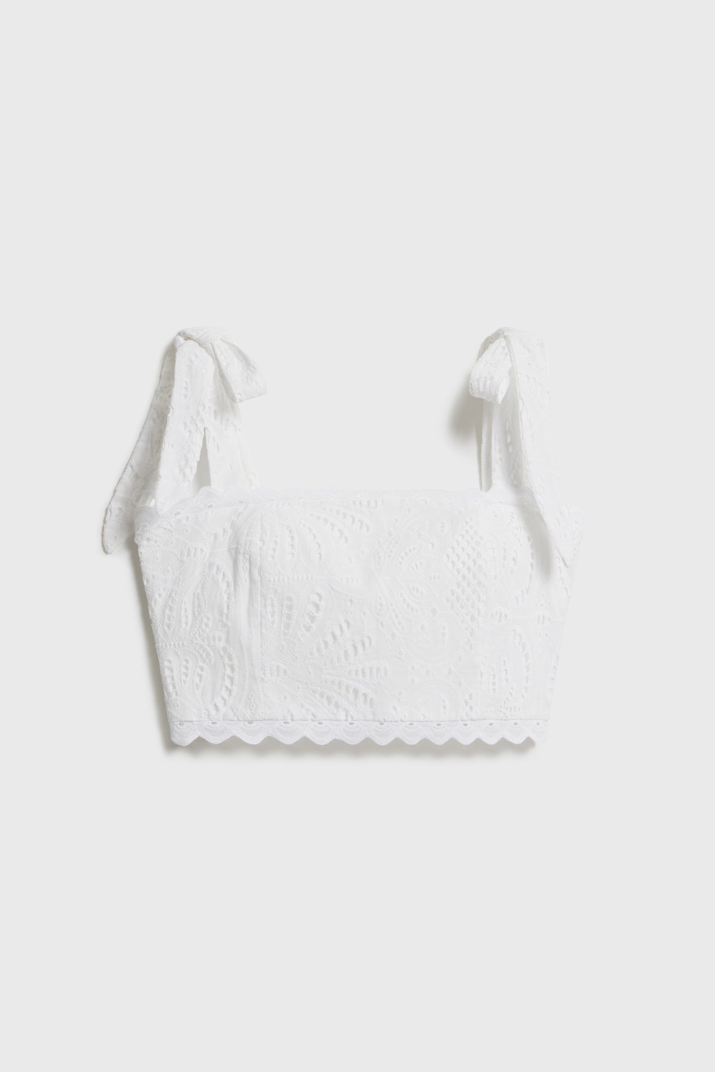 Cropped top with a fitted, smocked bodice in a cotton weave with accent all-over embroidery. Wide tie-top shoulder straps and scalloped edges at the hem and neckline. Lined. Hook-and-eye fastening at the back.