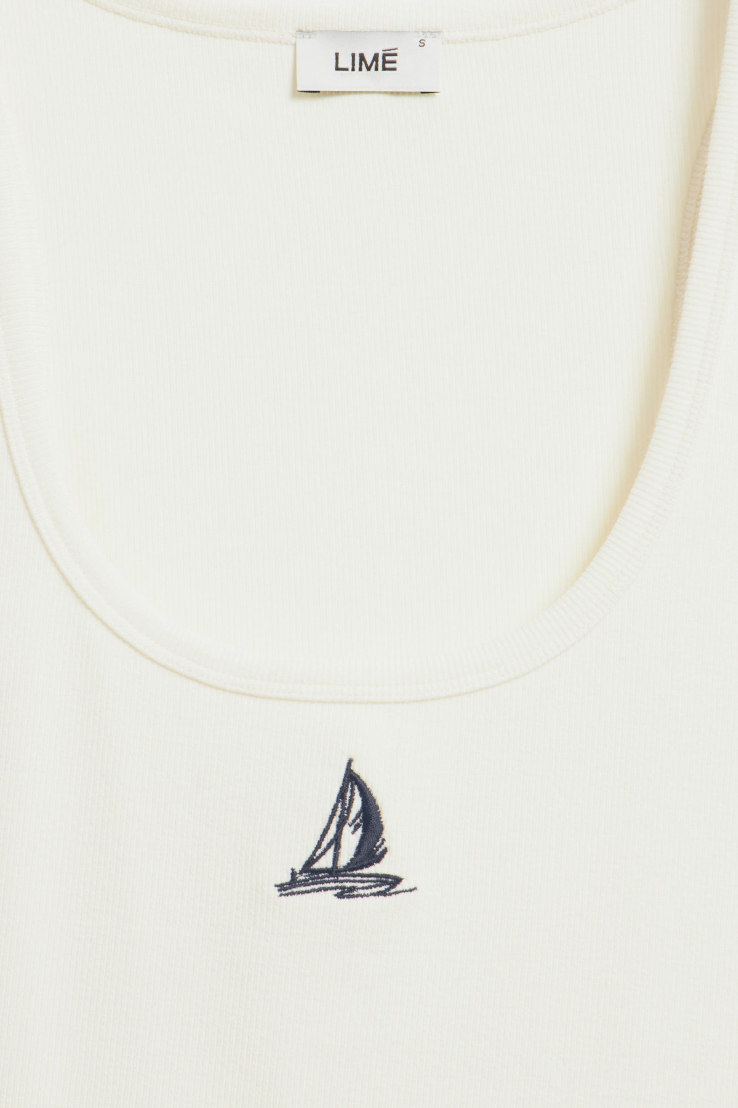 Fitted top in ribbed cotton and viscose jersey with a square neckline. An embroidered motif.