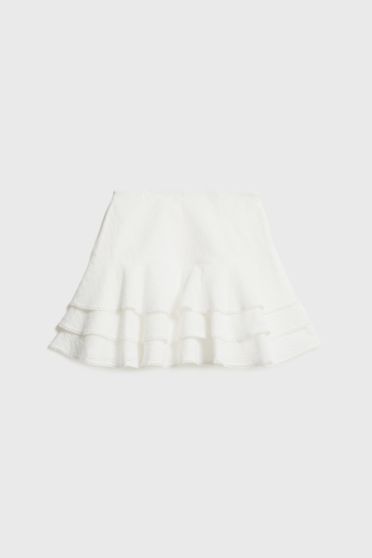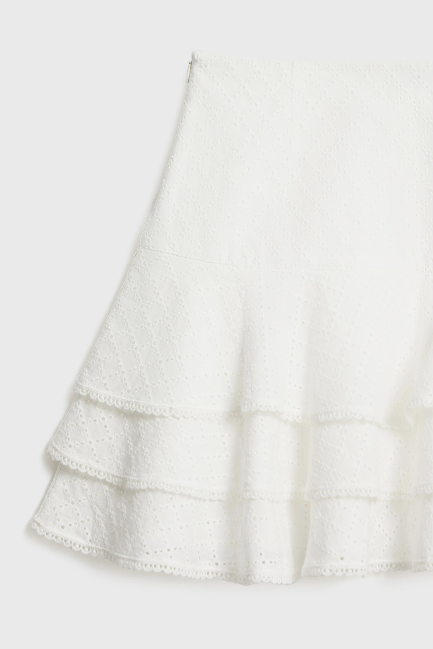 Mini skirt in eyelet-embroidered woven cotton. A concealed zip at the back and a flared hem with tiers. Lined.