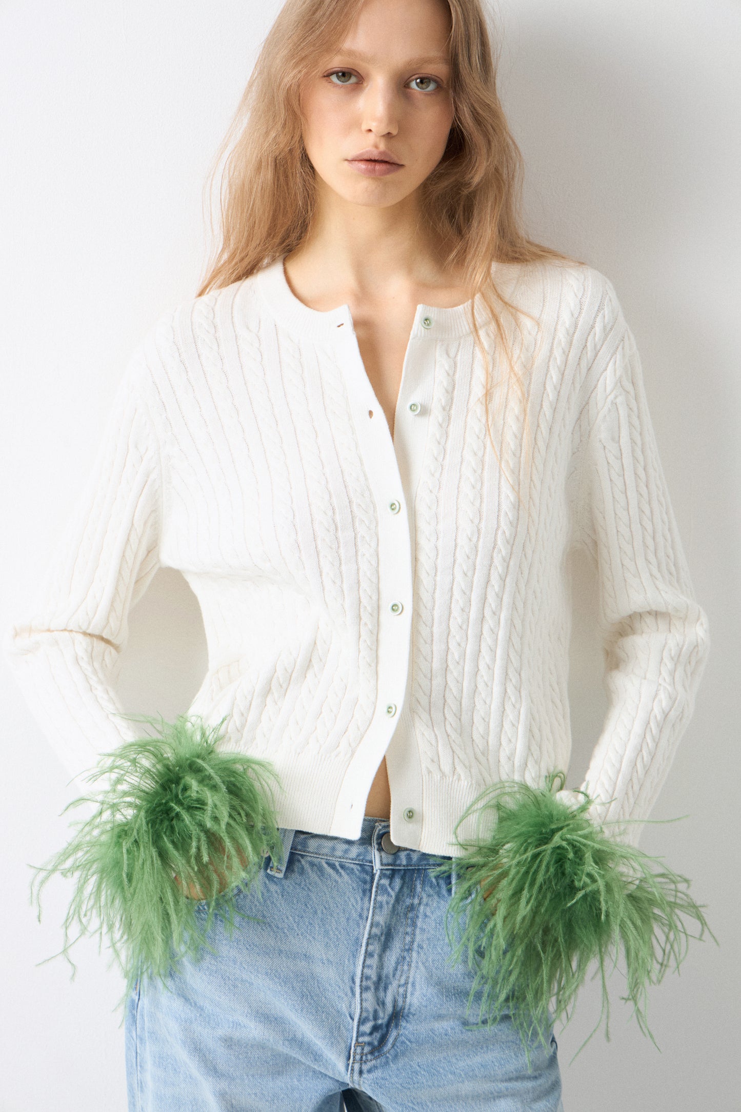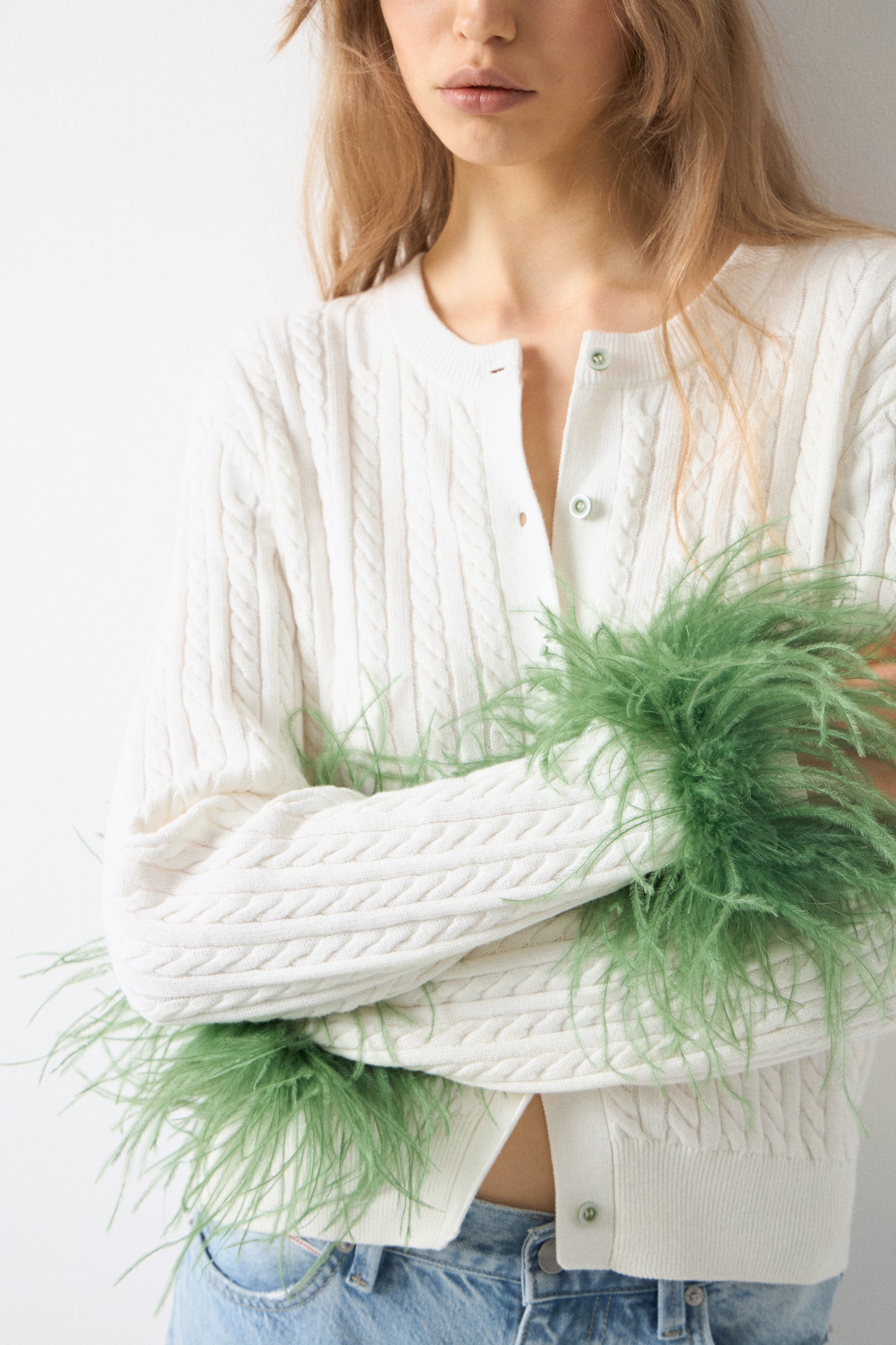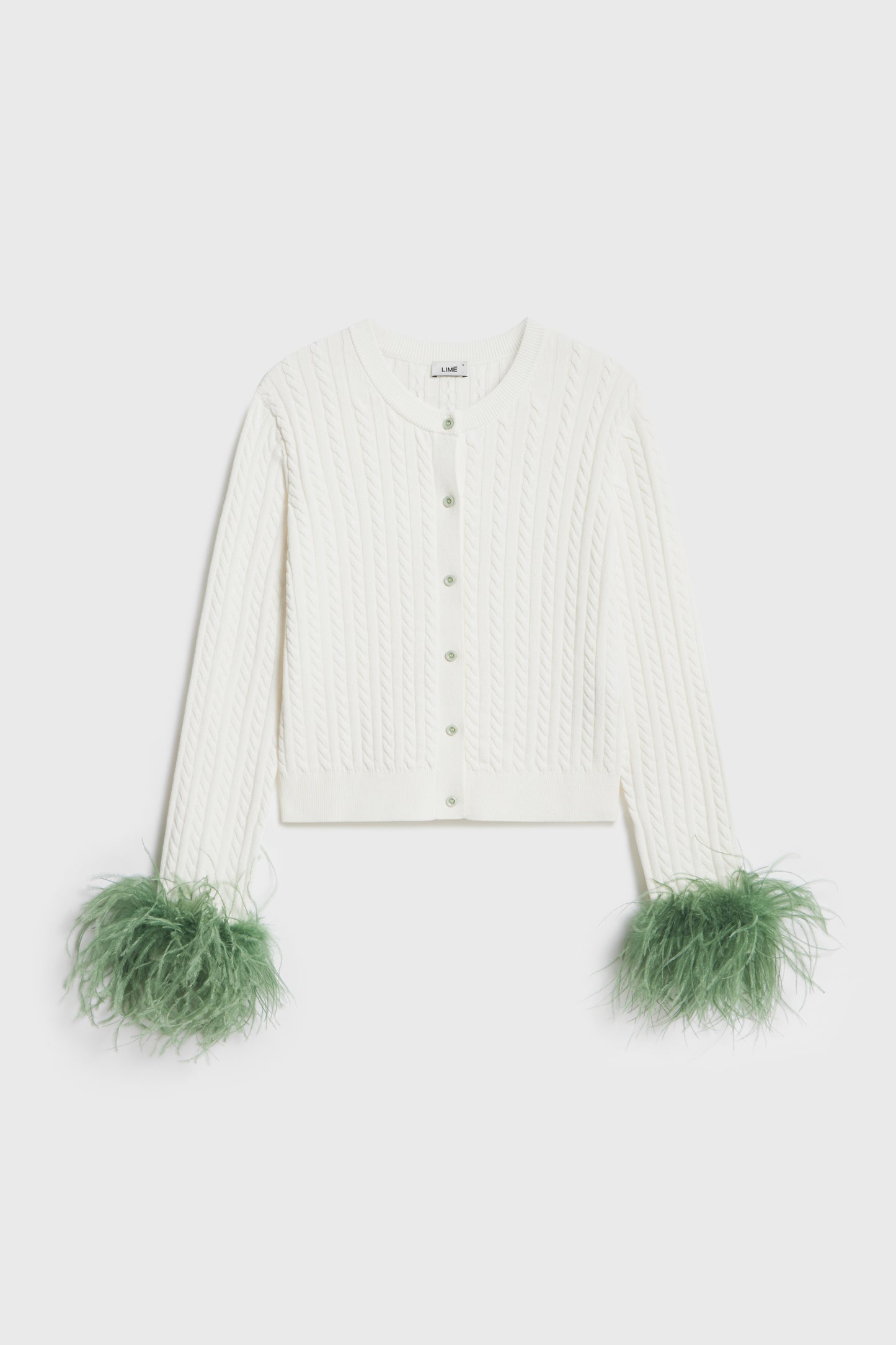 Fitted cardigan in a soft knit made of cotton. Features a round neck, long sleeves and front closure with buttons. Finished with feather detailing along the cuffs.