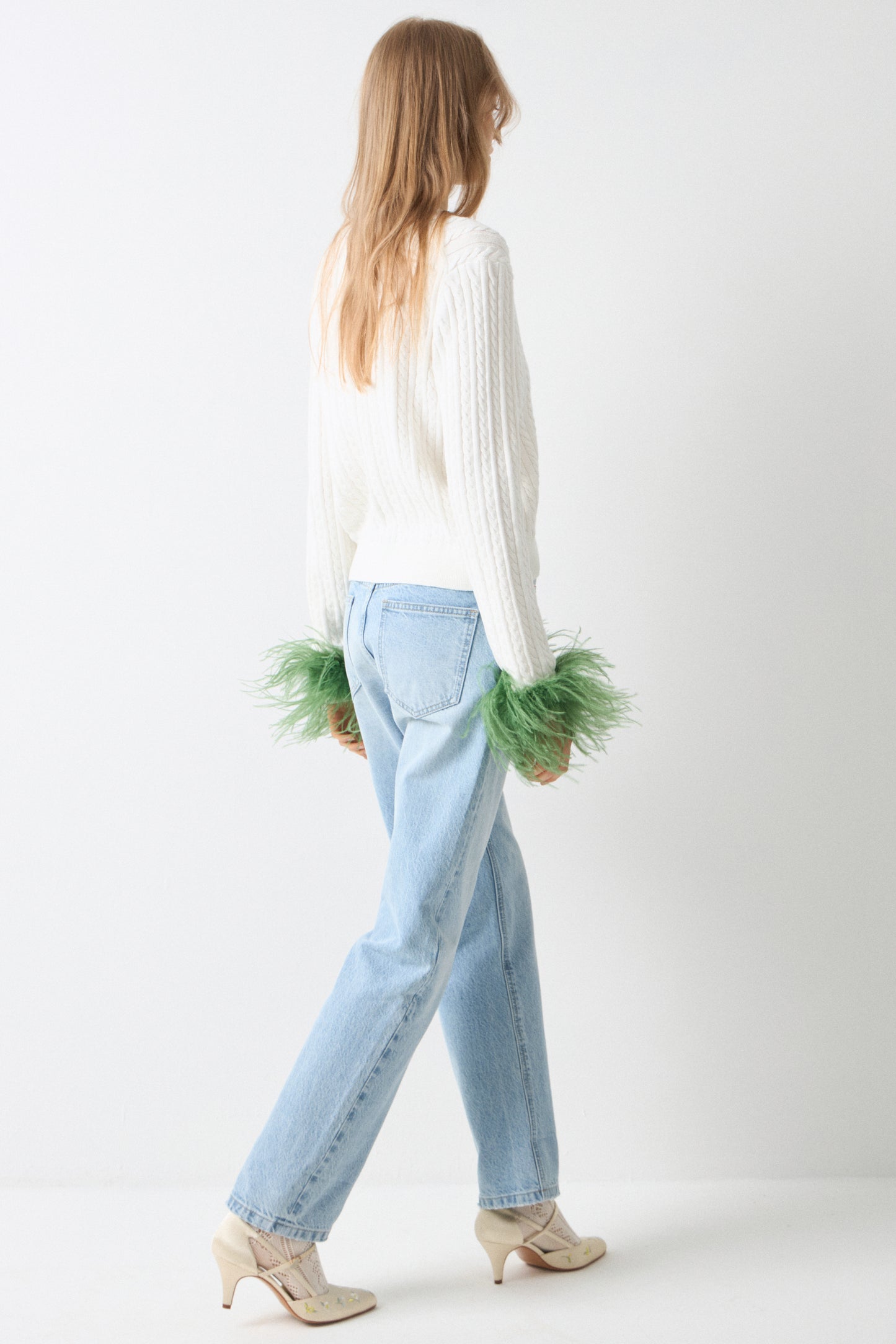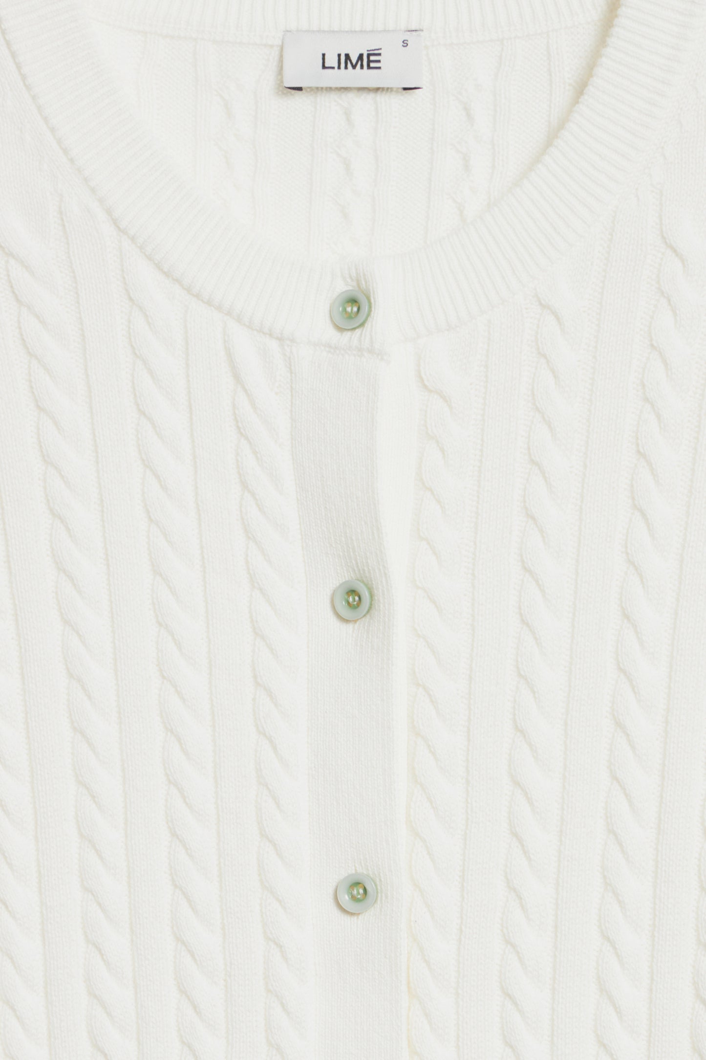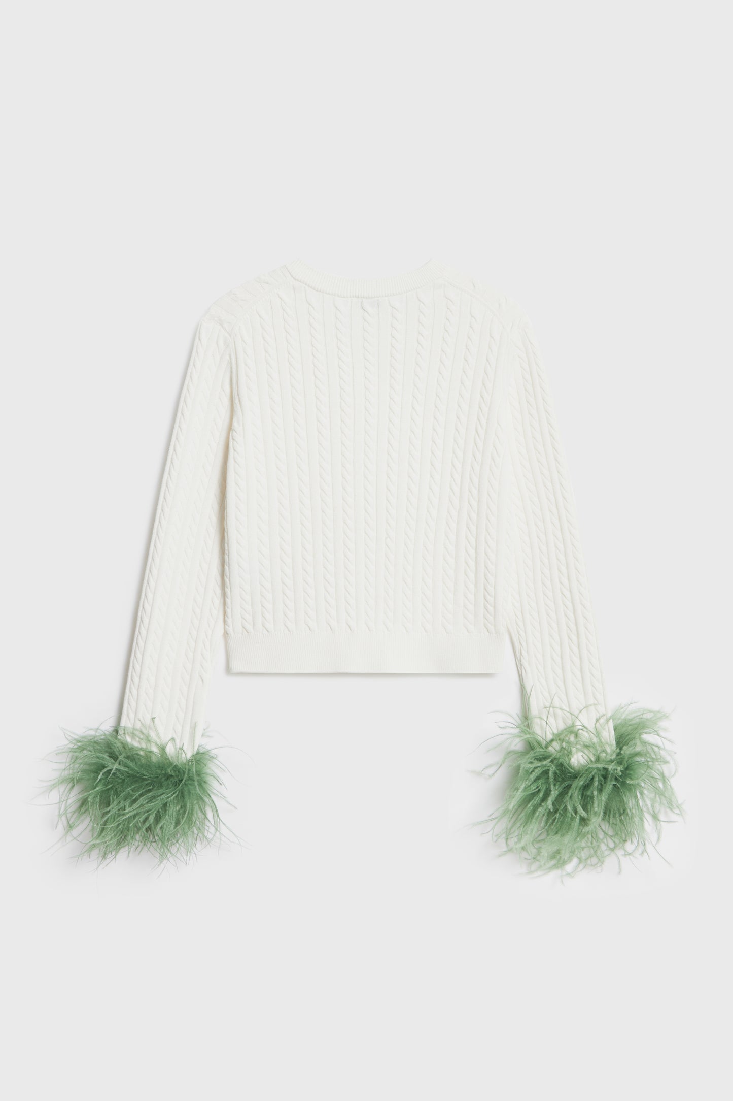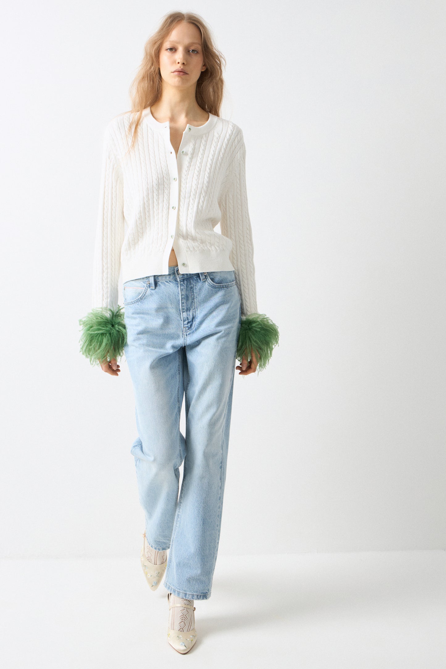 Fitted cardigan in a soft knit made of cotton. Features a round neck, long sleeves and front closure with buttons. Finished with feather detailing along the cuffs.
