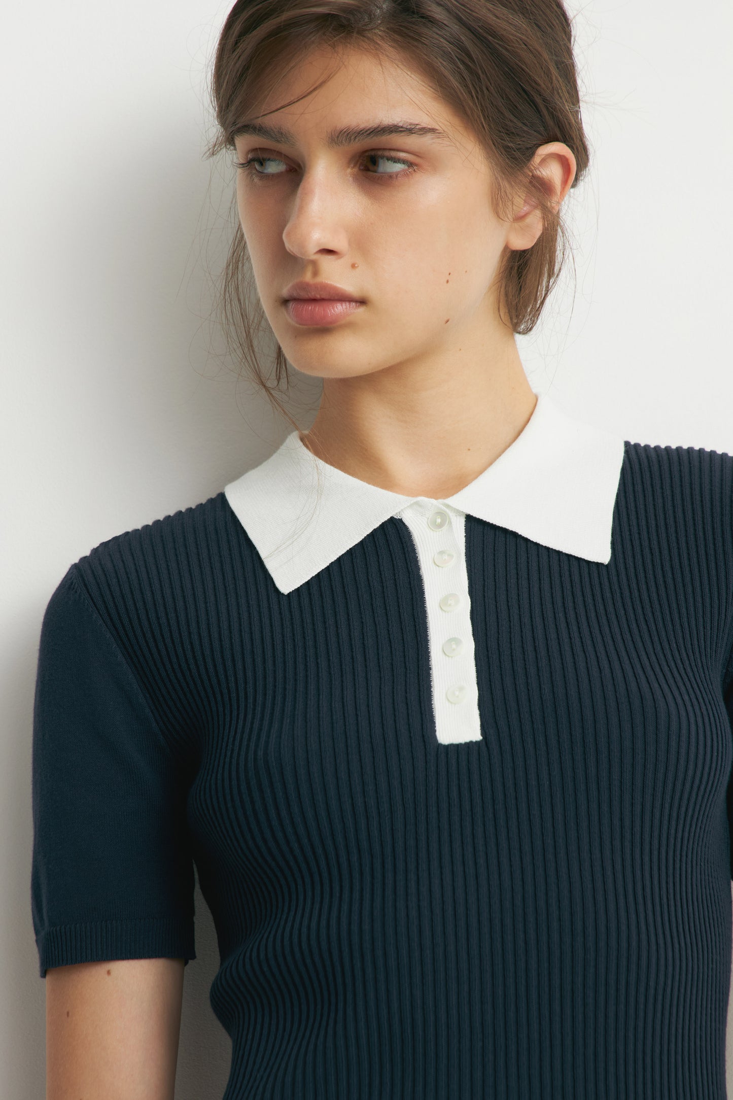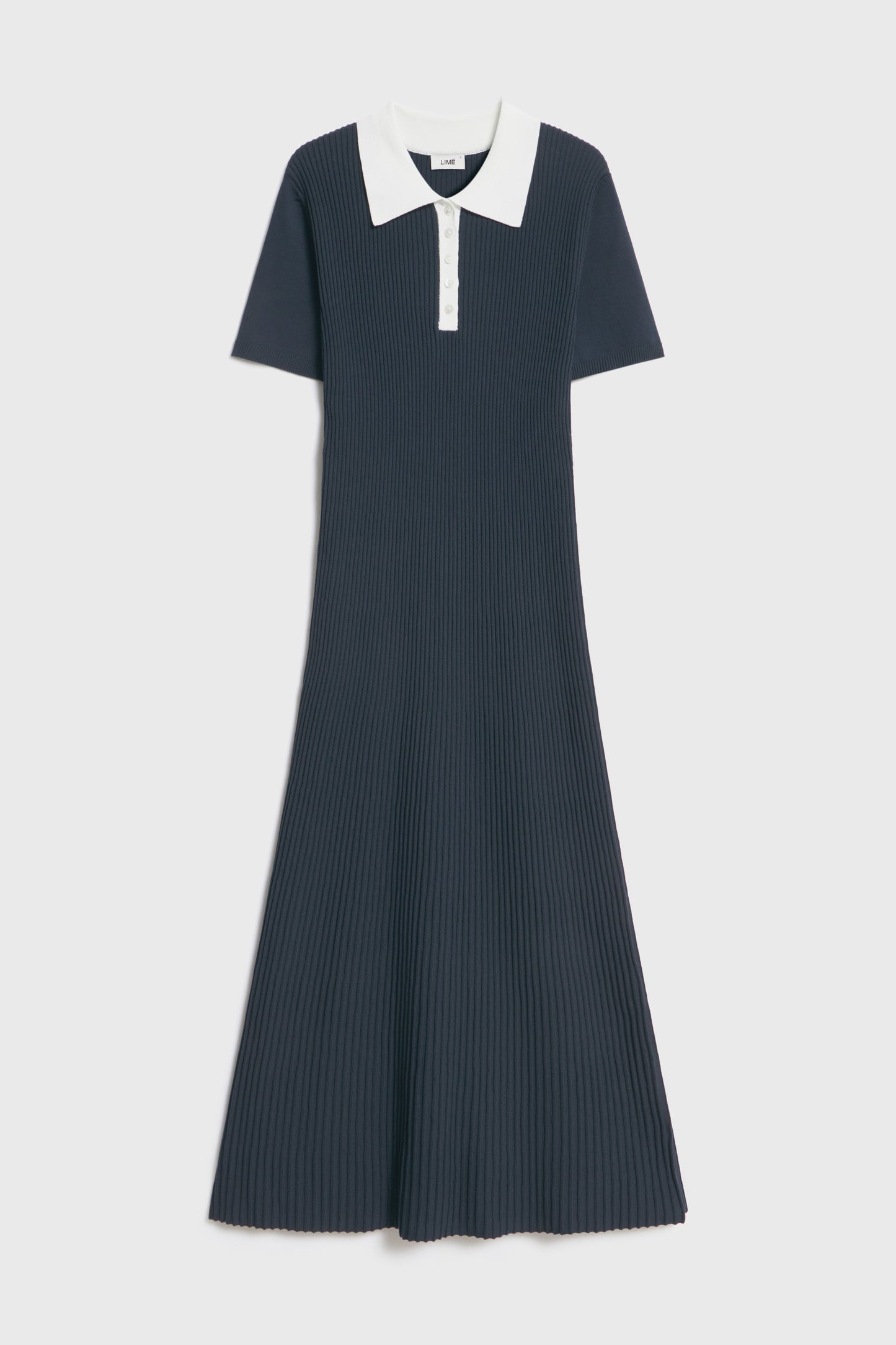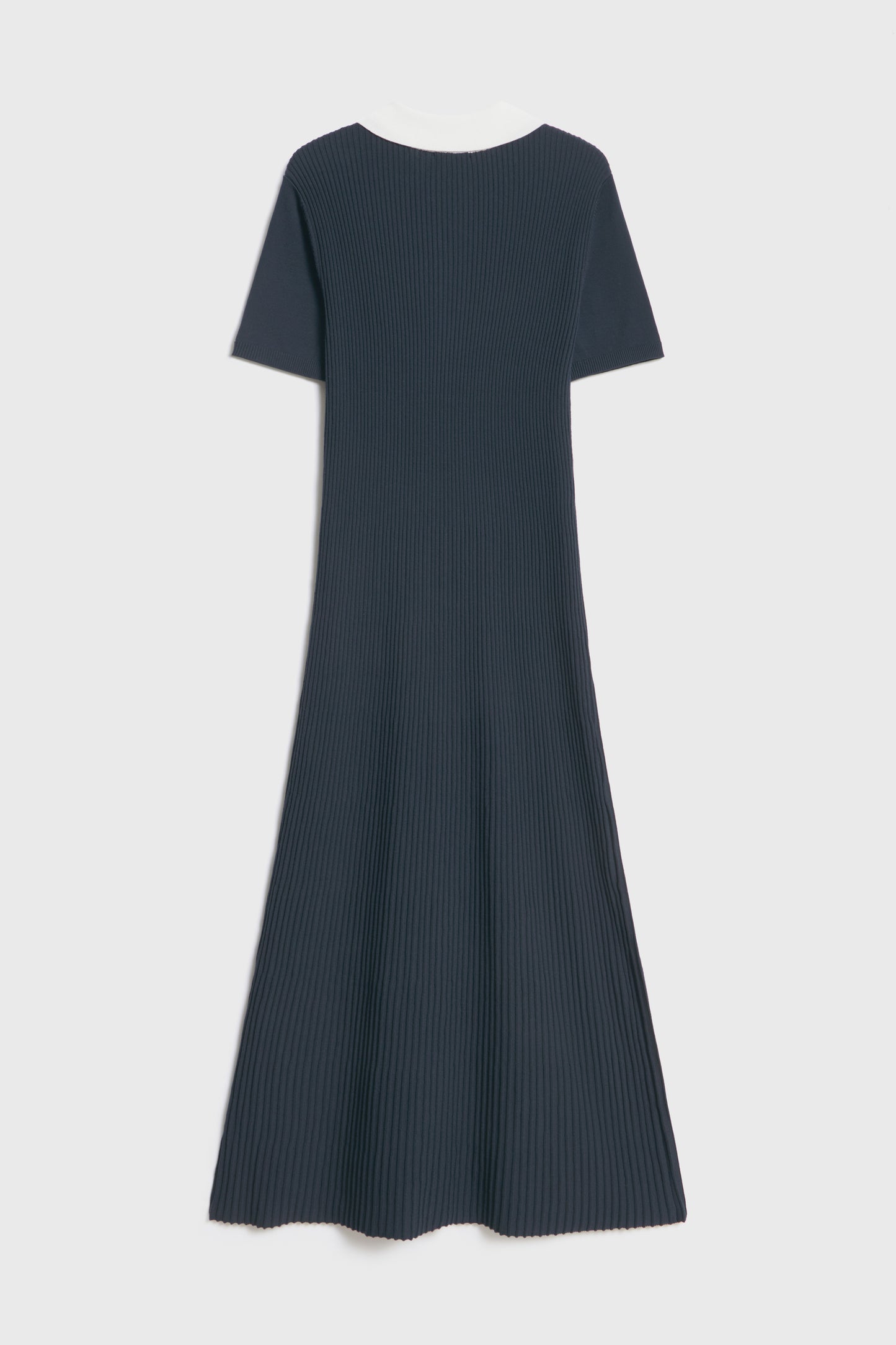 Calf-length, fitted dress in a soft, fine knit cotton with a collar, button placket and short sleeves.