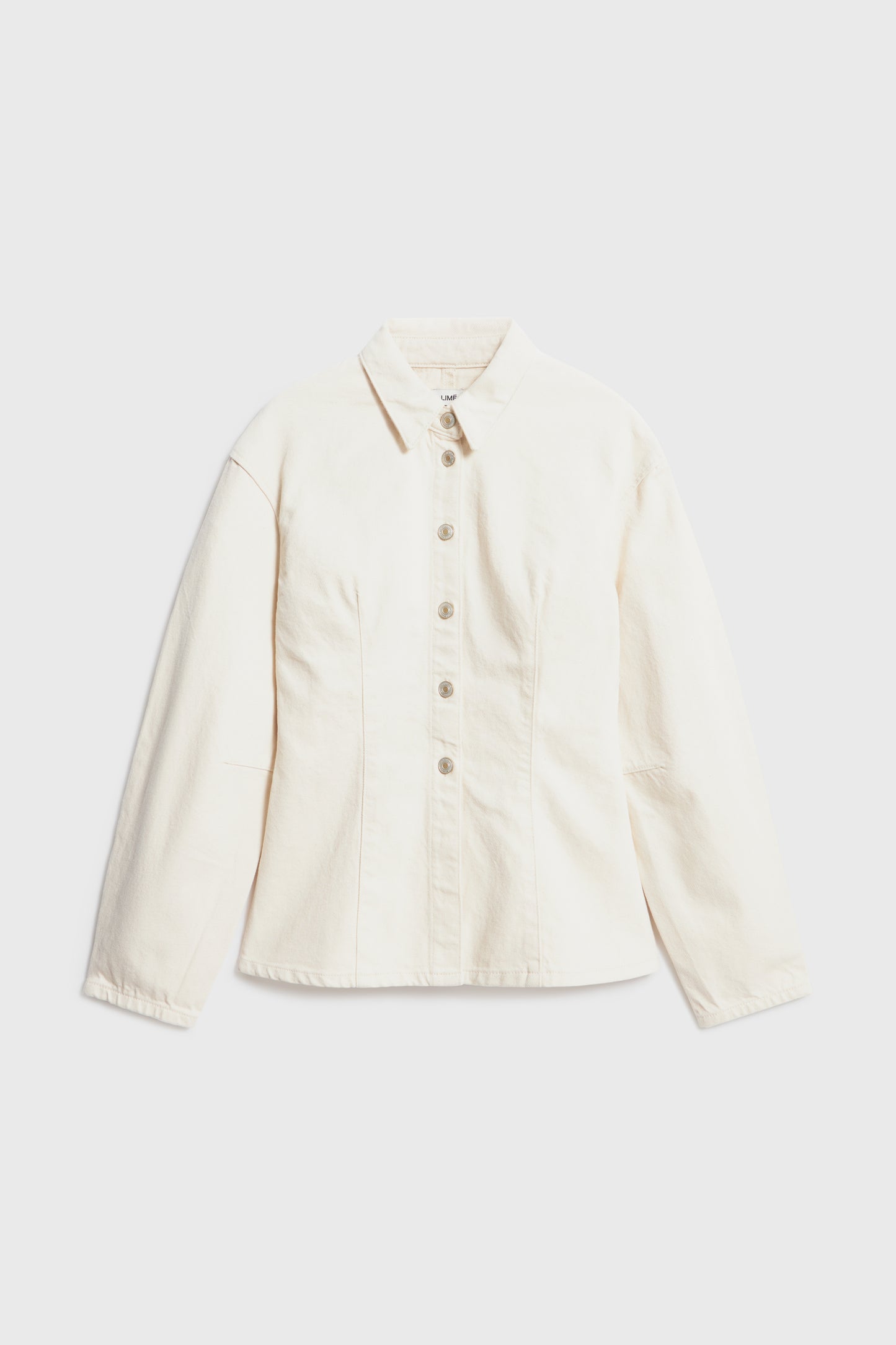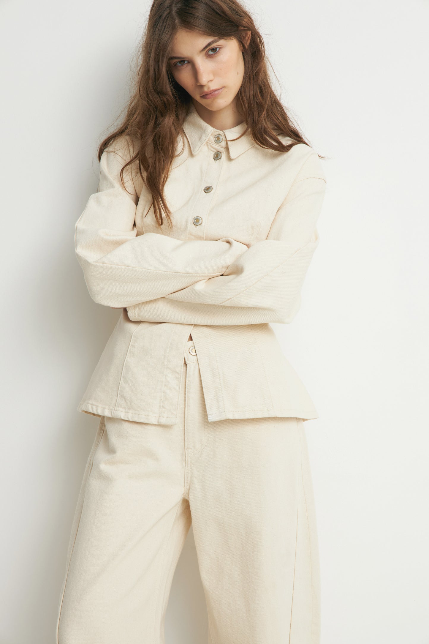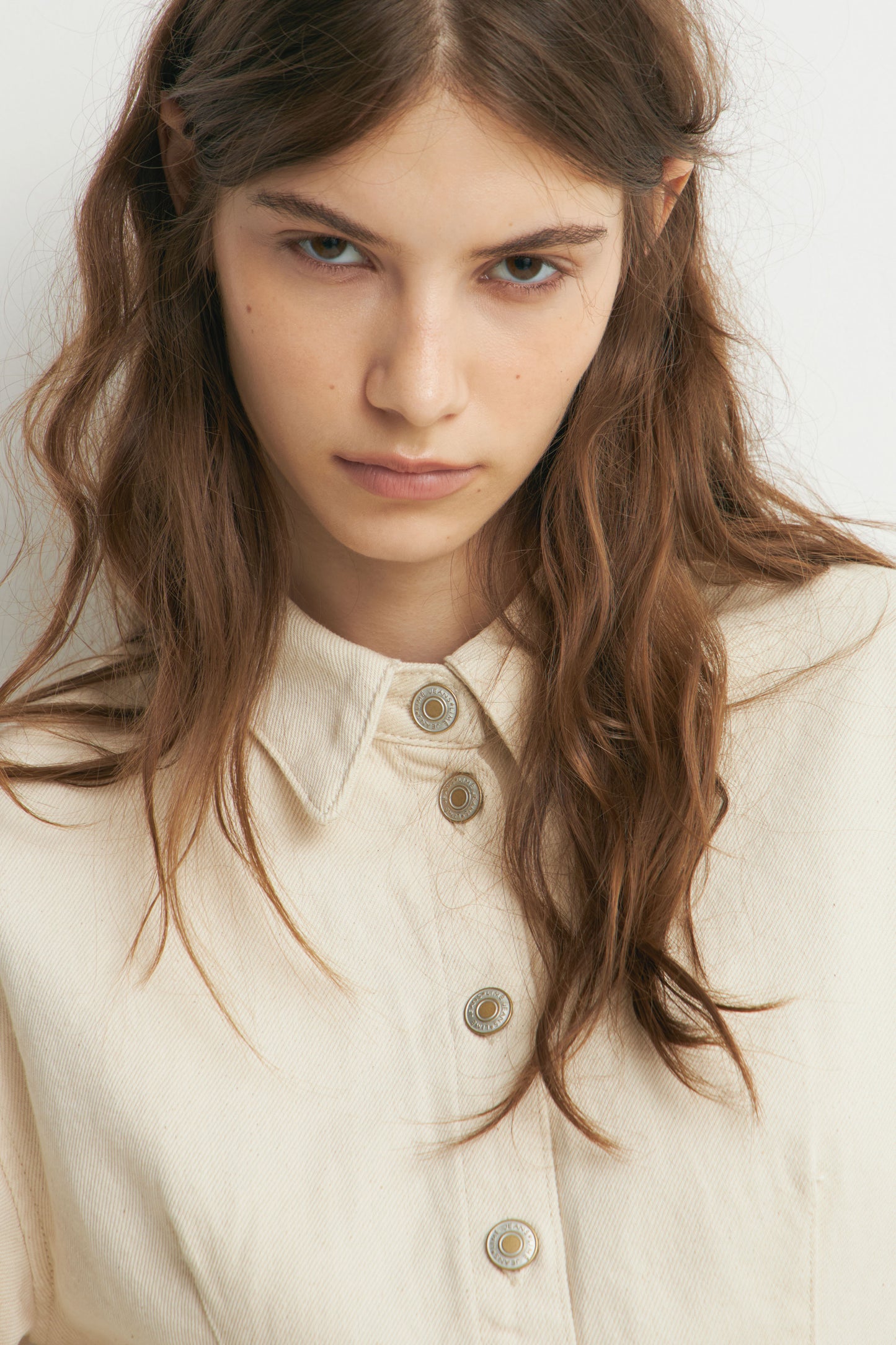 Slim-fitting shirt in supersoft cotton denim. Visible seams create a feminine silhouette. Collar, front metal buttons, and voluminous long sleeves.