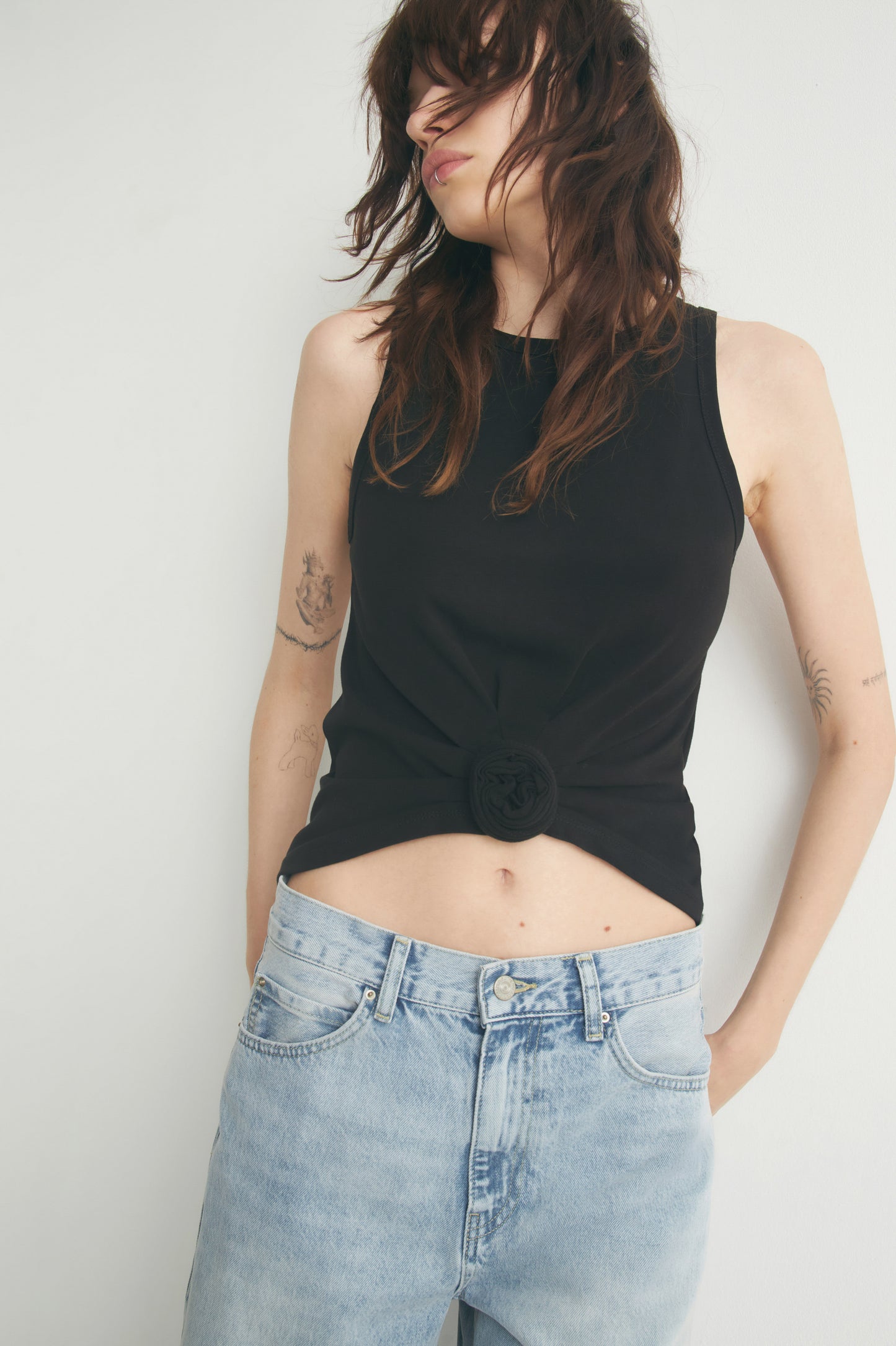 Fitted crop top in a cotton blend with gentle stretch. Gathered seams at sides for a draped effect, and a decorative tie detail at center.