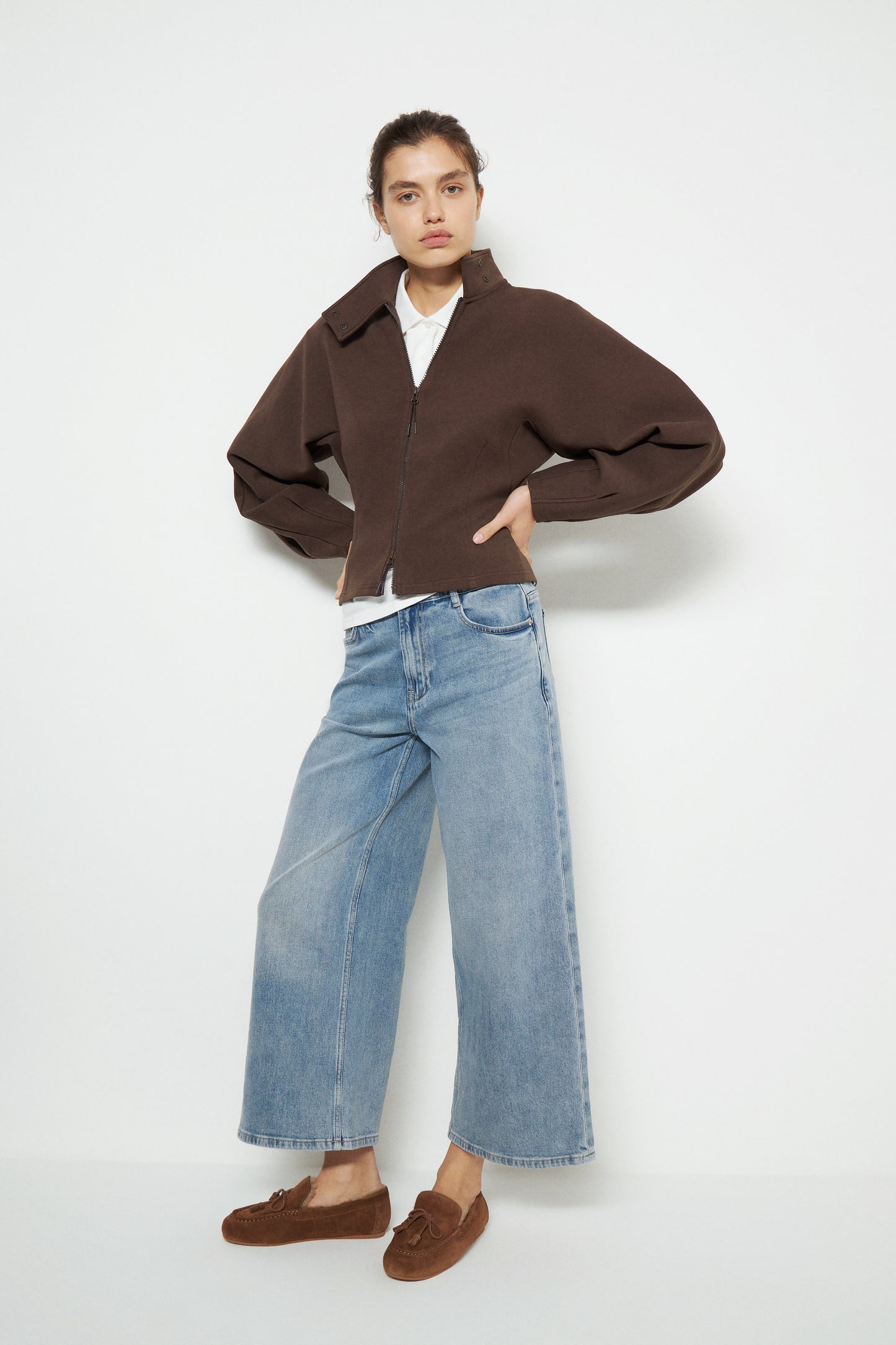 Fitted sweatshirt in heavy, stretch interlock jersey with cotton. Stand-up collar with a flap. Long puff sleeves. Pleated details. 2-way zip fastening.