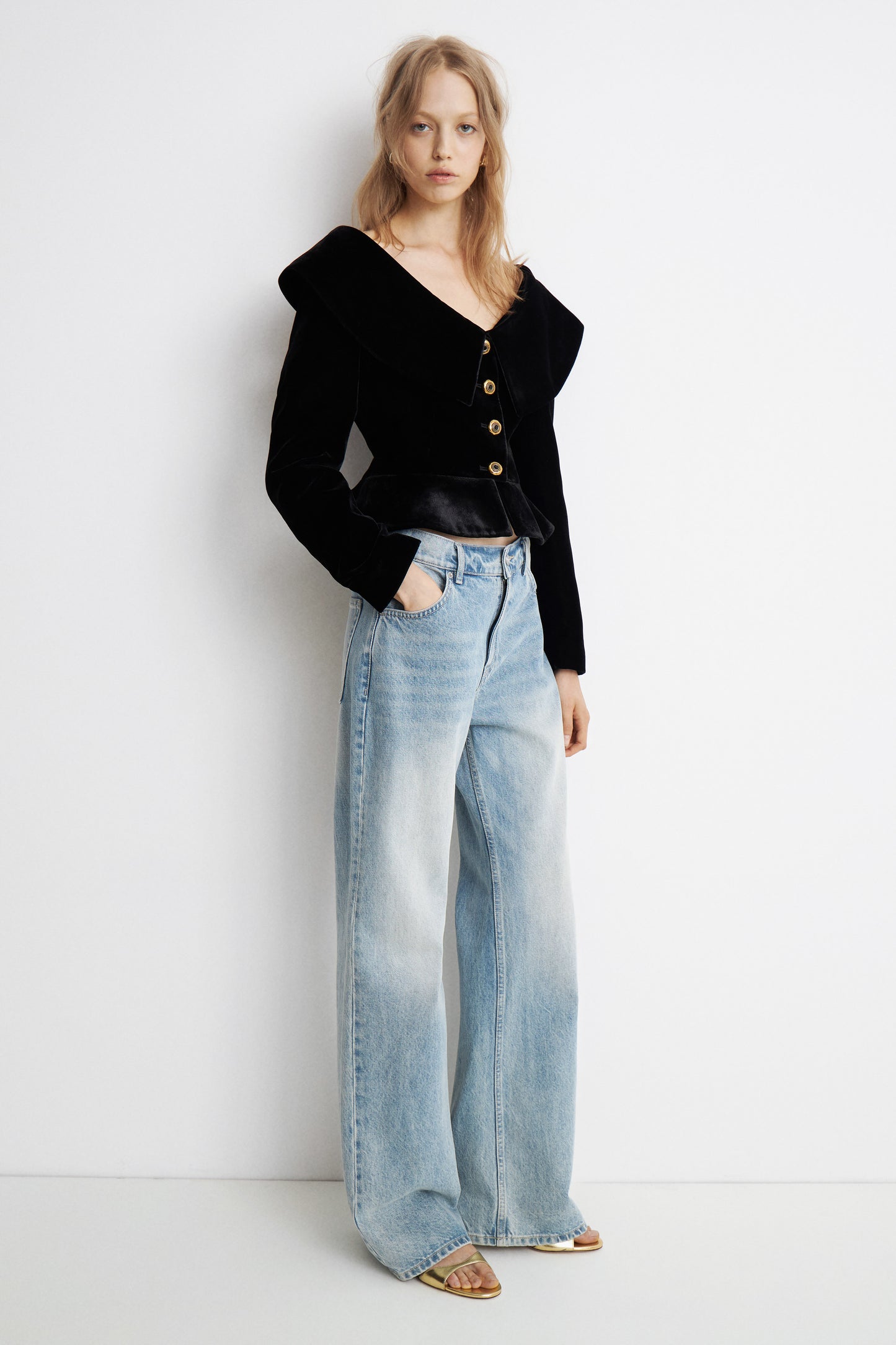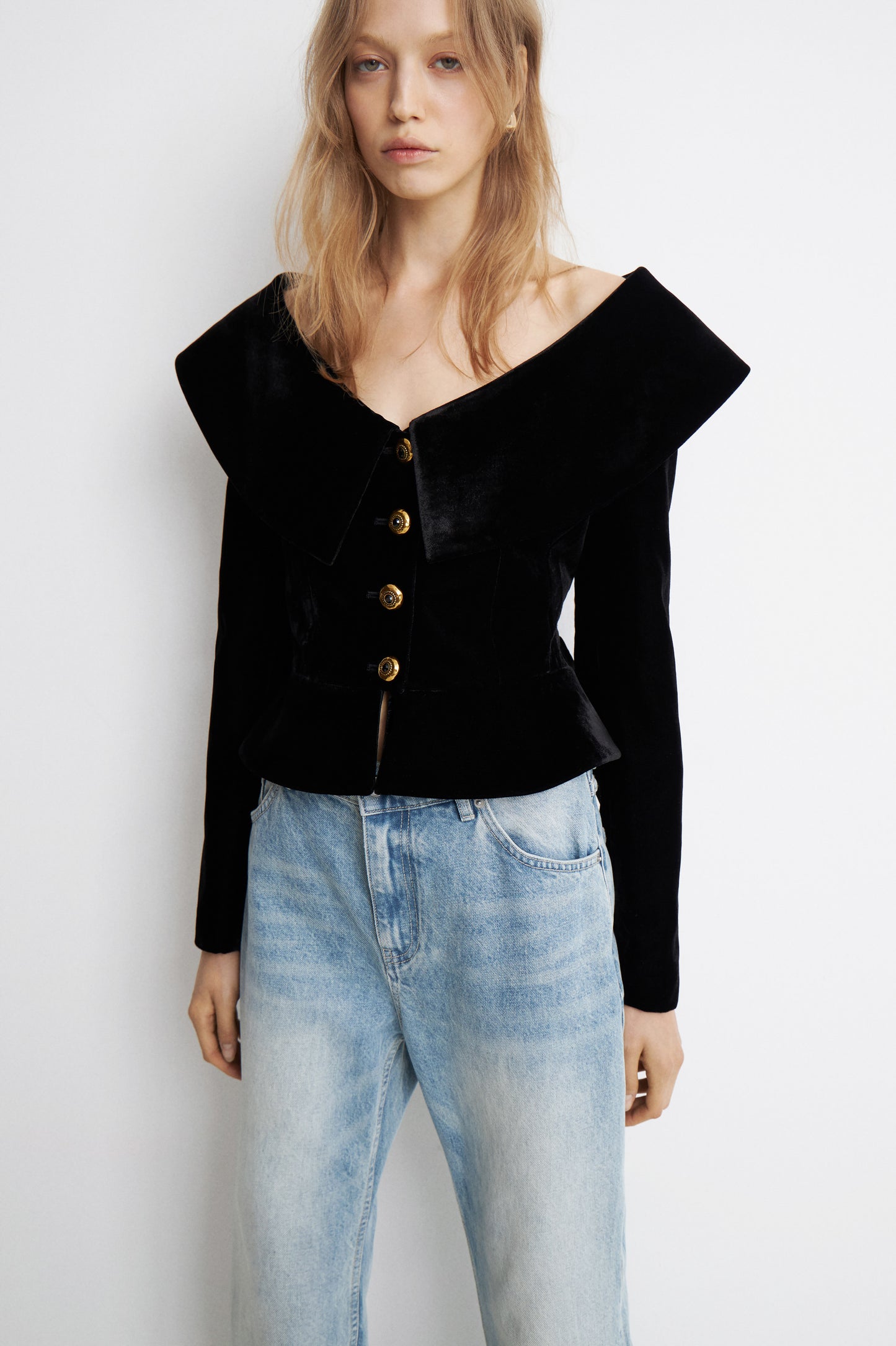 Fitted blazer with foldover top edge and a single-breasted front with buttons. Shaping darts on the front and back. Long sleeves, shoulder pads. Made of woven fabric viscose. Lined.