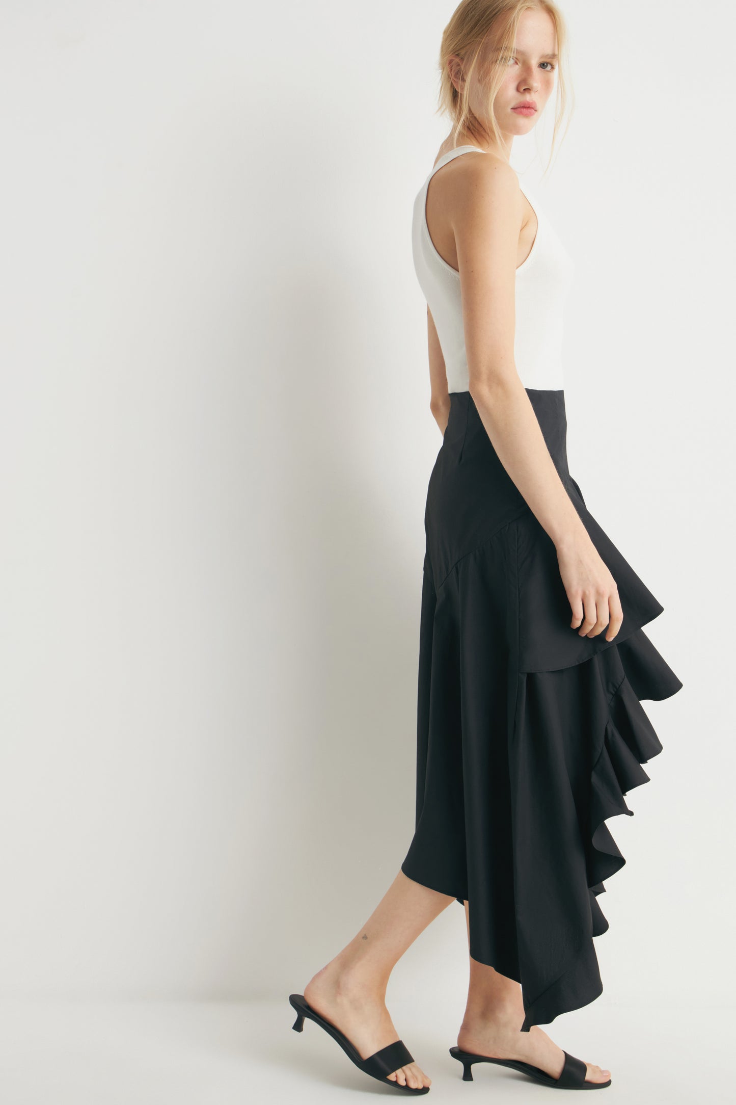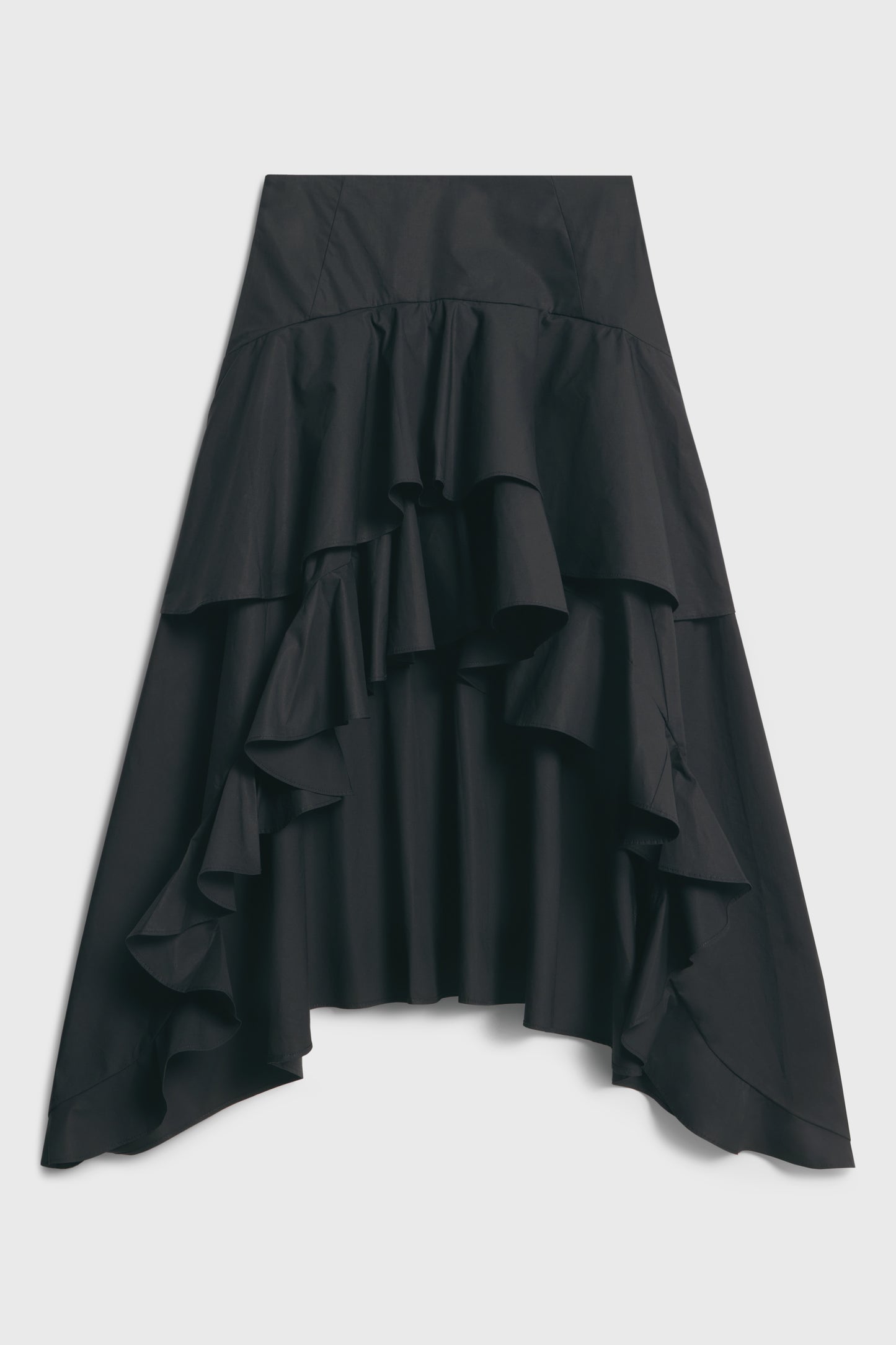 Skirt in cotton with asymmetric design combines mini and midi length – you can wear it both a cutout in front and back. Ruffles along the hem. Lined. Hidden zip closure at the side.