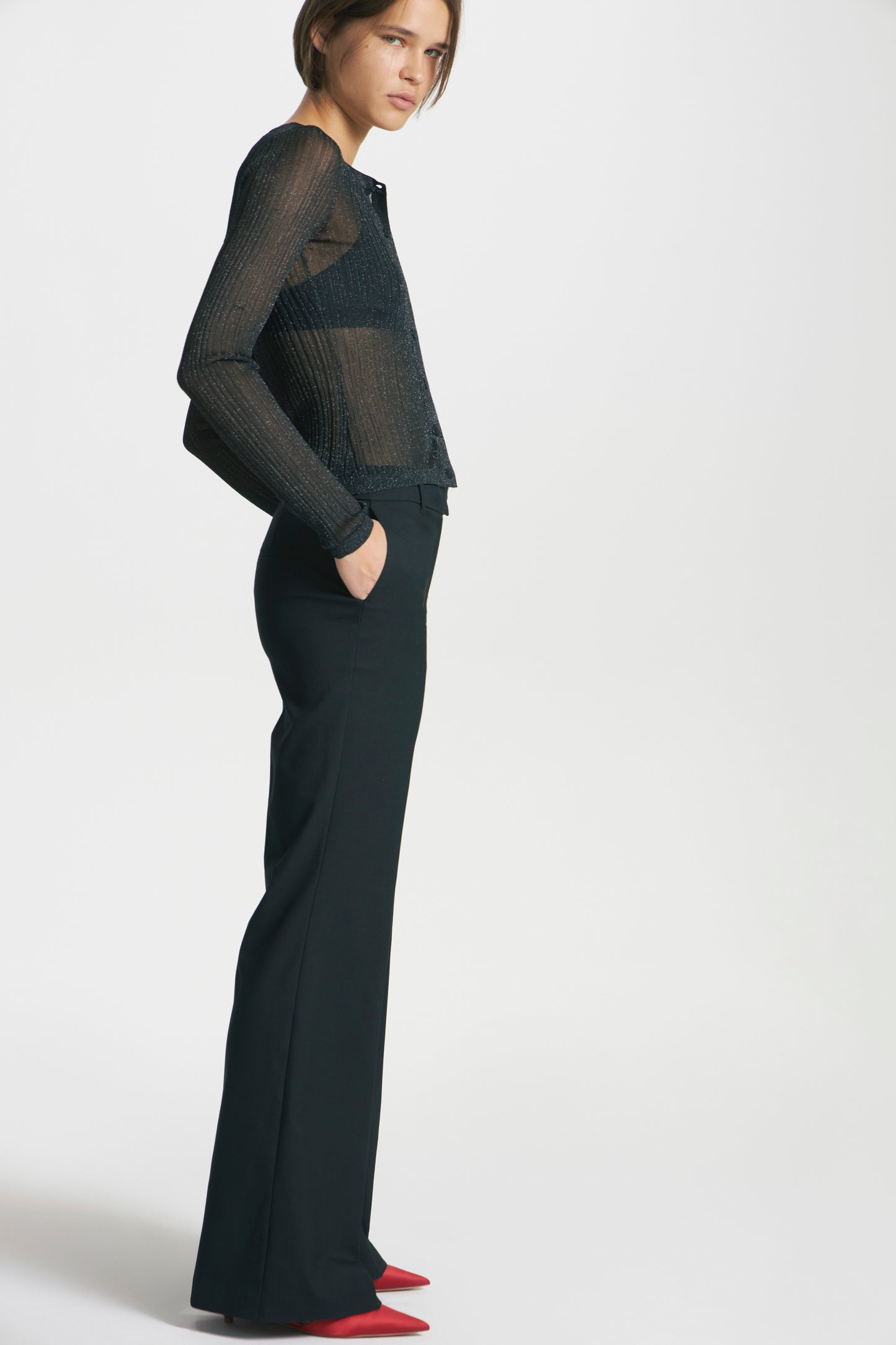 Suit trousers with creases, front pockets and false rear welt pockets. Flared hems. Front zip fly, inside button and metal hook fastening.