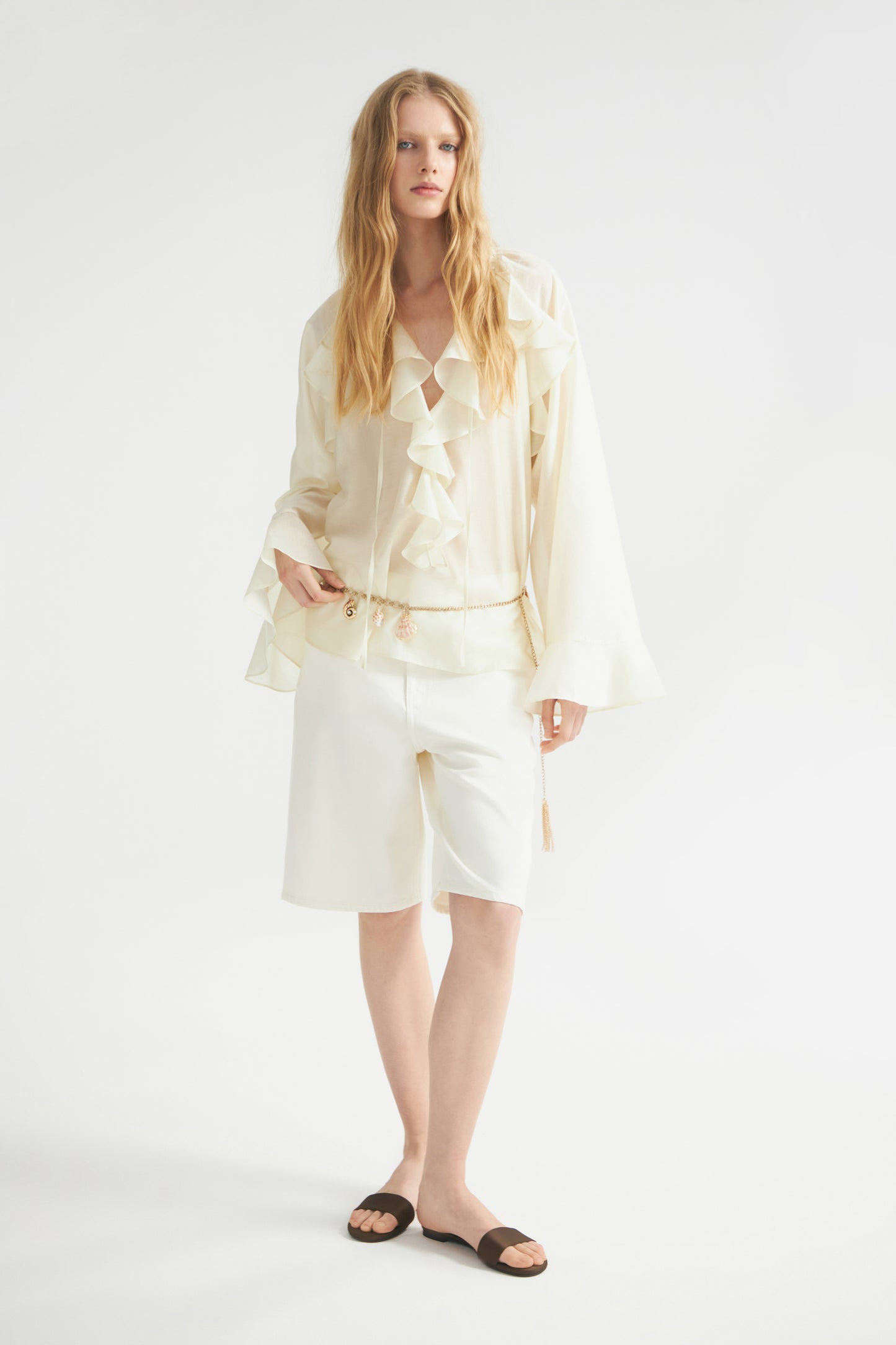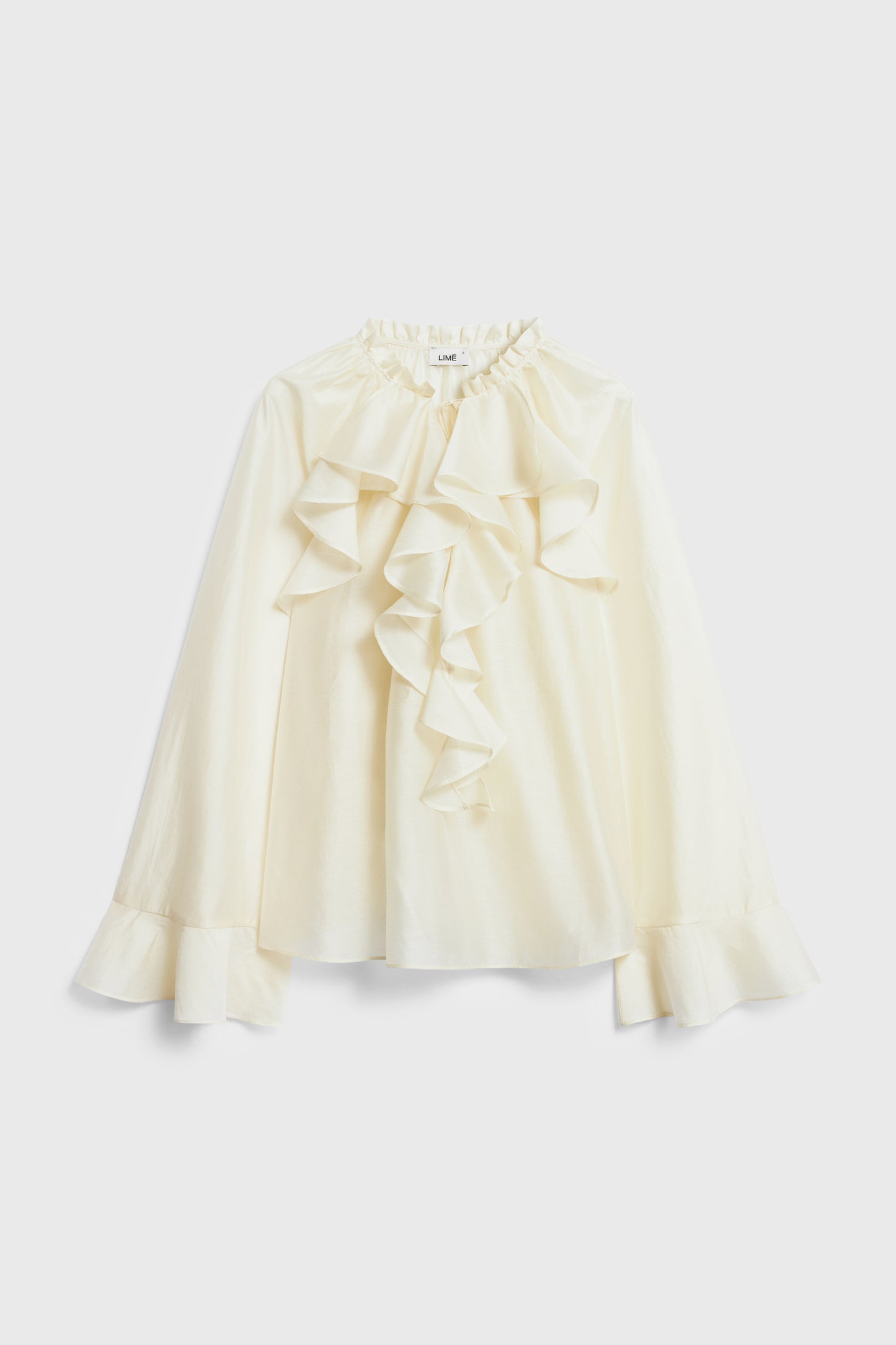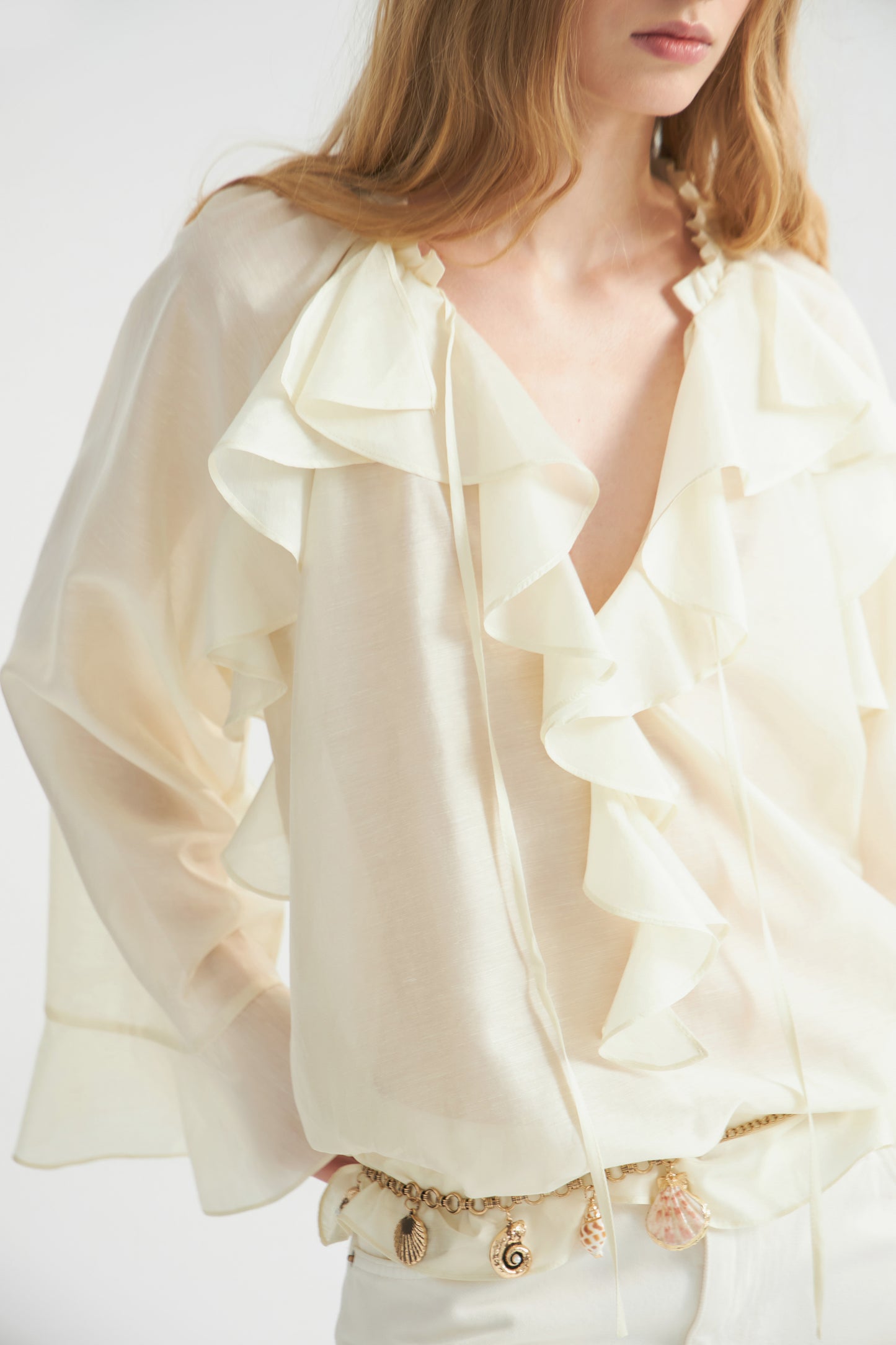 Blouse in an airy lyocell blend fabric. It features a V-neck and long sleeves. Accented by voluminous ruffles and narrow ties on the front.