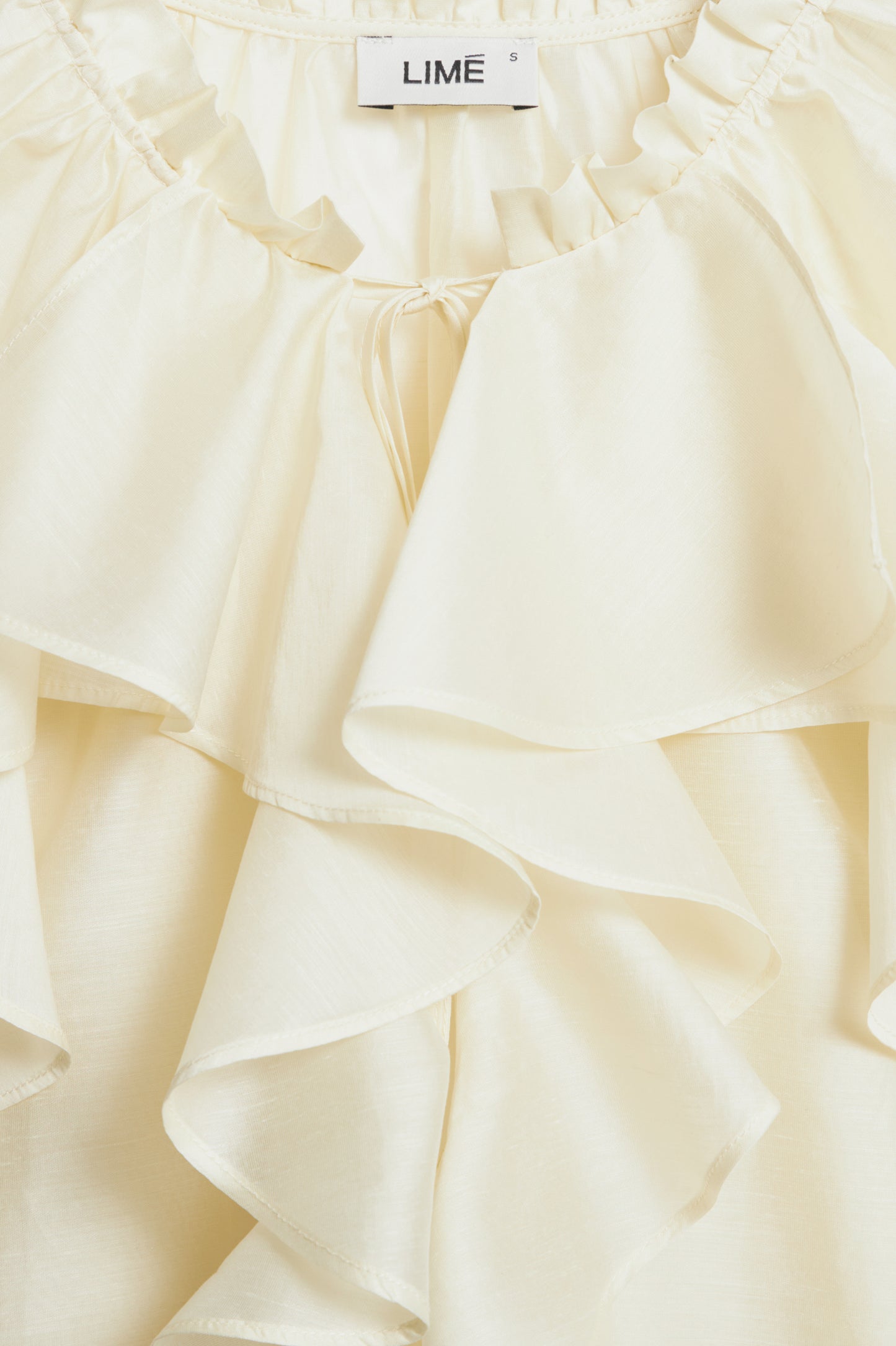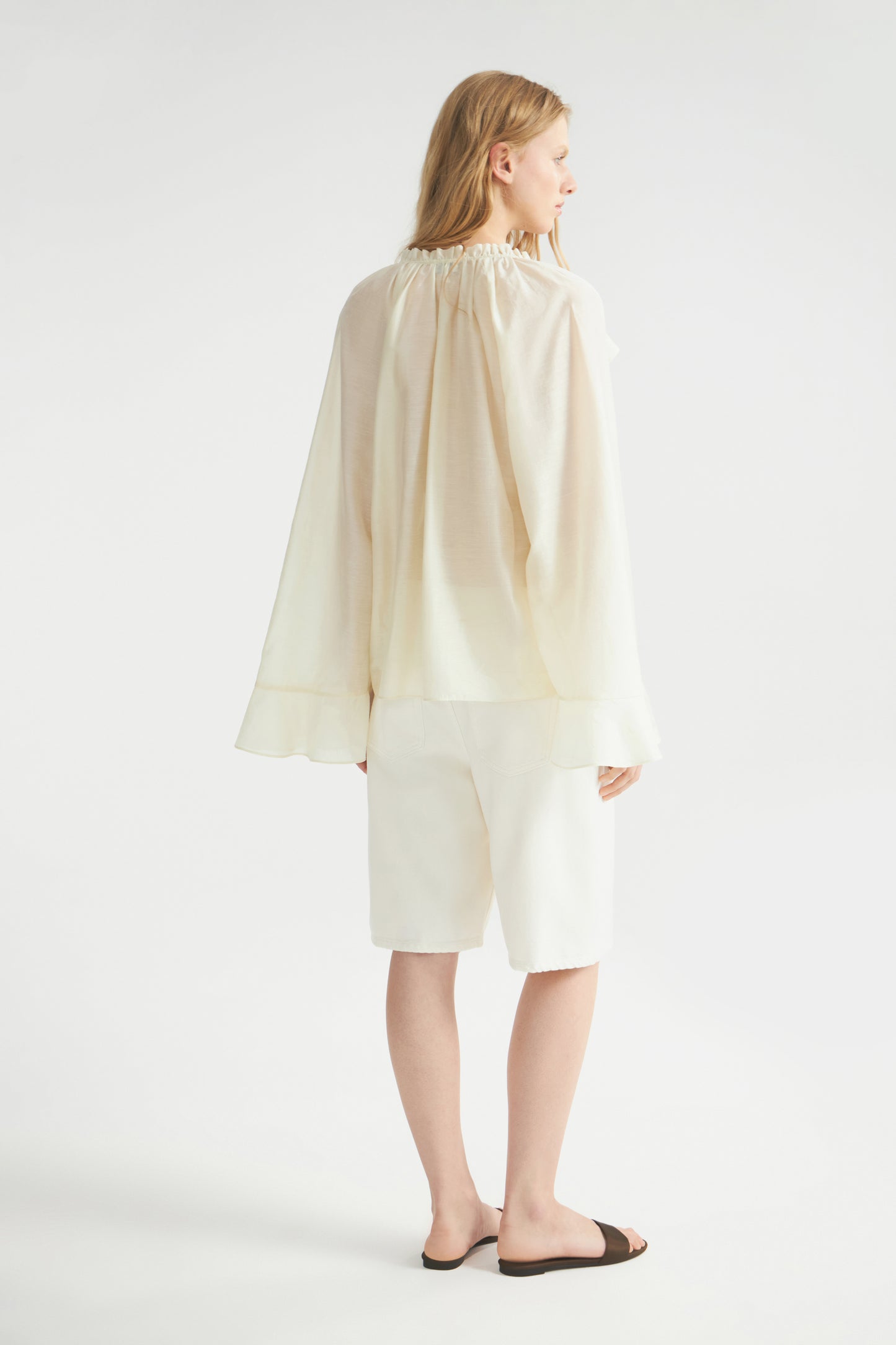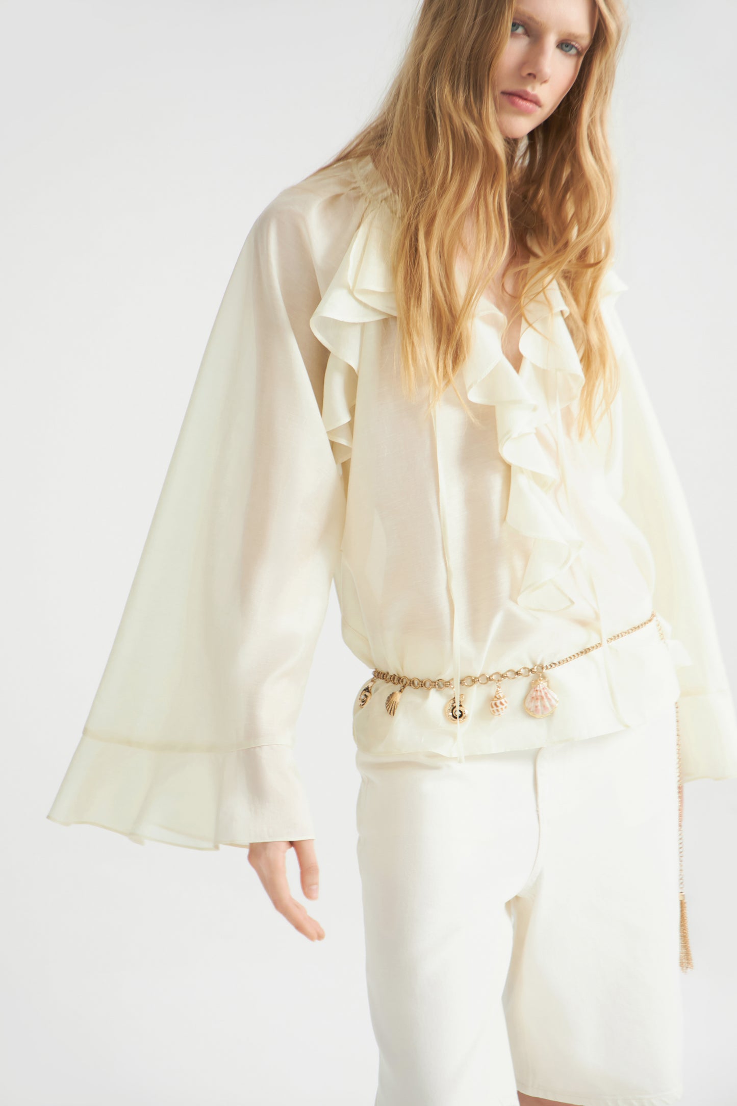 Blouse in an airy lyocell blend fabric. It features a V-neck and long sleeves. Accented by voluminous ruffles and narrow ties on the front.