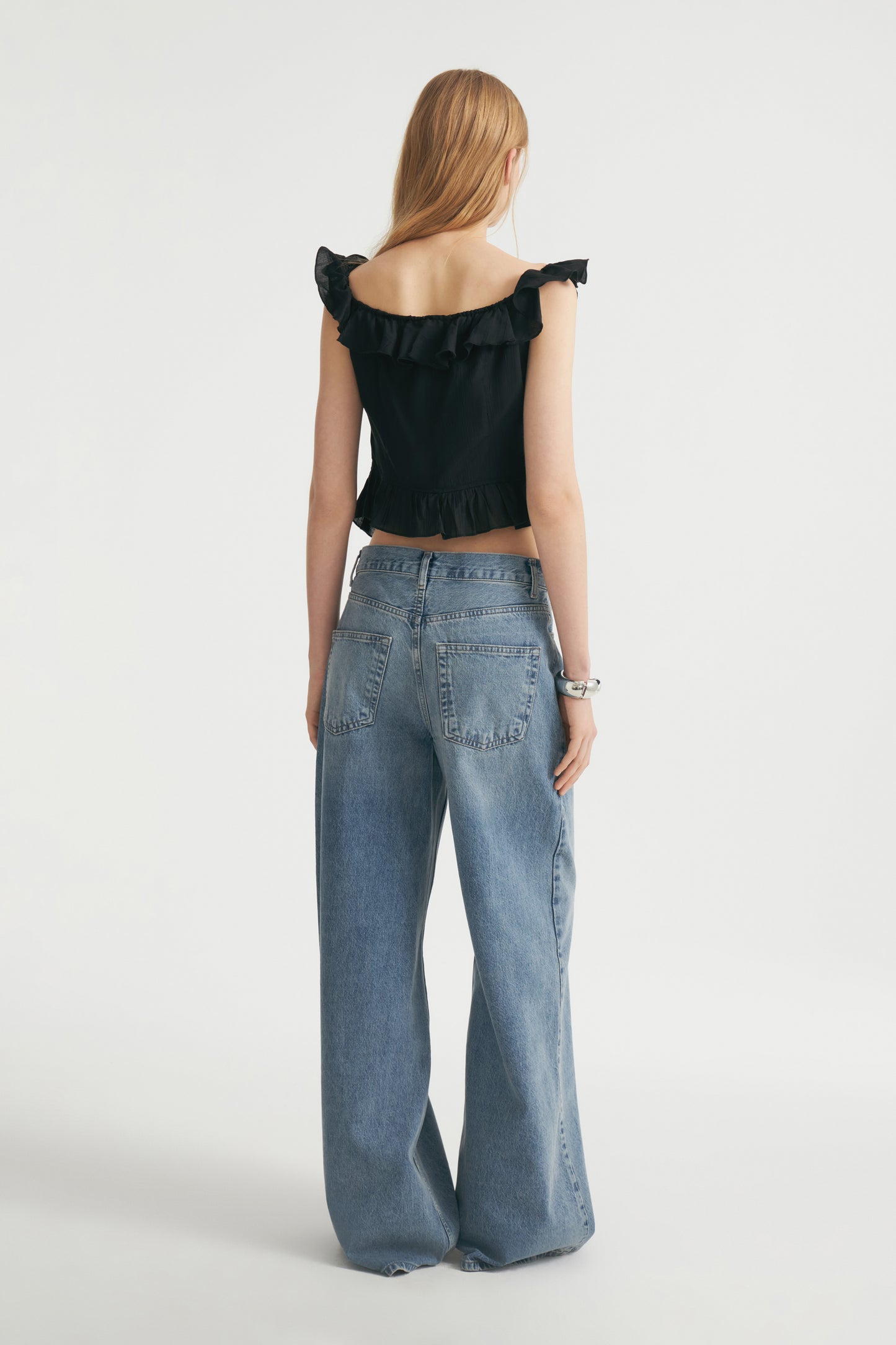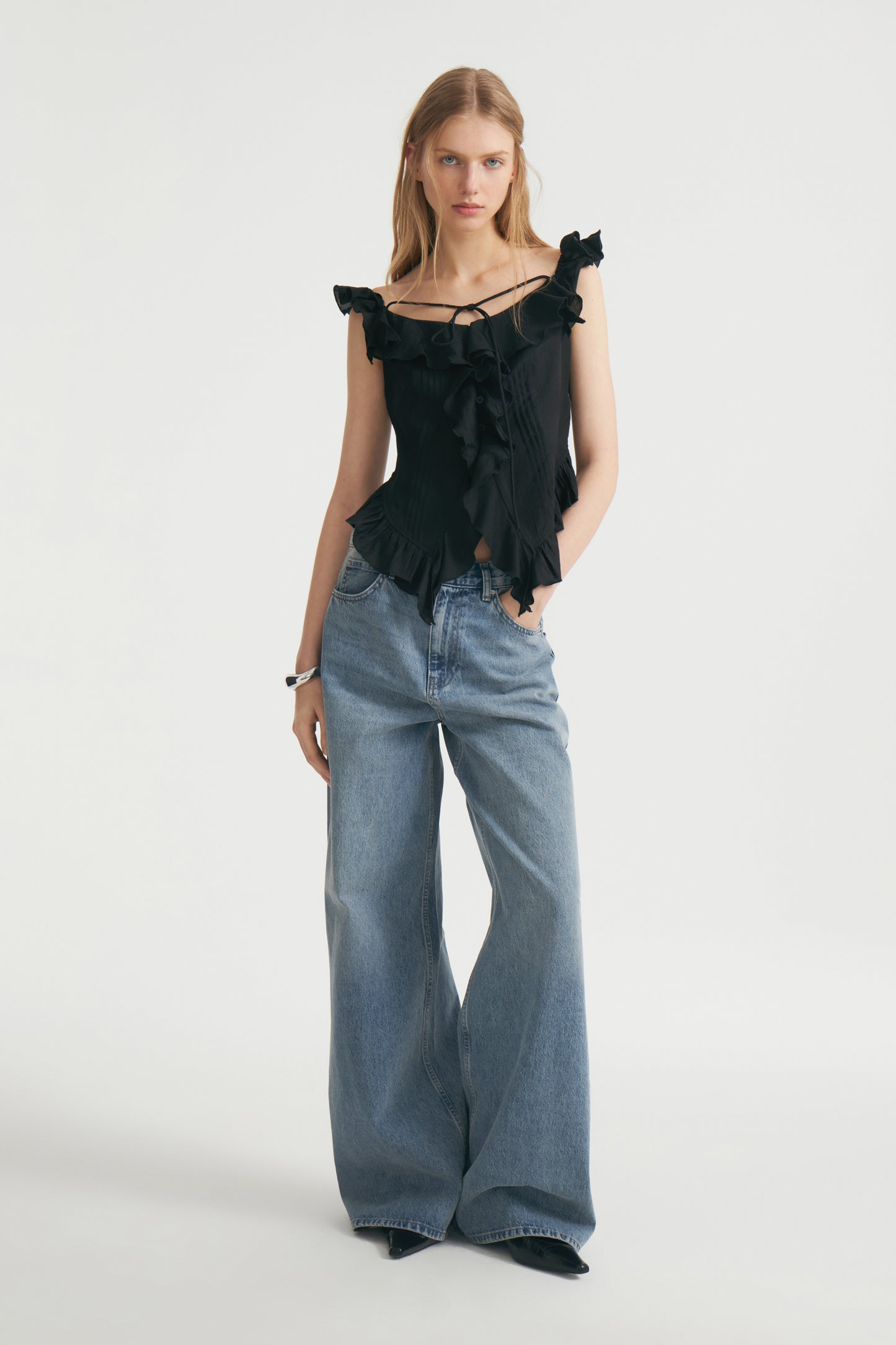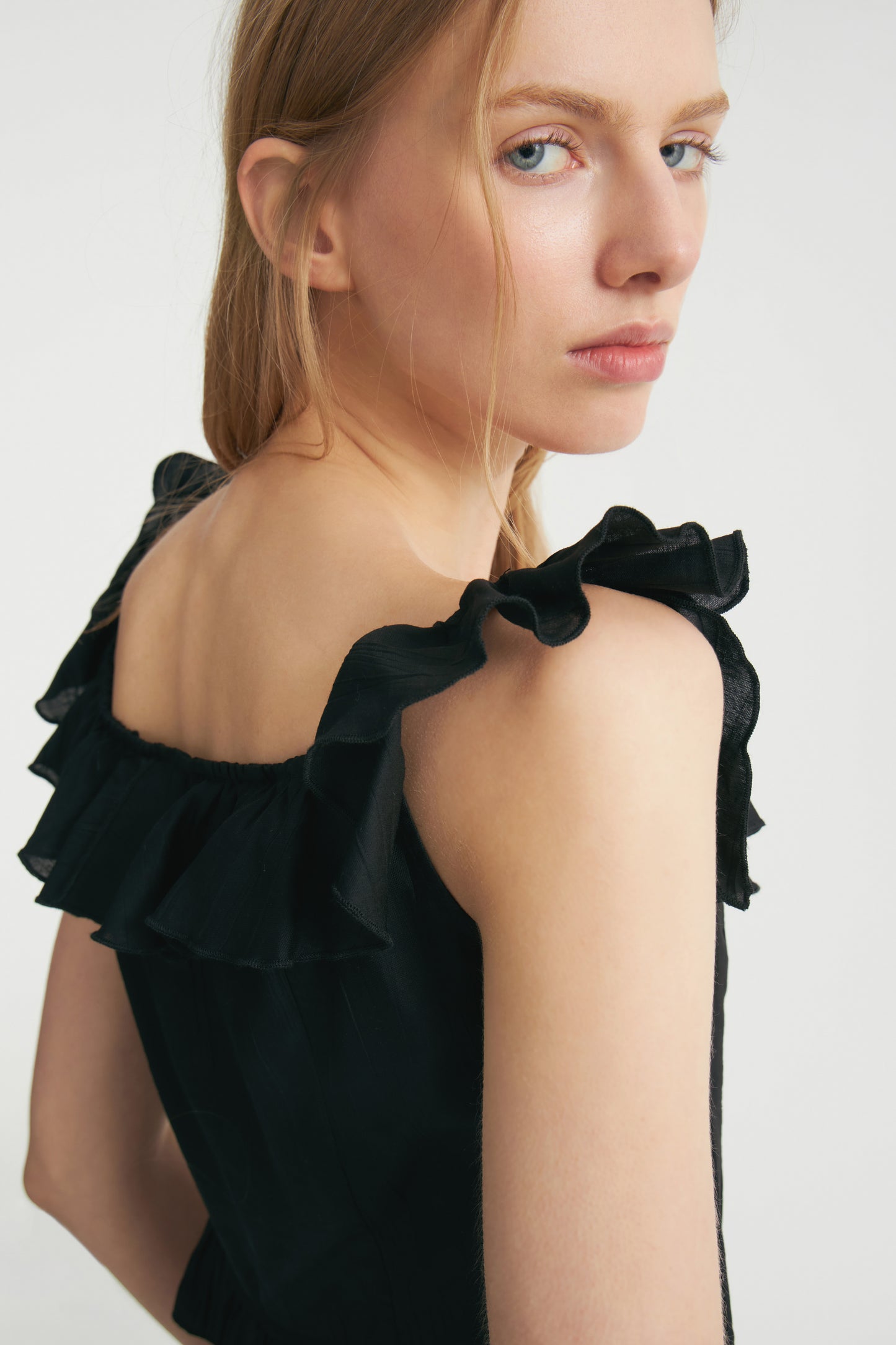 Short, fitted top in a stretch viscose weave. Sleeveless silhouette with wide frill trims and narrow elastication around the top edge. Button front closure.